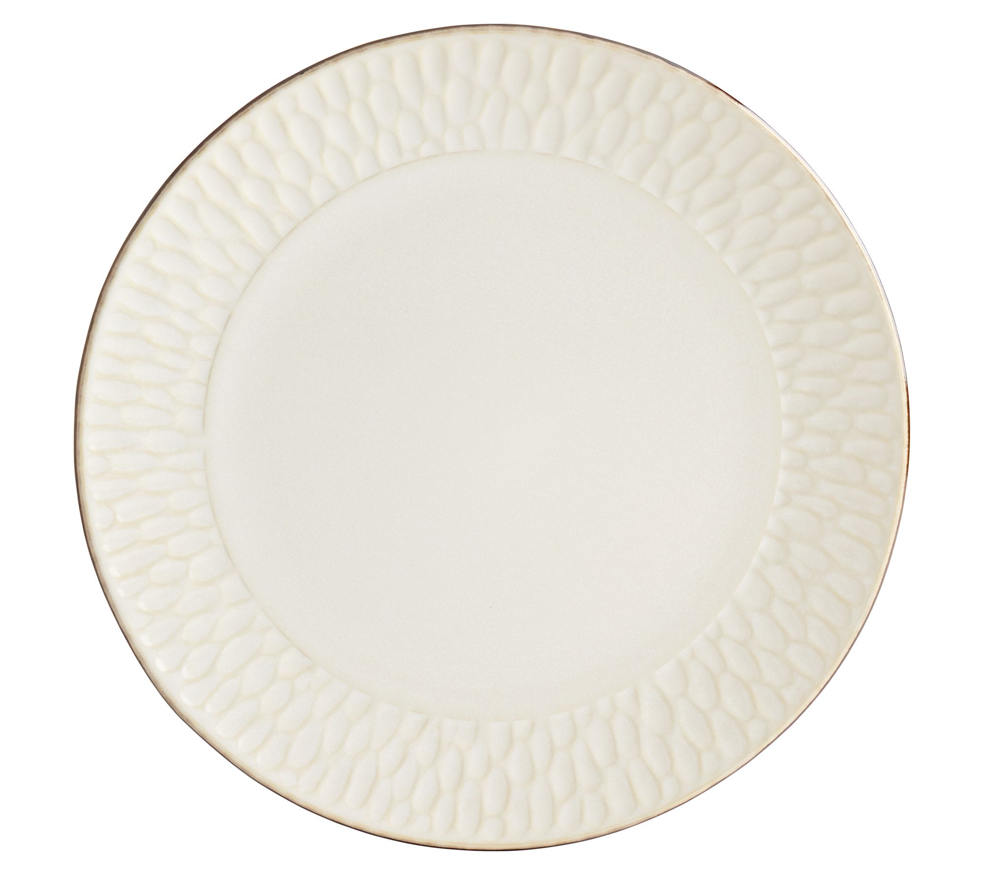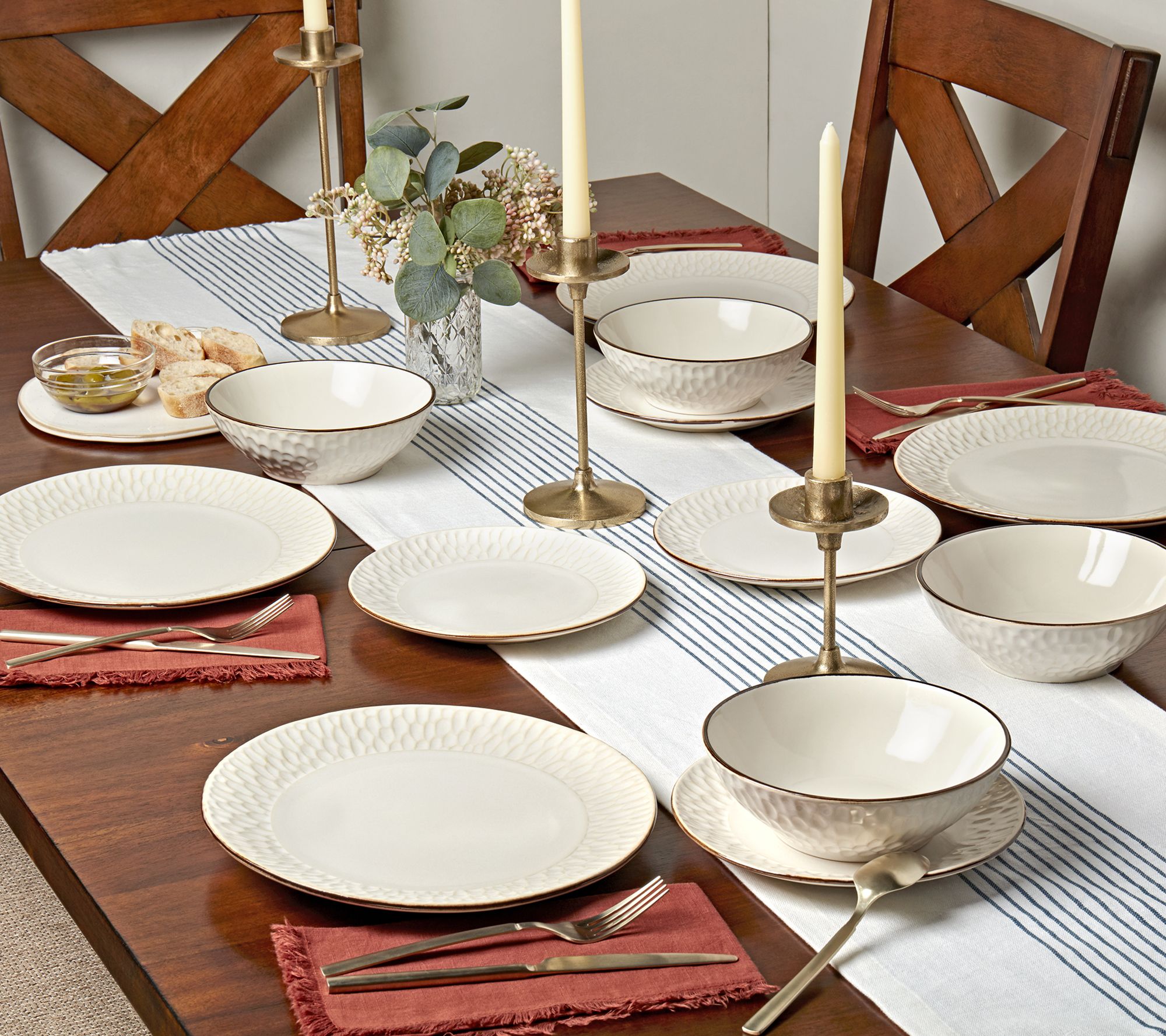 Lend elegant appeal to your table setting with these plates and bowls featuring gorgeous hammered rims with a golden-brown accent. From TTU Gallery.