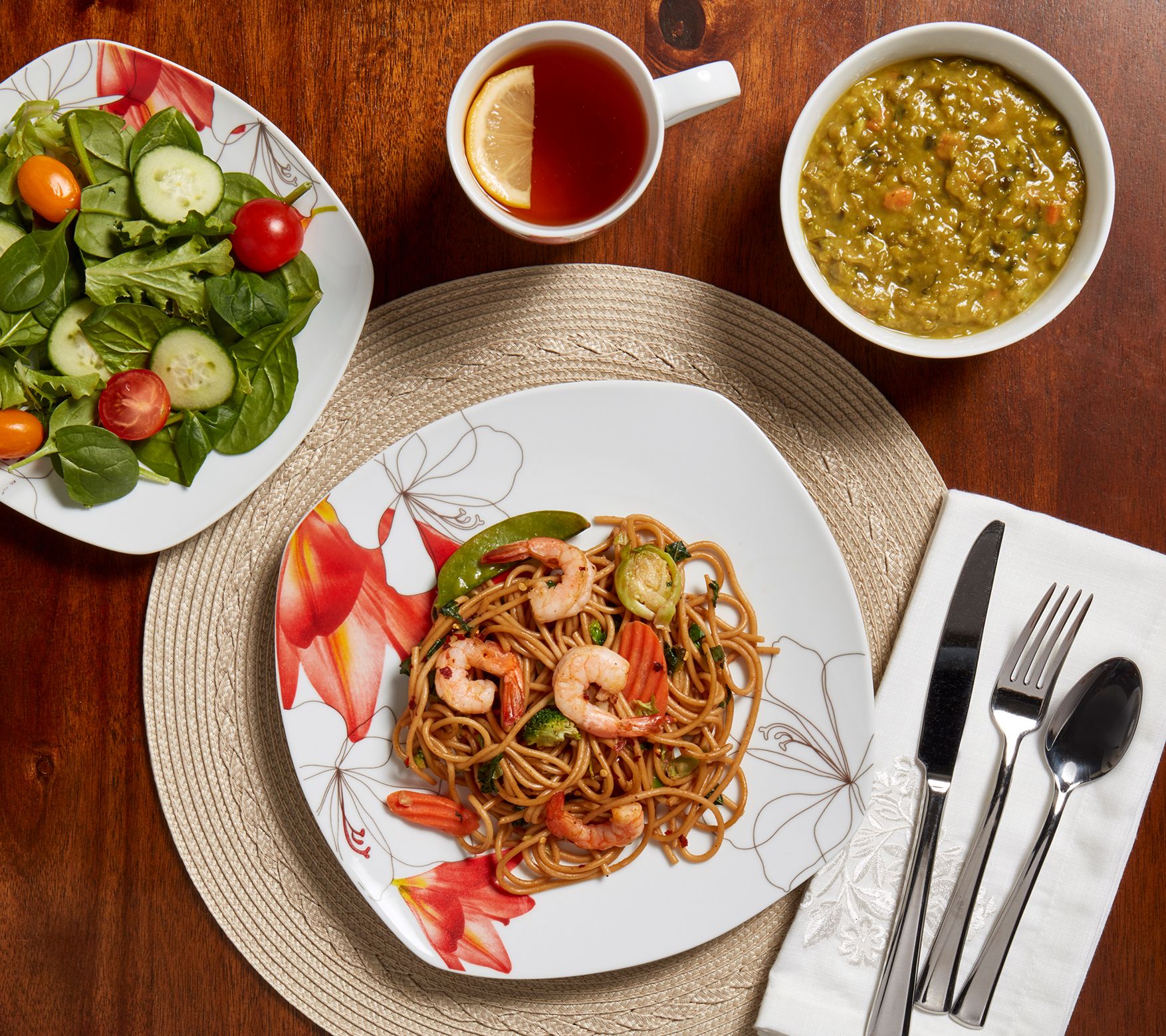 • Includes four 10.75" dinner plates, four 8.5" salad plates, four 5.5" cereal bowls, and four 12-oz mugs