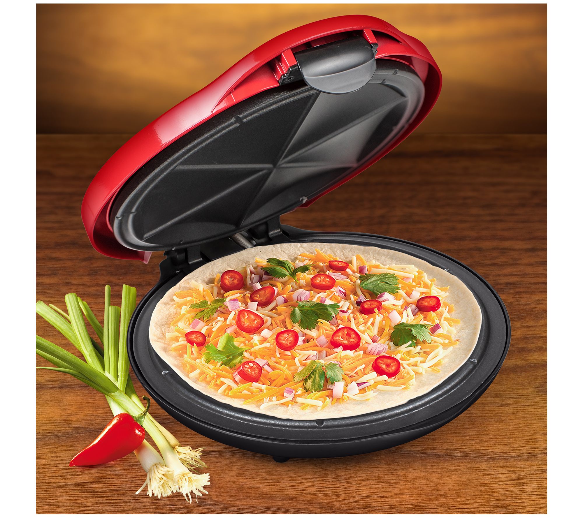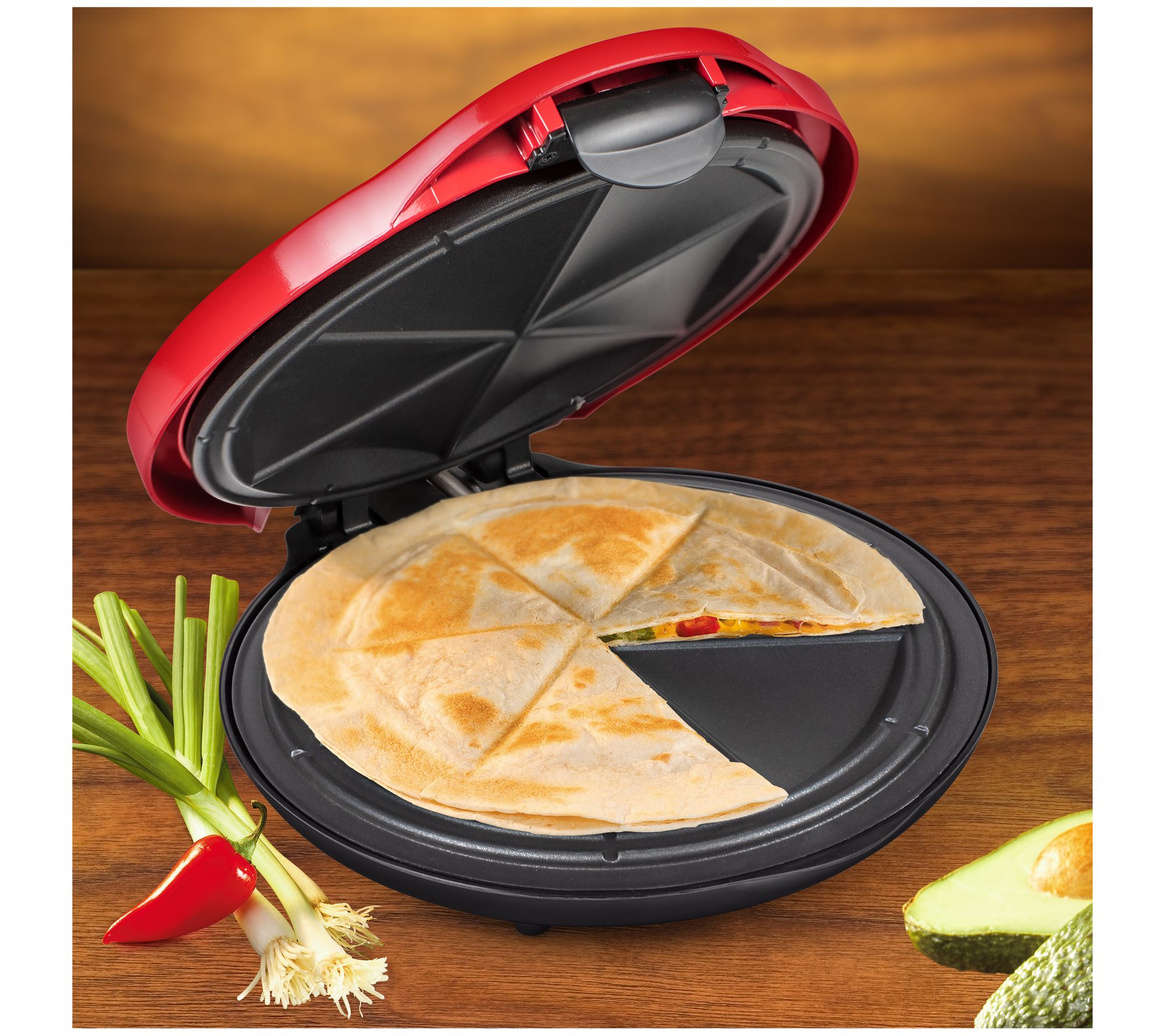 Bring the fiesta right into your kitchen when you whip up crispy, delicious quesadillas in this 10" electric quesadilla maker. The extra stuffing latch allows for more filling, while the plate design creates six wedges to help seal in that irresistible flavor. From Taco Tuesday.