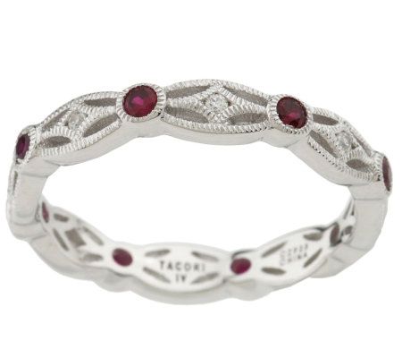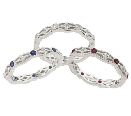 How could you possibly choose a favorite from this trio of stack rings? Each is a beauty in its own right, showcasing a star-shaped, openwork design with clear, bezel-style Diamonique(R) simulated diamonds. One of the rings is alight with Diamonique simulated rubies, while another radiates with Diamonique simulated sapphires. From Tacori IV--Diamonique Jewelry.