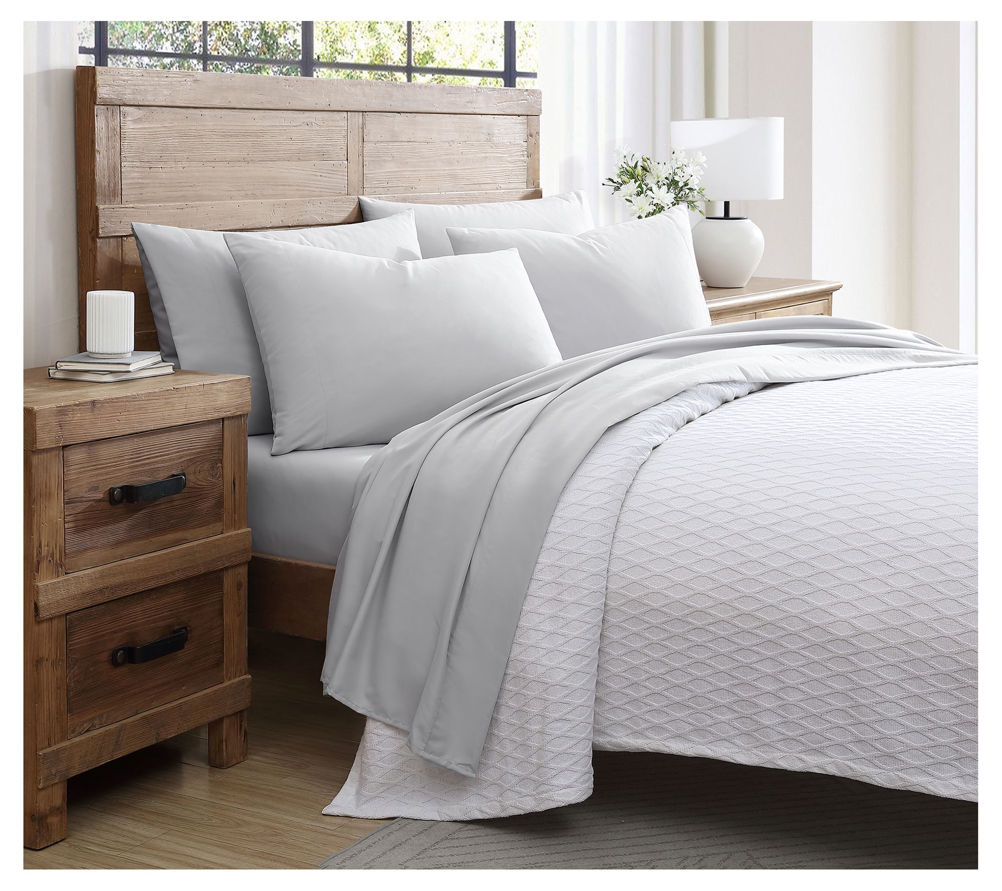 Transform your bedroom into a sanctuary of comfort with this six-piece solid microfiber sheet set. Soft brushed fabric and a timeless design make these sheets a wonderful addition to any King-sized bed. Easy to care for and designed for durability, they'll keep you cozy every night. From Tahari Home.