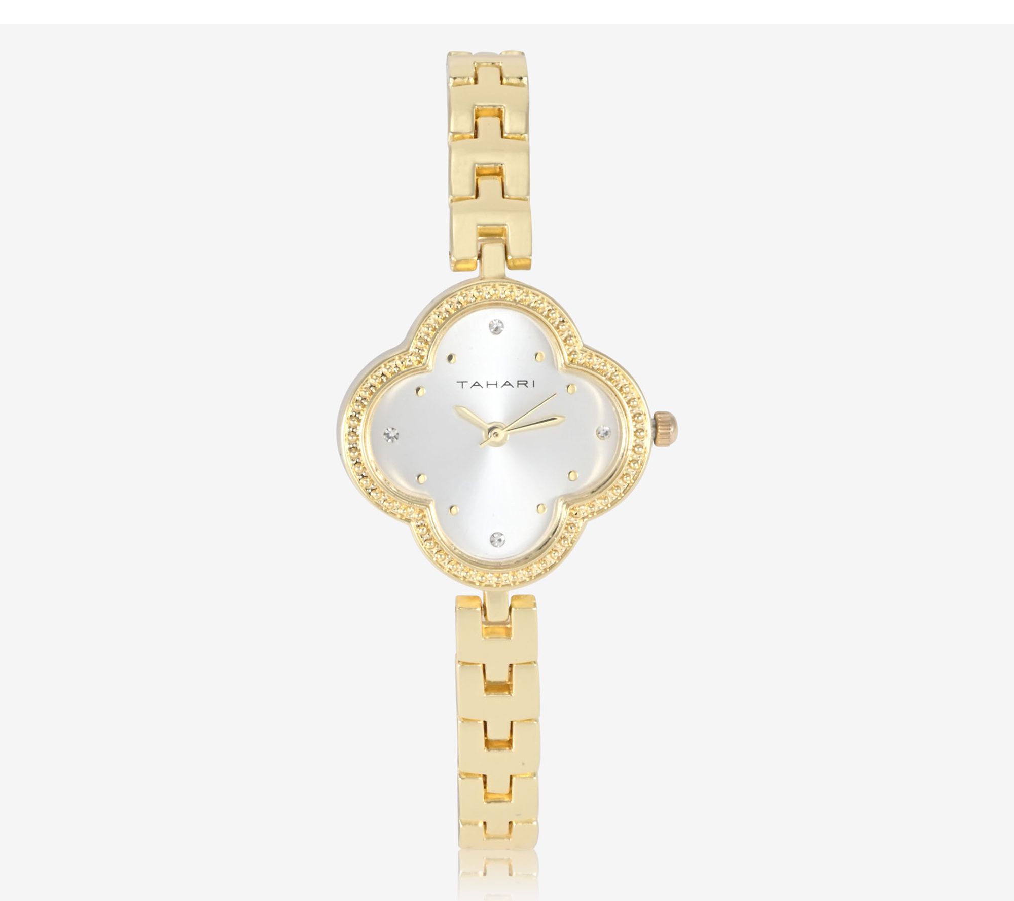 • Watch: rounded case with round crystal accents; band bracelet with clasp closure