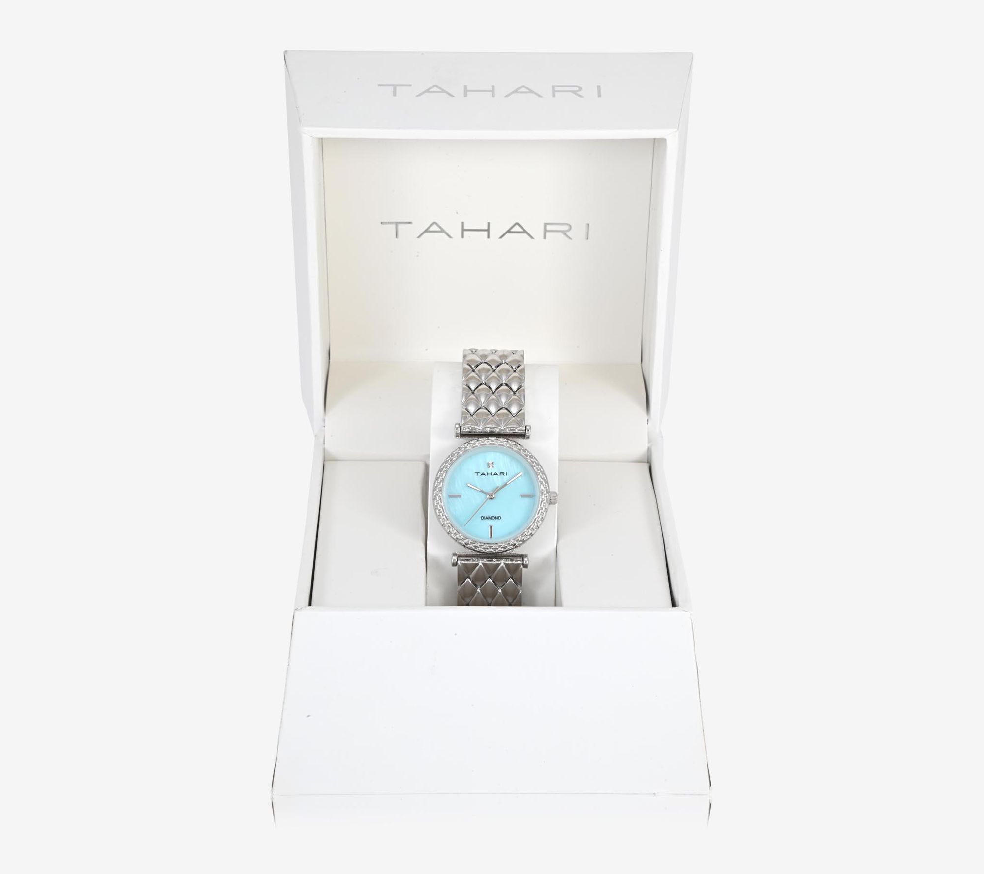 From powering through busy workdays to adding glamour for evening plans, this women's watch is a polished silvertone accessory that makes every minute feel special. The blue dial sparkles with a diamond accent, while its classic round case and matching bracelet keep your look sophisticated, whether at the office or out with friends. From Tahari.