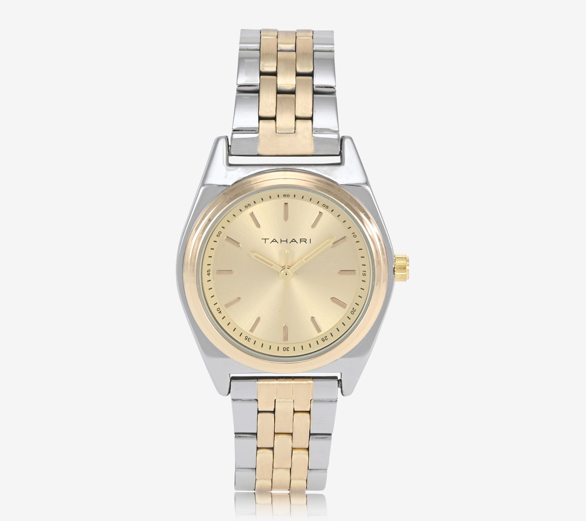 Add shimmer to your wrist with this women's watch that features a chic two-tone goldtone dial, blending seamlessly with both silver and gold jewelry for effortless styling. The sleek round case and elegant bracelet bring polished sophistication to every look, ideal for workdays, weekends, and special occasions alike. From Tahari.