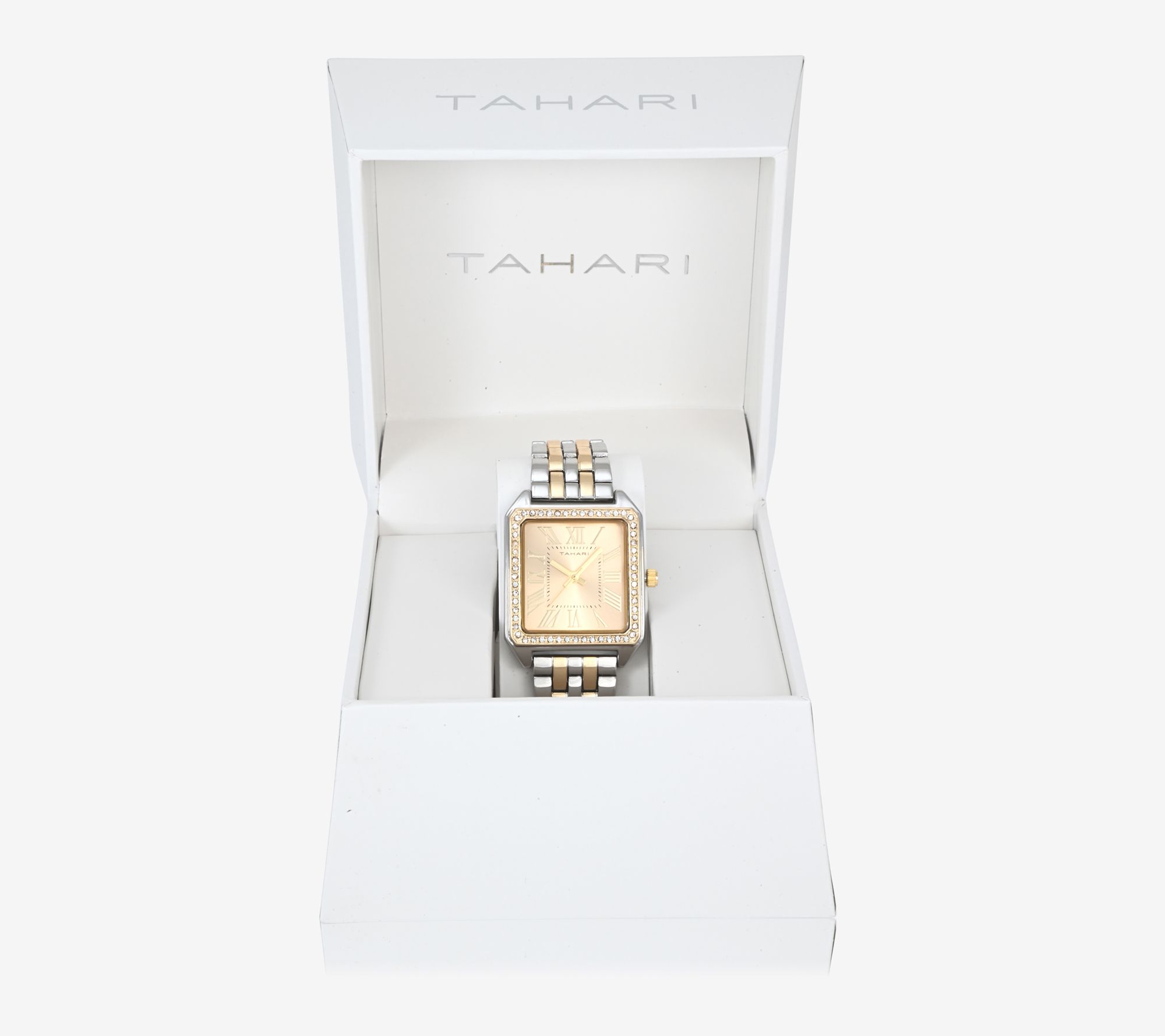 Polished goldtone and silvertone accents give this women's rectangle watch by Tahari a chic yet classic vibe, perfect for those moments when you want your look to feel extra sophisticated. Its sleek analog dial and easy fold-over clasp make it a stylish, effortless companion at work, brunch, or an evening out. From Tahari.