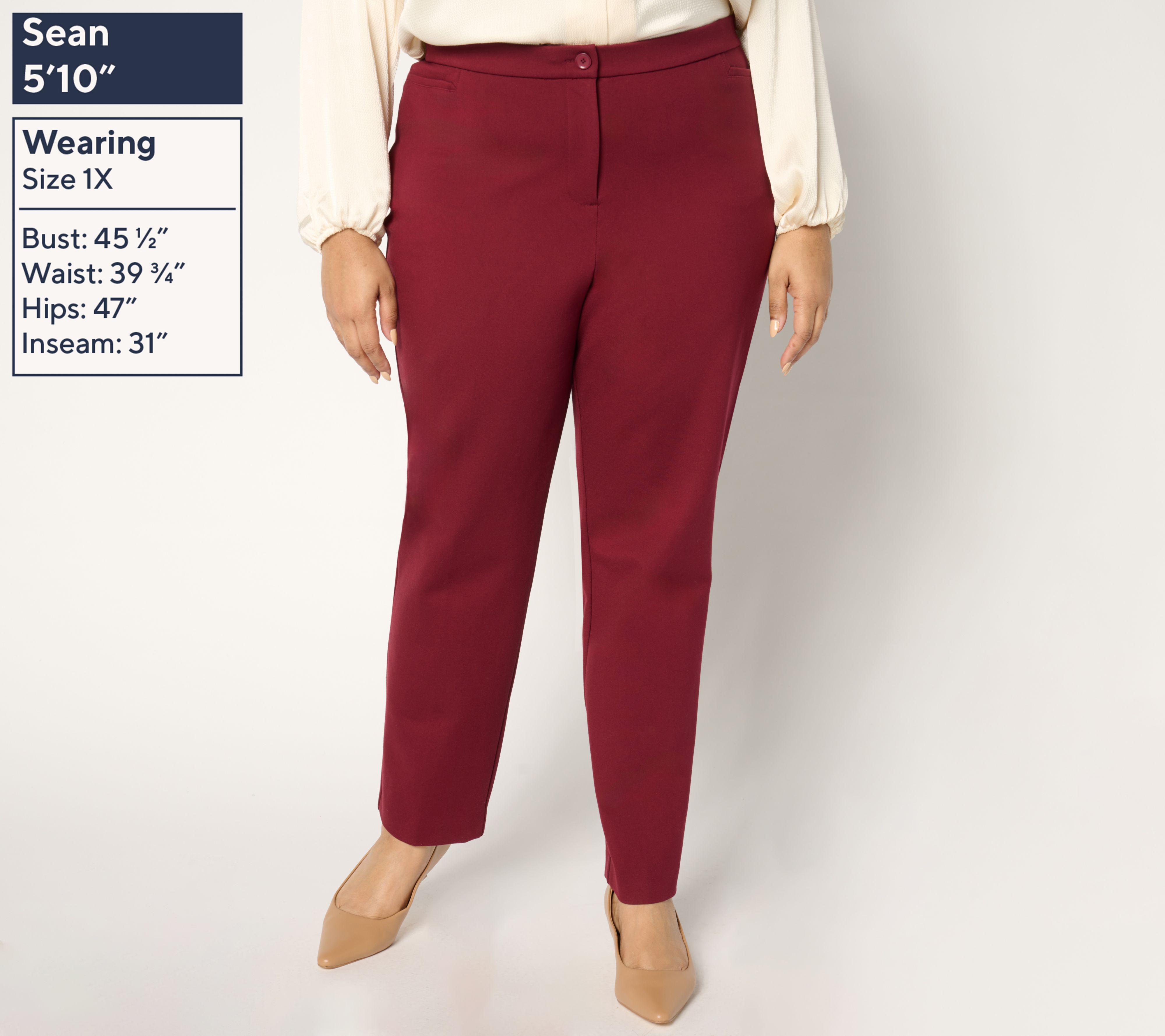 Smart Ponte -- a structured and smooth weighted knit with stretch and recovery -- makes the cut no matter what. So there's no morning guesswork if it'll vibe with the moment (or mirror). And because they're ultra comfortable, these versatile pants moonlight in your active social life, whether hosting or toasting. A splash of sauce or Sauvignon won't hurt them -- they're machine washable! From Susan Graver.