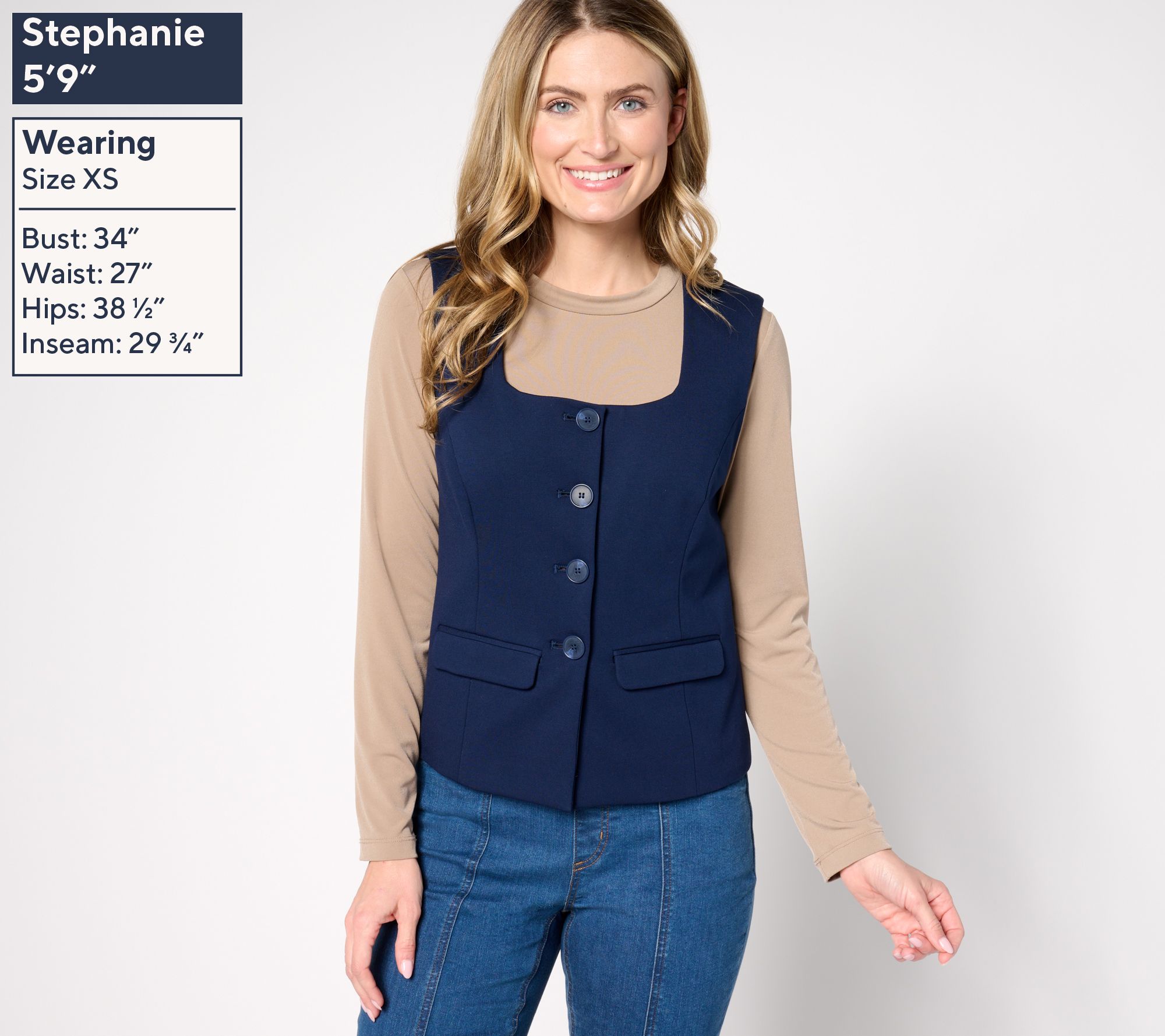 Well, aren't you right on trend? This vest is beautifully fashioned with a square neckline and front pockets with flaps, making it an ideal choice when worn over a tee, blouse, or left to stand alone. From Susan Graver.