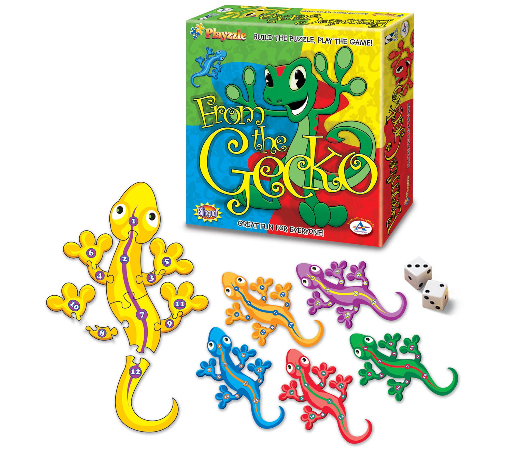 • Includes six primary-colored 12-piece playzzle gecko game boards, numbered stickers in English/Spanish/Italian/Chinese, and two playing dice