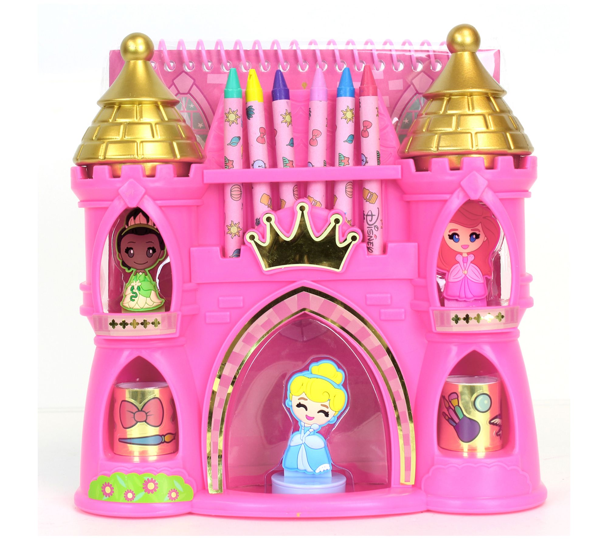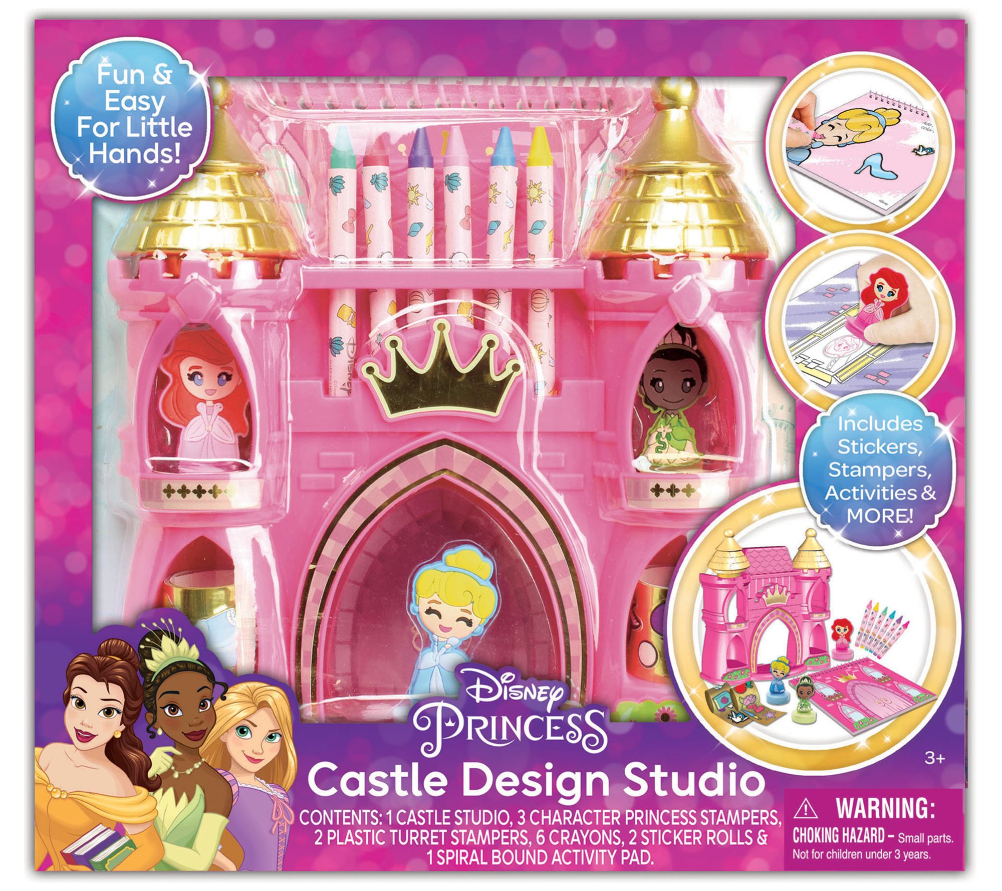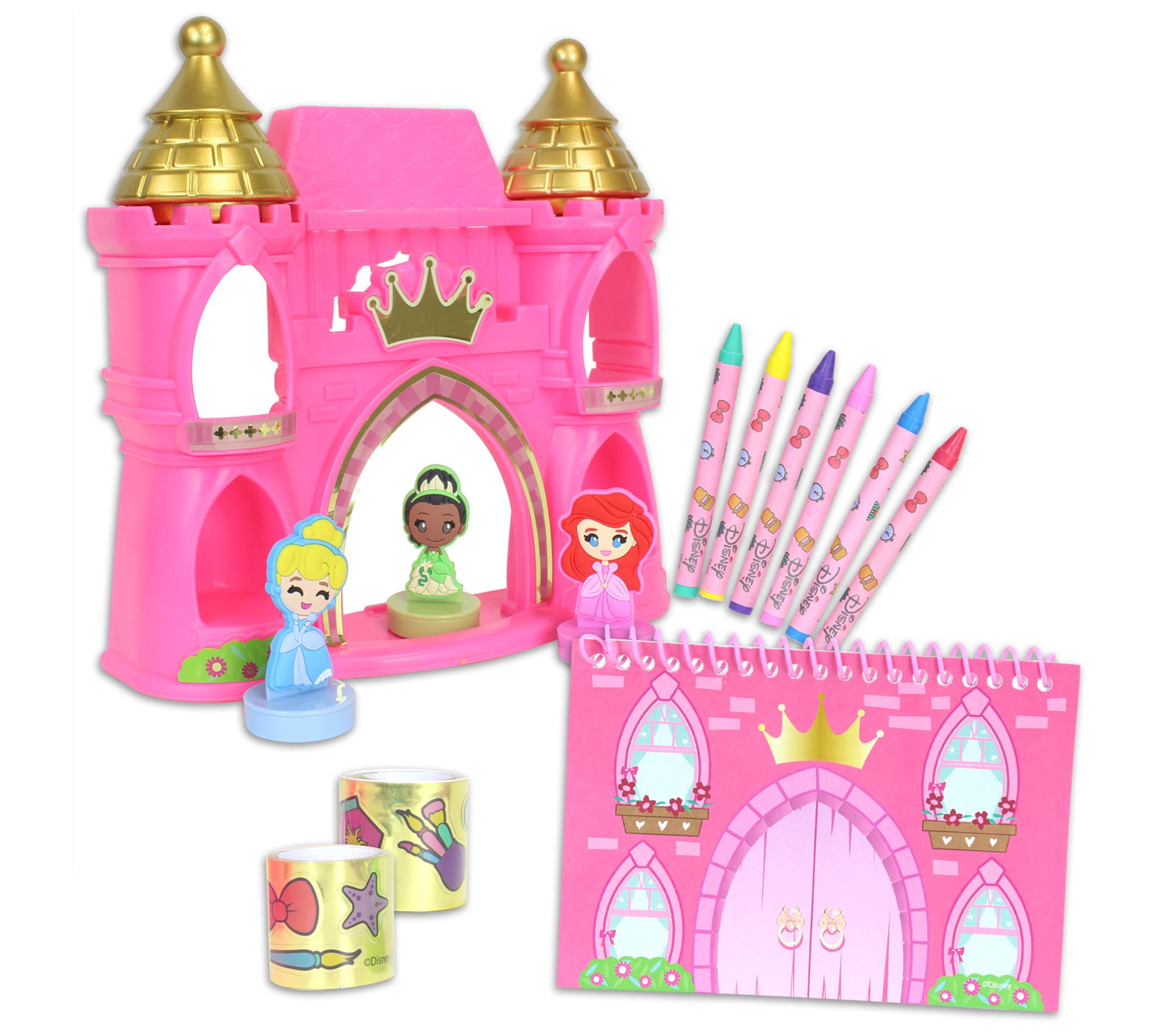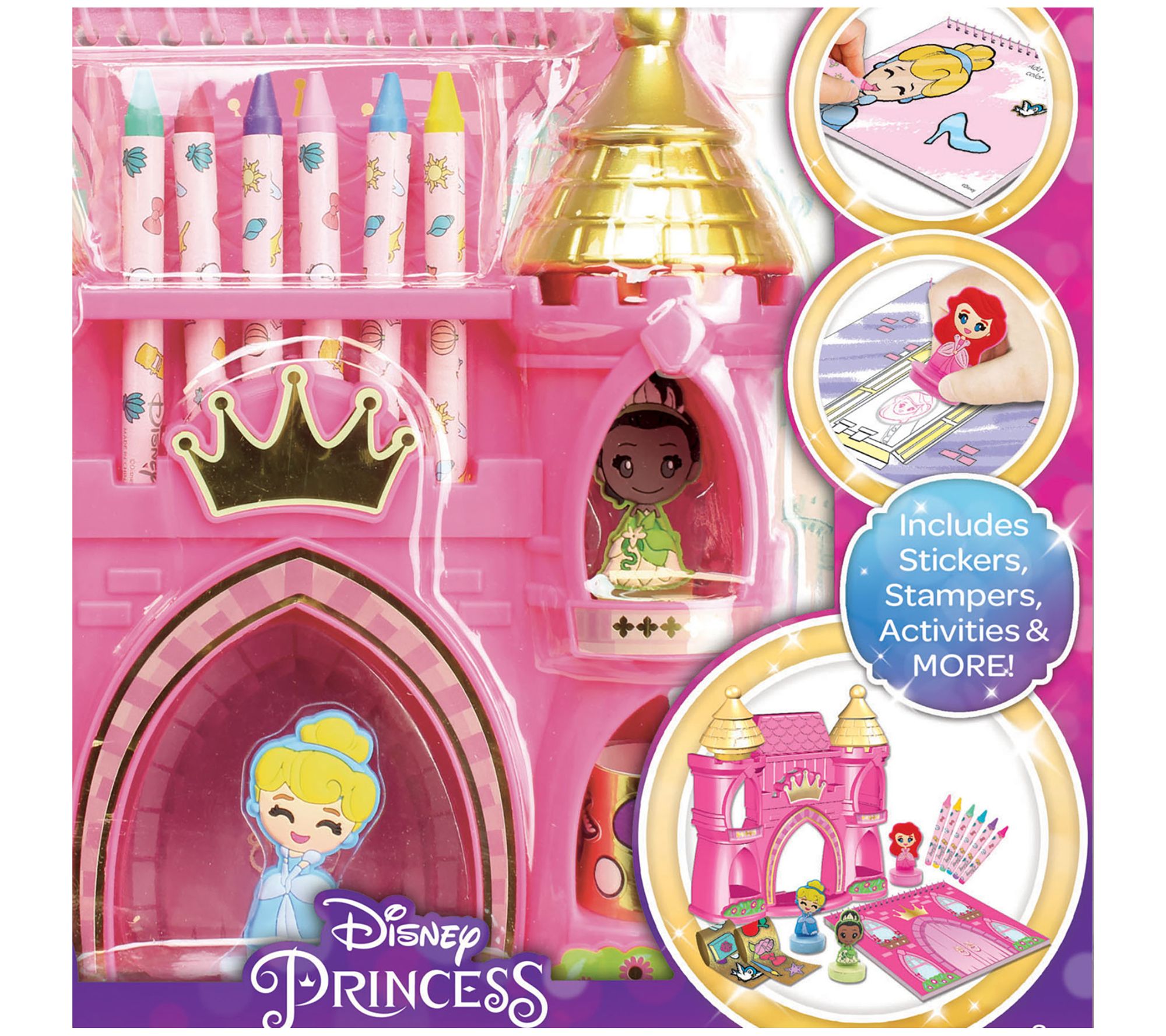 • Includes six crayons, two sticker rolls, castle studio, three character stampers, two castle roof stampers, and activity pad