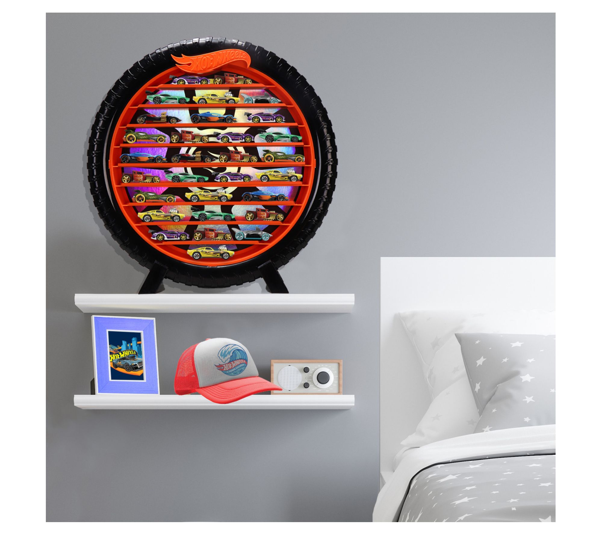 Show off your prized Hot Wheels collection with this premium display case. Designed like a cool tire, it’s perfect for wall mounting or stand-alone presentation. Keep your 1:64 scale vehicles in prime viewing condition, and be the envy of your friends. Ideal for both kids and adult collectors alike. From Tara Toy.