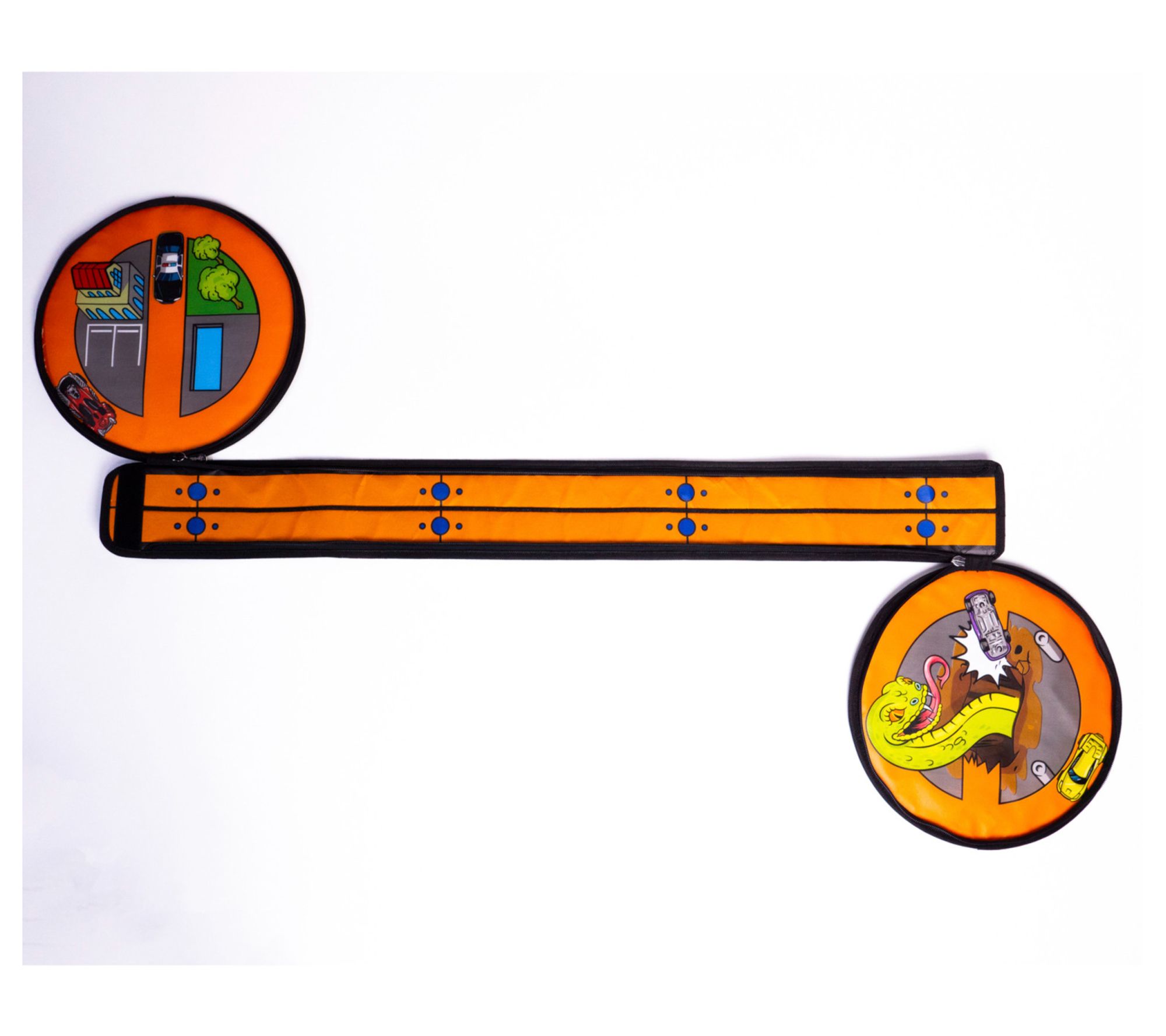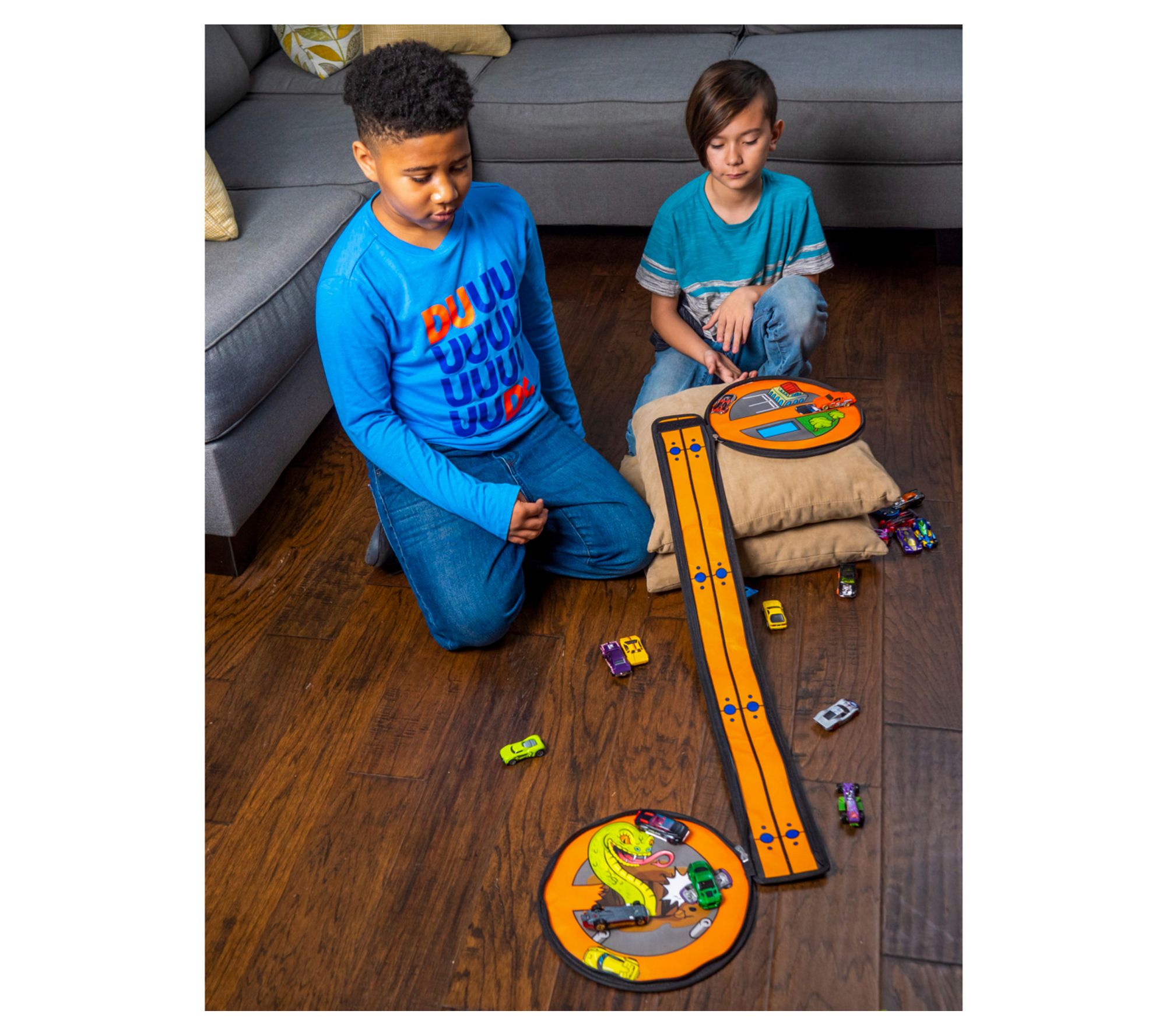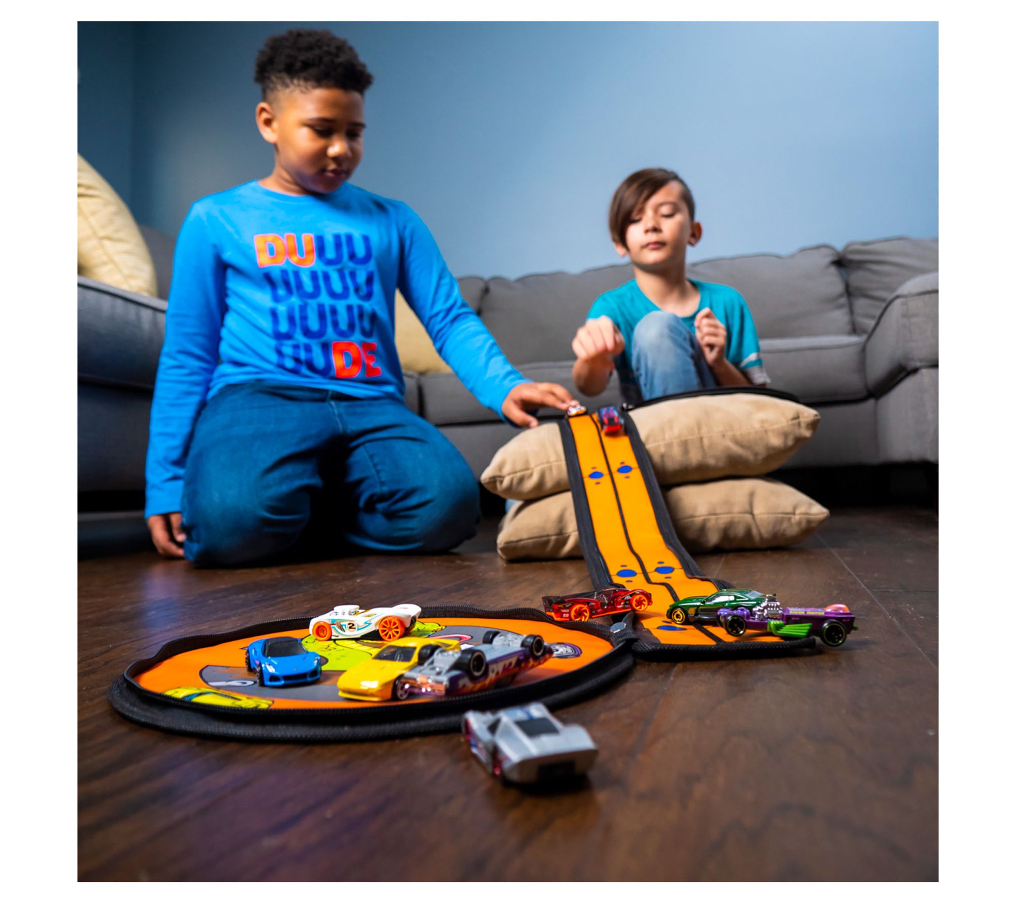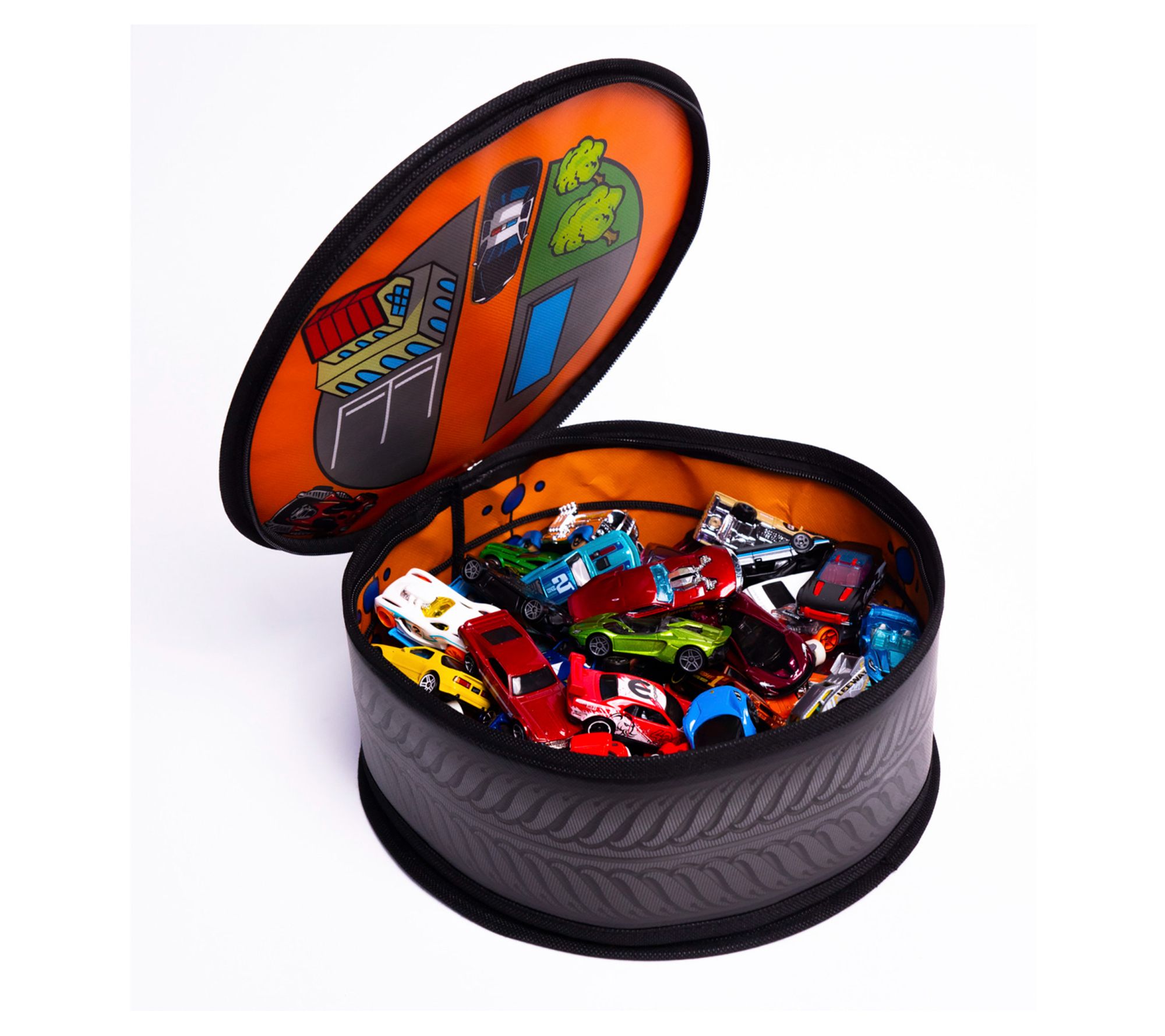 Your little one will love the Tara Toy zip bin. Perfect for on-the-go fun with a sturdy handle and easy-to-clean design, the wheel-shaped bin doubles as storage for up to 100 Hot Wheels cars and unzips to reveal a thrilling race track. From Tara Toy.