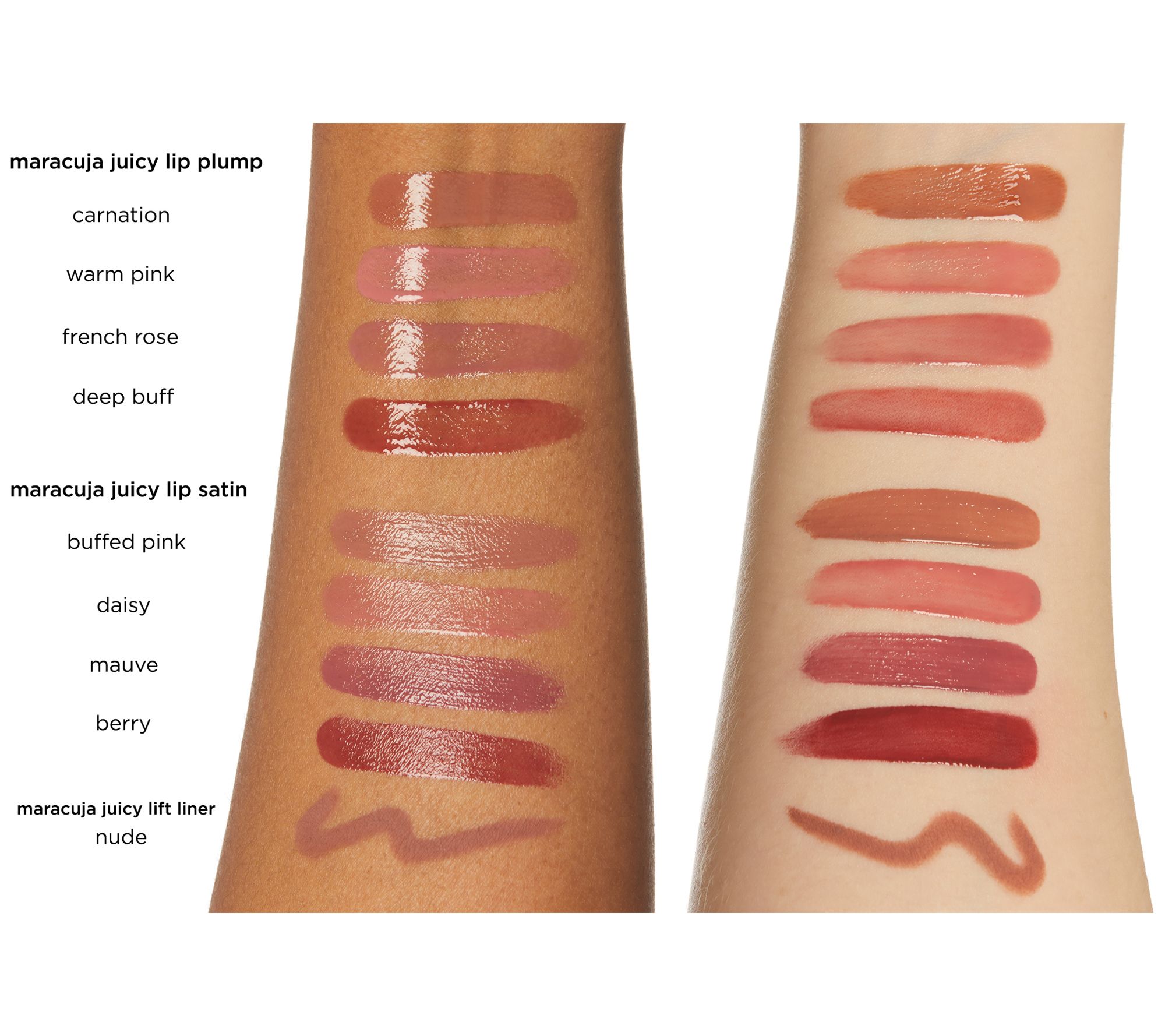 Juicy Plump contains sodium hyaluronate known to help temporarily plump the appearance of skin, leaving your lips with a gorgeous stained-glass finish and non-sticky shine. Juicy Satin provides 12-hour hydration in a luxurious, buttery formula that delivers a high-coverage, satin gloss finish. Juicy Lift Liner contains moisturizers that help improve the look of fine lines and wrinkles.