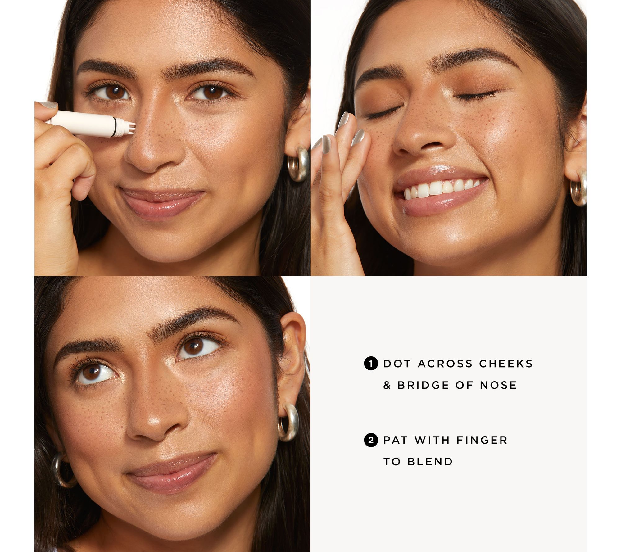 How do I use it: Push button and pull up to open cap. Dot across cheeks and bridge of nose. Pat with finger to blend.