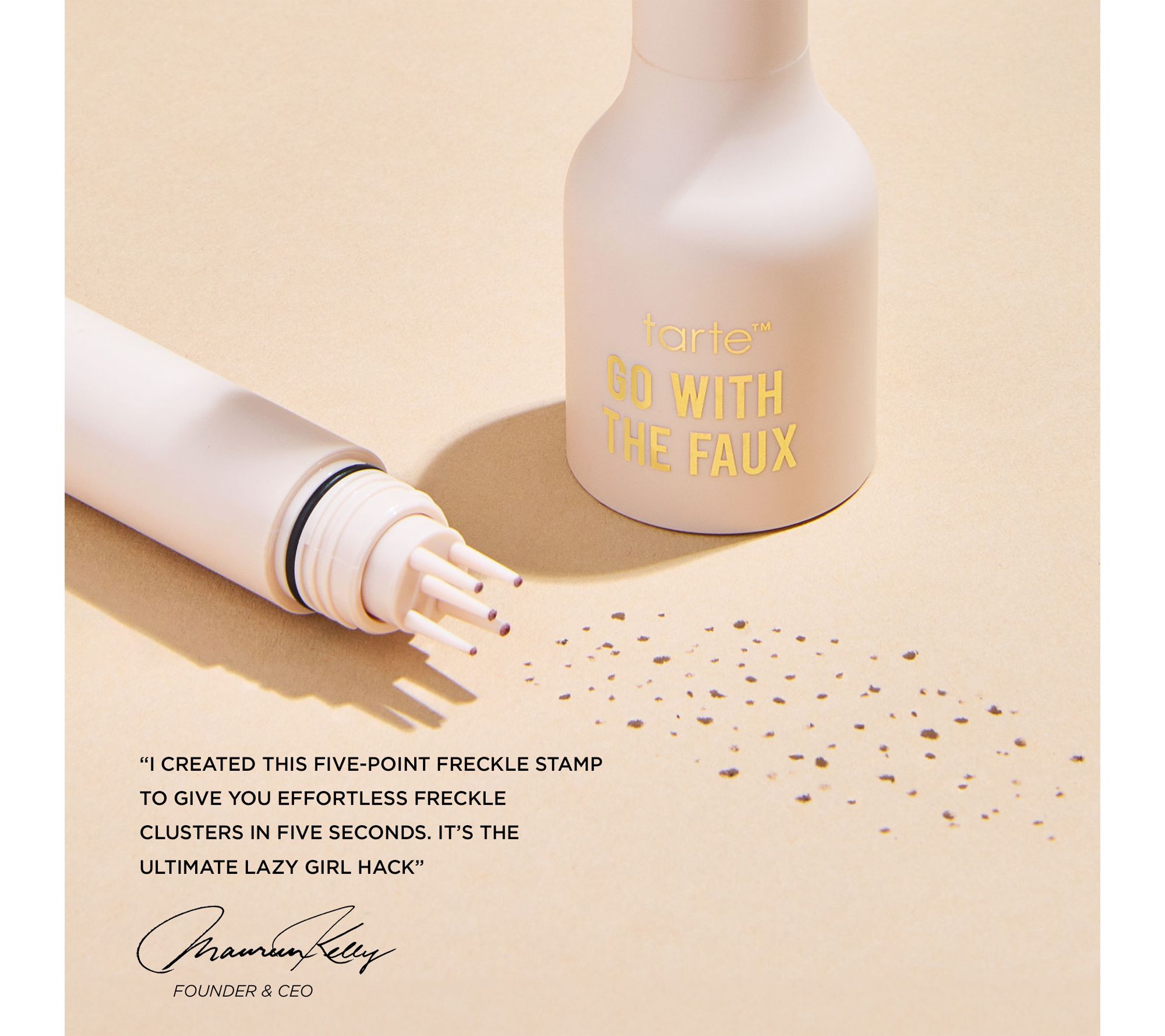 Instant freckles without the fuss or precision of a pencil. Get immediate faux, natural-looking freckles with tarte's pronged applicator in one simple press! The applicator features five points in a single stamp, so your freckles look naturally sprinkled -- just dab lightly for a subtle sprinkle or layer up for bolder freckles to achieve that sunkissed, carefree vibe without the sun damage. Just stamp and go -- no pro technique or steady hand required!