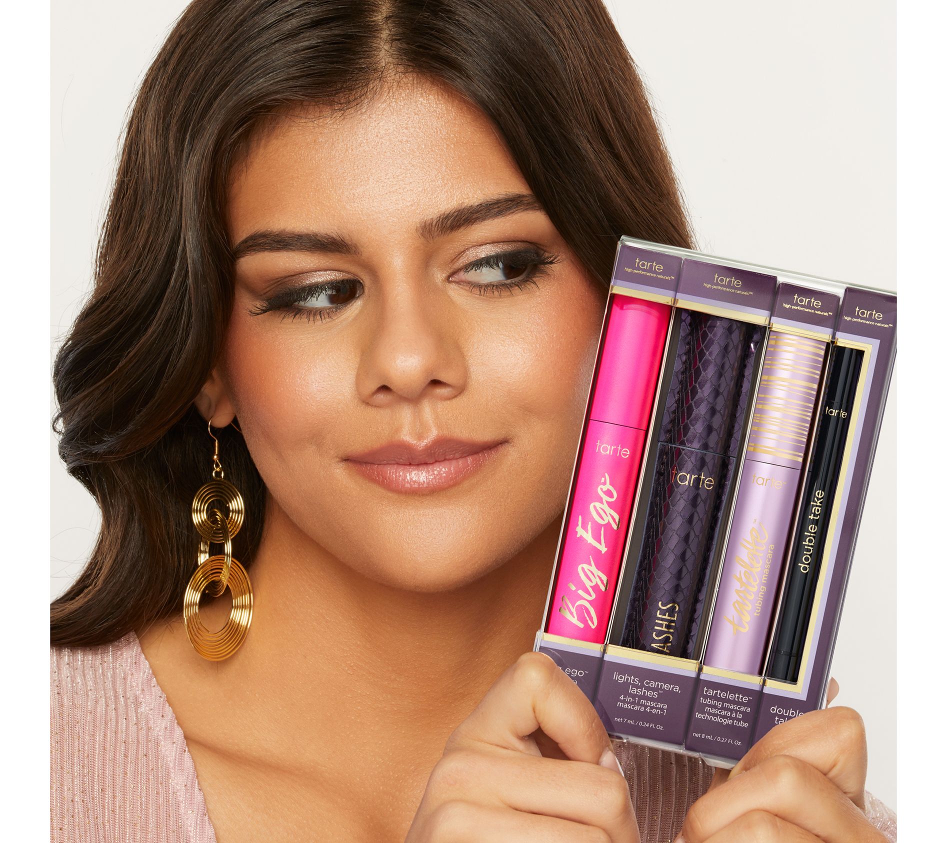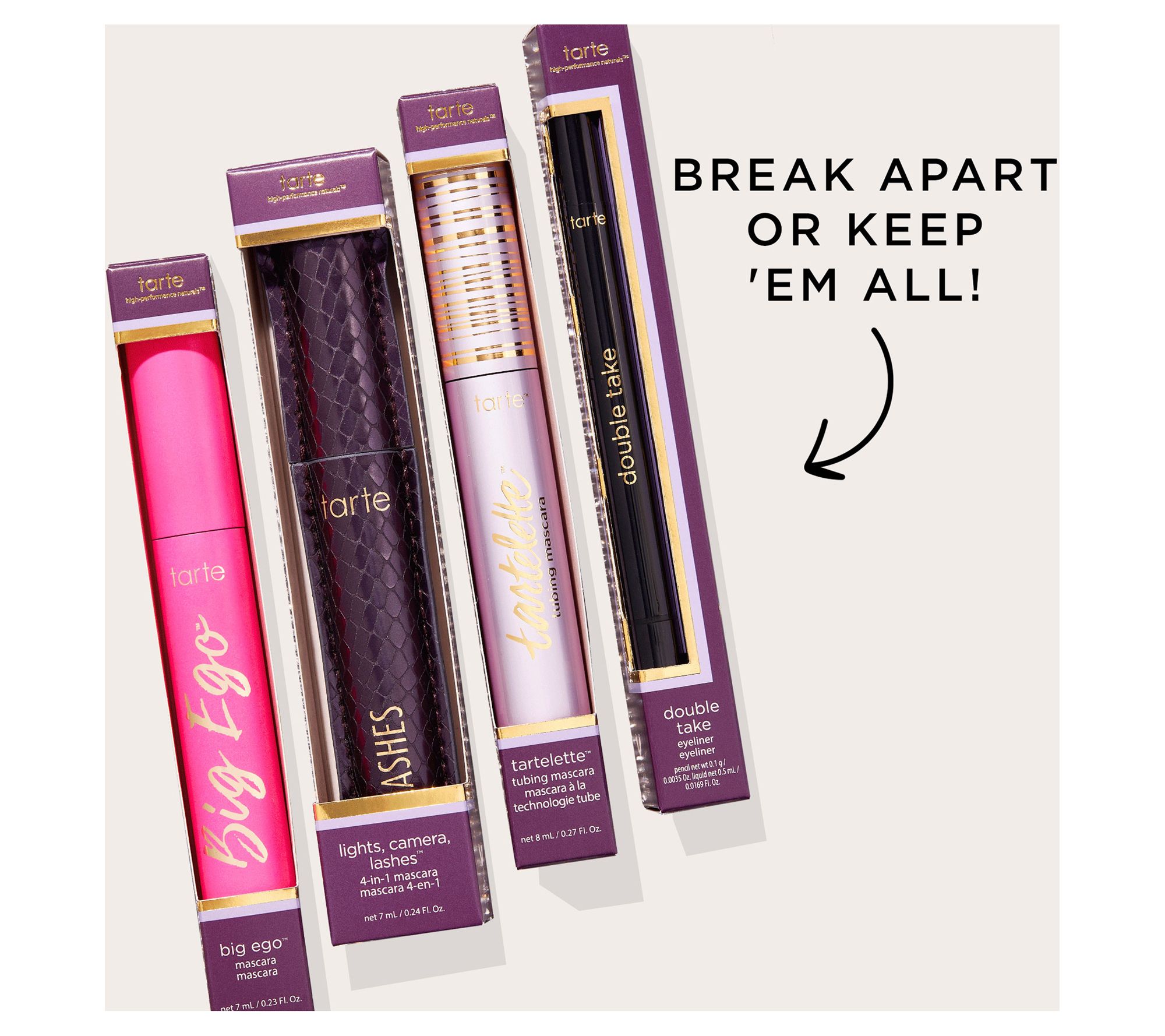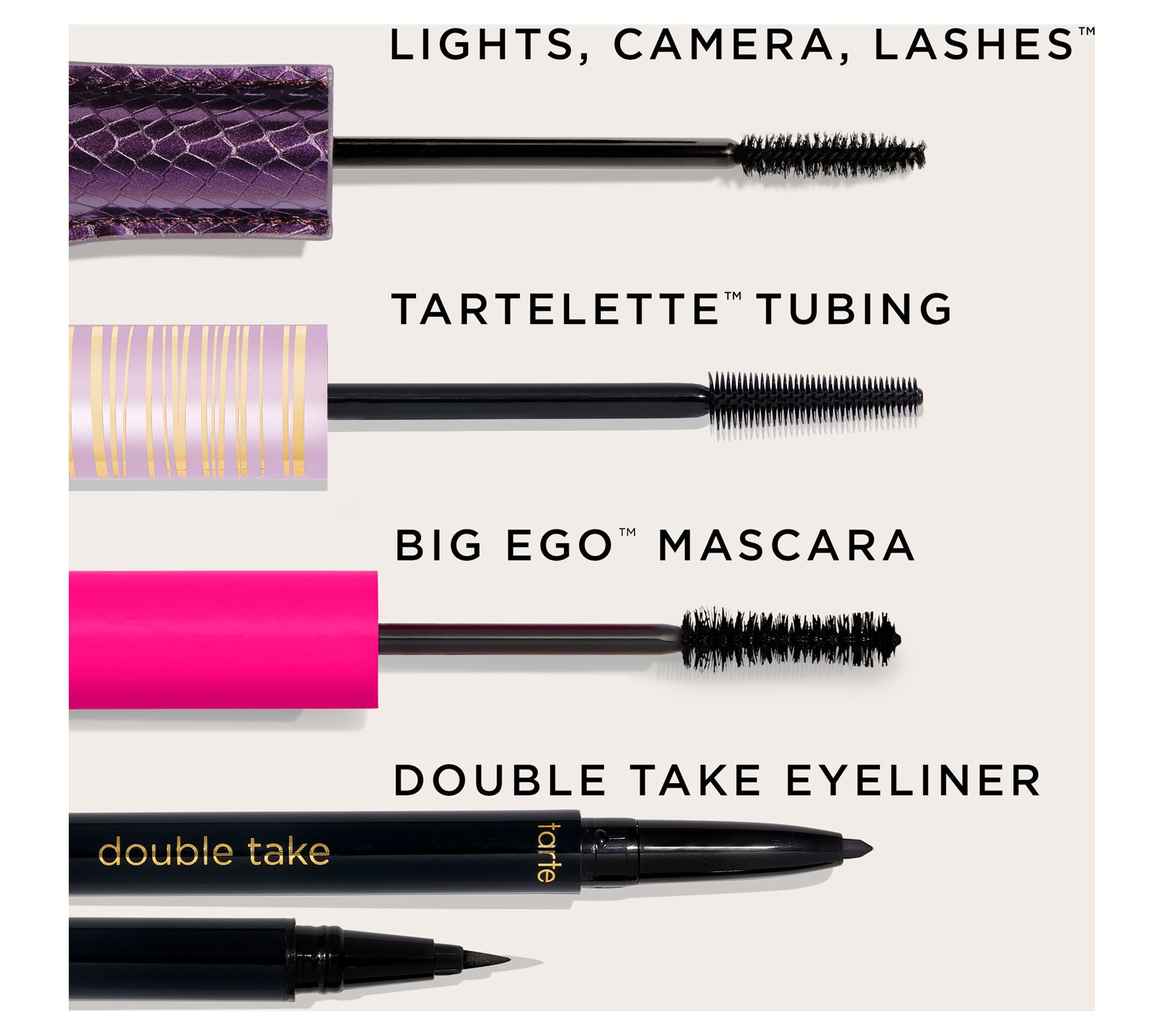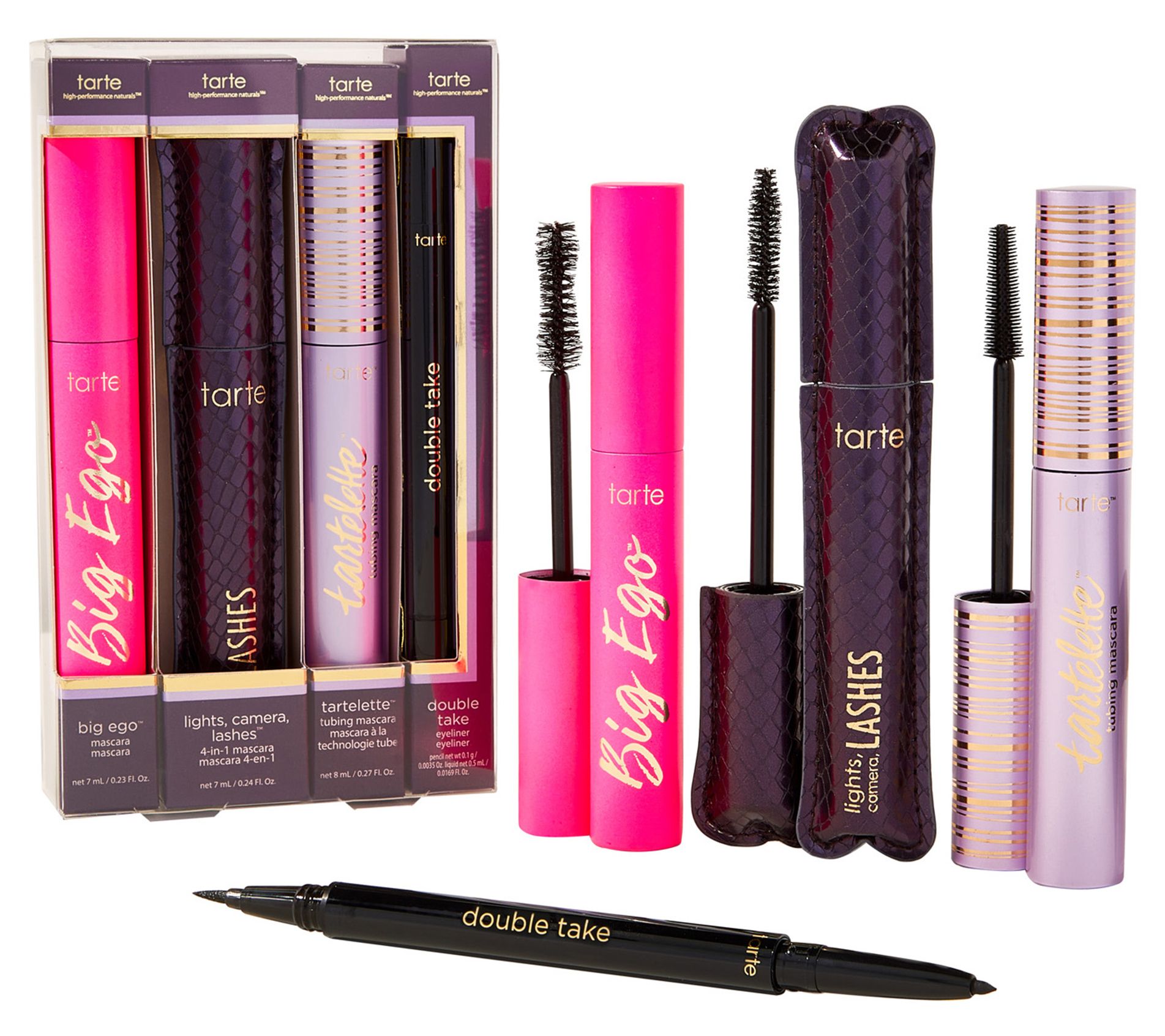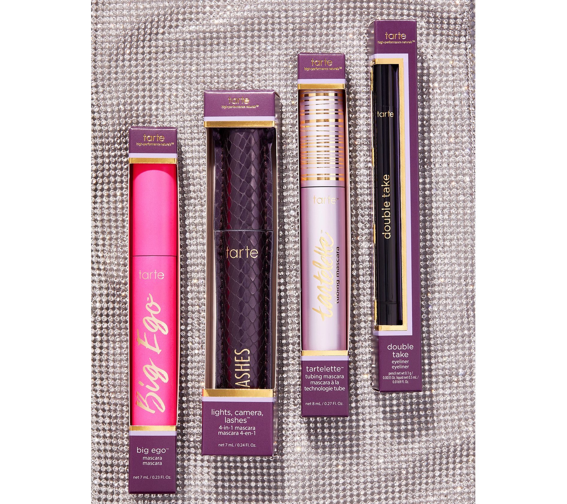 The "eyes" have it with this tarte bestsellers four-piece collection. Make their day (or yours!) merry and bright with three individually boxed full-size tarte mascaras and one liner. Receive four gifts in one. Break into four separate gifts or keep 'em for yourself! This set features three mascaras that will have you the lash envy of every holiday party. Complete any look with the double take eyeliner for added definition and holiday flair.