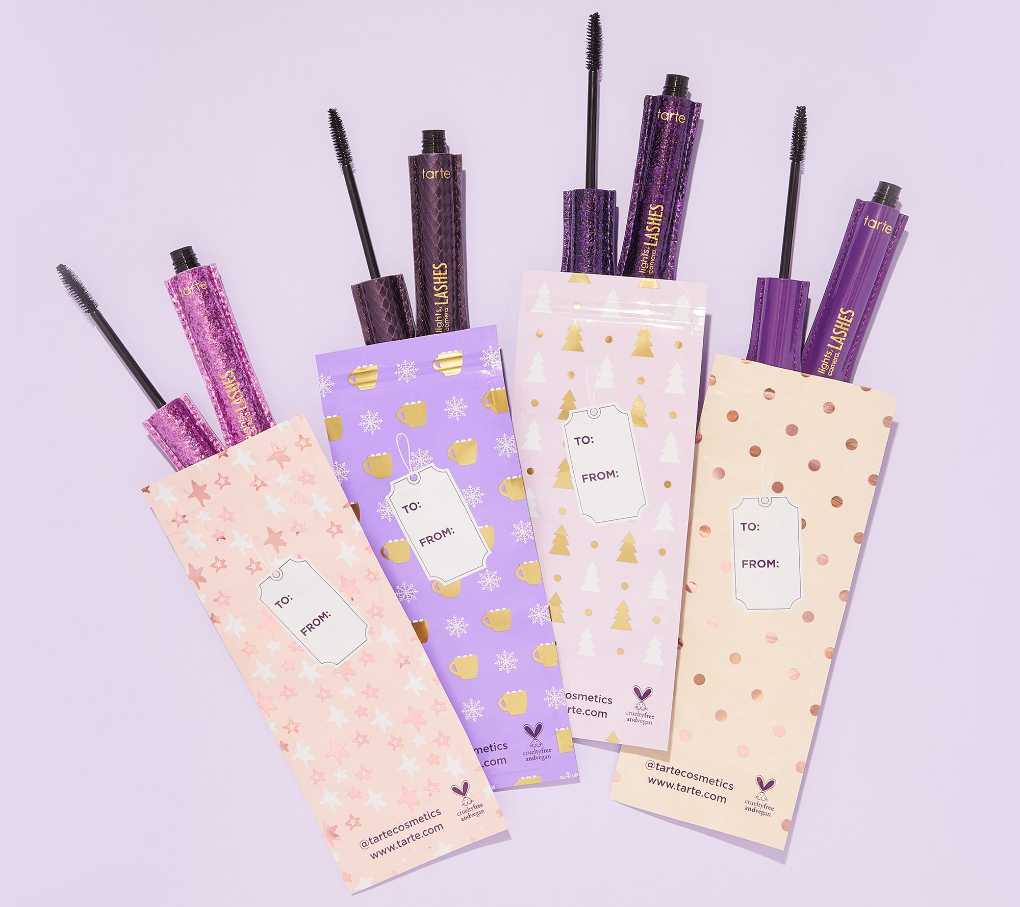 Score four gifts in one with tarte's lights, camera, lashes volumizing mascara four-piece collector's set with gift bags to keep or break apart!