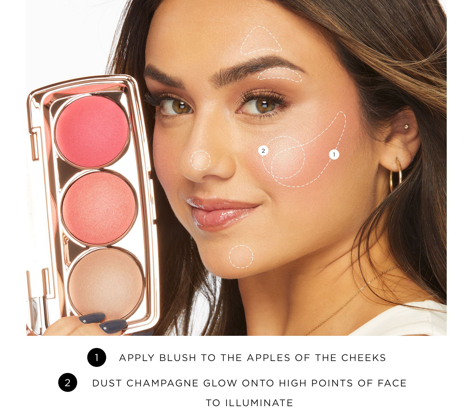 How do I use it: To illuminate, dust highlight shade onto the high points of the face using the included brush. For a radiant-looking flush, lightly dust blush shades on the high points of the cheeks with the same brush, blending upward towards the temples.