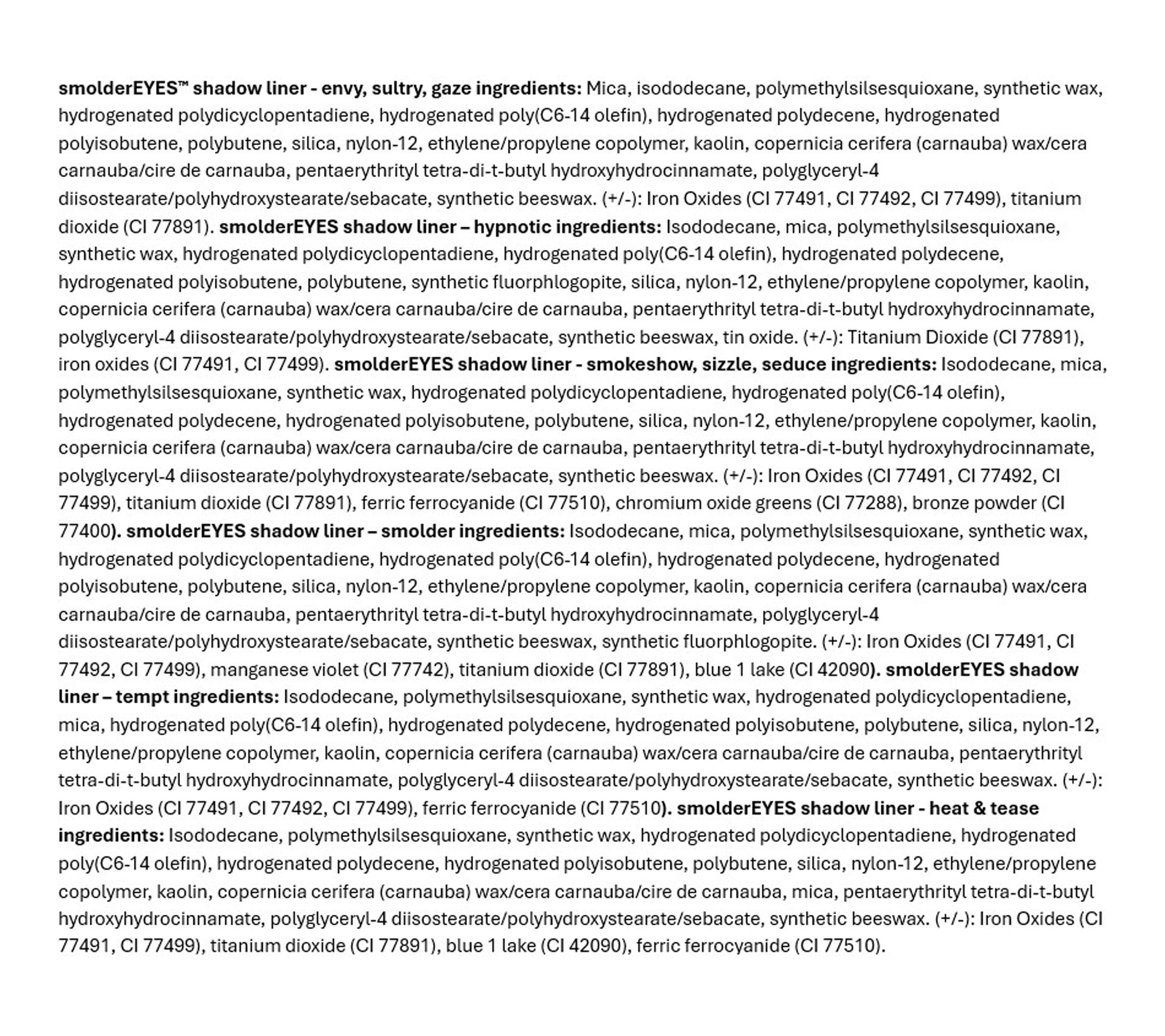 Shade, sculpt, smudge, and smolder with smolderEYES shadow liner. It glides on precisely for definition and blends out seamlessly with a built-in smudger. Its mineral pigments are lightweight and give long-lasting color, plus it also contains carnauba wax.