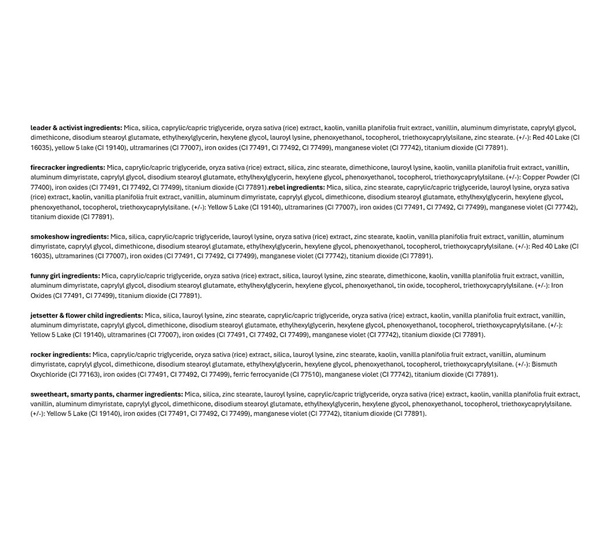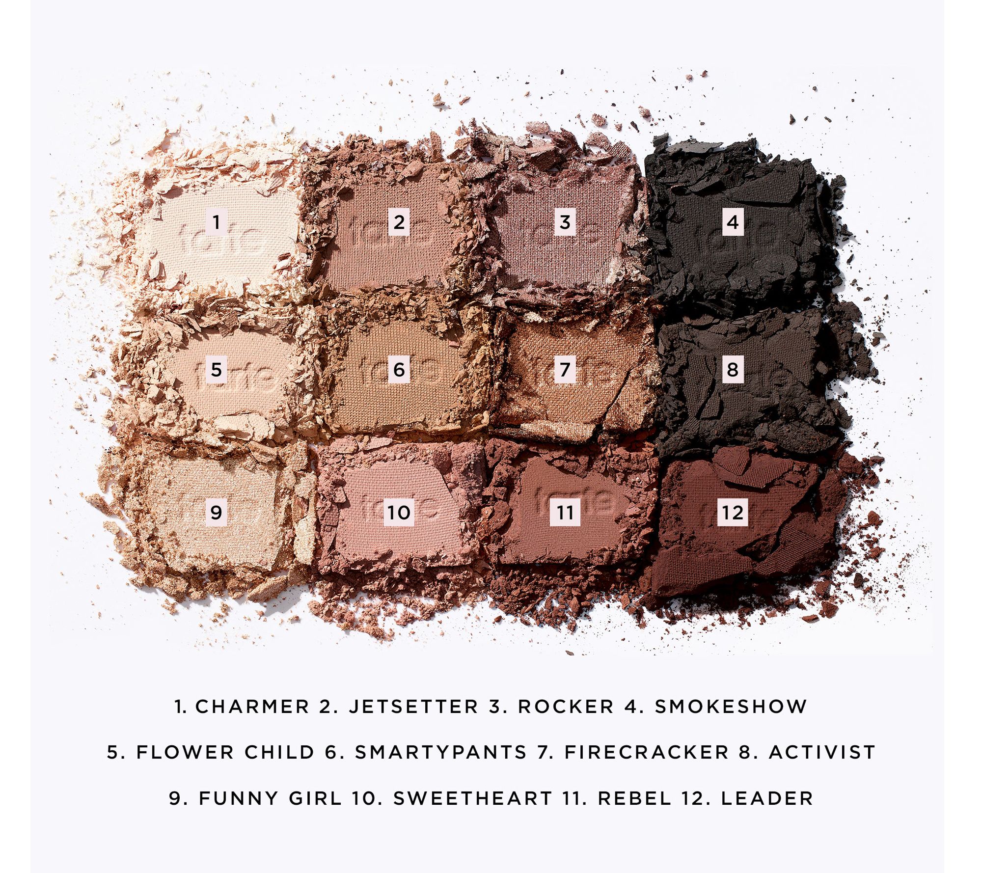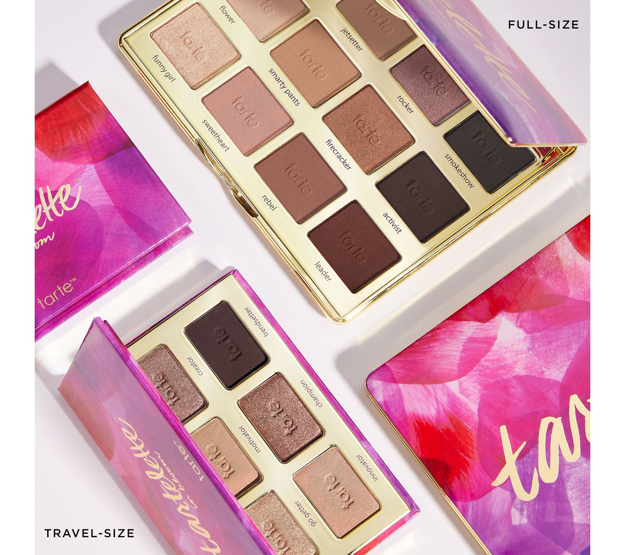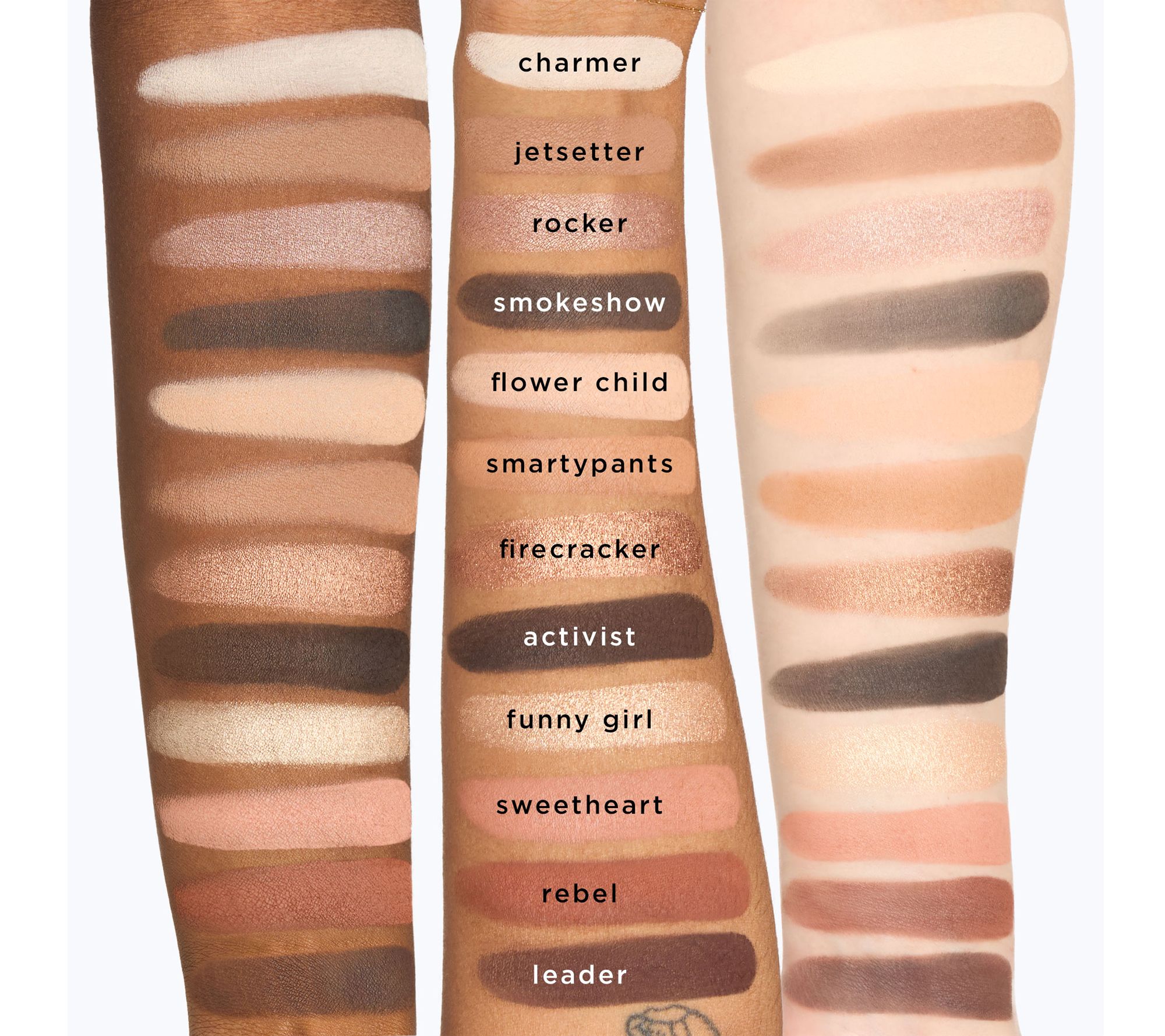 Includes 6.3-oz tartelette in bloom Amazonian clay palette with 12 shades: Harmer, a matte off-white shade; Jetsetter, a matte warm taupe shade; Rocker, a taupe shimmer shade; Smokeshow, a matte black-brown shade; Flower Child, a matte peachy nude shade; Smarty Pants, a matte tan shade; Firecracker, a bronze copper shimmer shade; Activist, a matte dark brown shade; Funny Girl, a champagne shimmer shade; Sweetheart, a matte peach shade; Rebel, a matte chestnut brown shade; and Leader, a matte aubergine shade