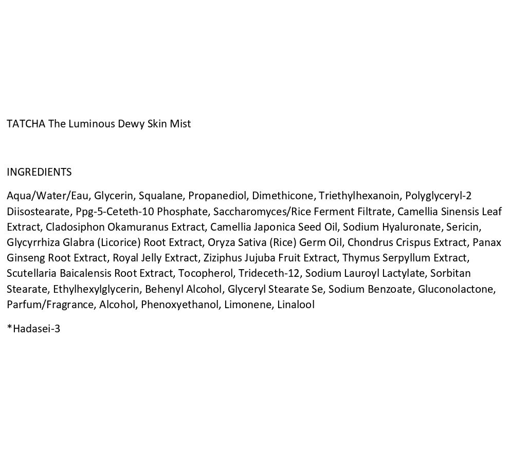 Deliver an instant boost of hydration to your skin with this silky, fast-absorbing spray-on moisturizer that can be used under or over makeup for glowing skin anytime, anywhere. This hydrating fine mist is also formulated with TATCHA's Hadasei-3, a proprietary complex of double-fermented Uji green tea, Akita rice, and Mozuku algae.
