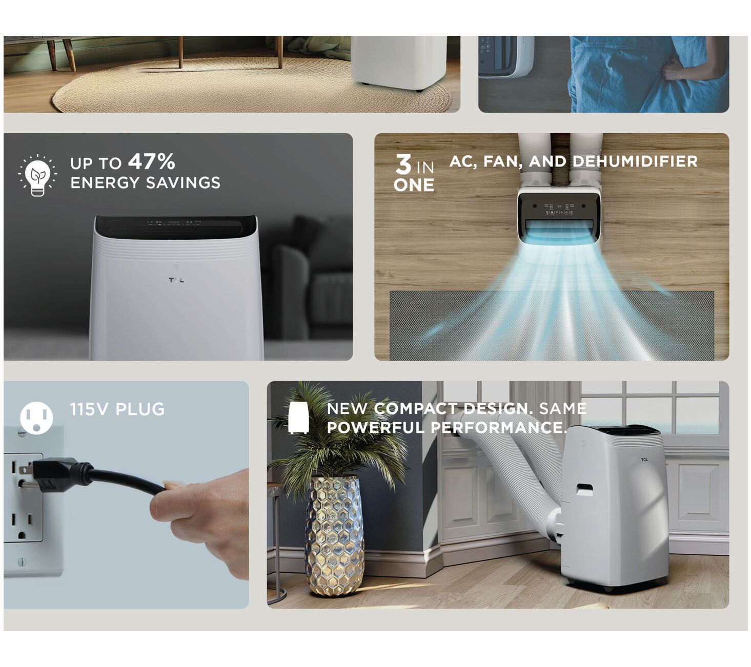 Warm days feel refreshingly cool when this 10,000 BTU portable air conditioner takes charge -- rapidly lowering the temperature while maintaining a comfortable atmosphere in rooms up to 450 square feet. Its innovative dual-hose technology helps lock in cool air, and quick mode settings mean you're only moments away from crisp comfort. Three functions in one help you relax, work, or sleep more easily. From TCL.