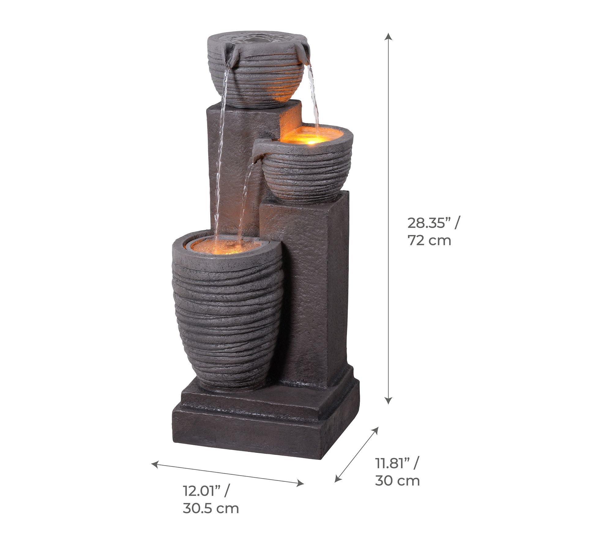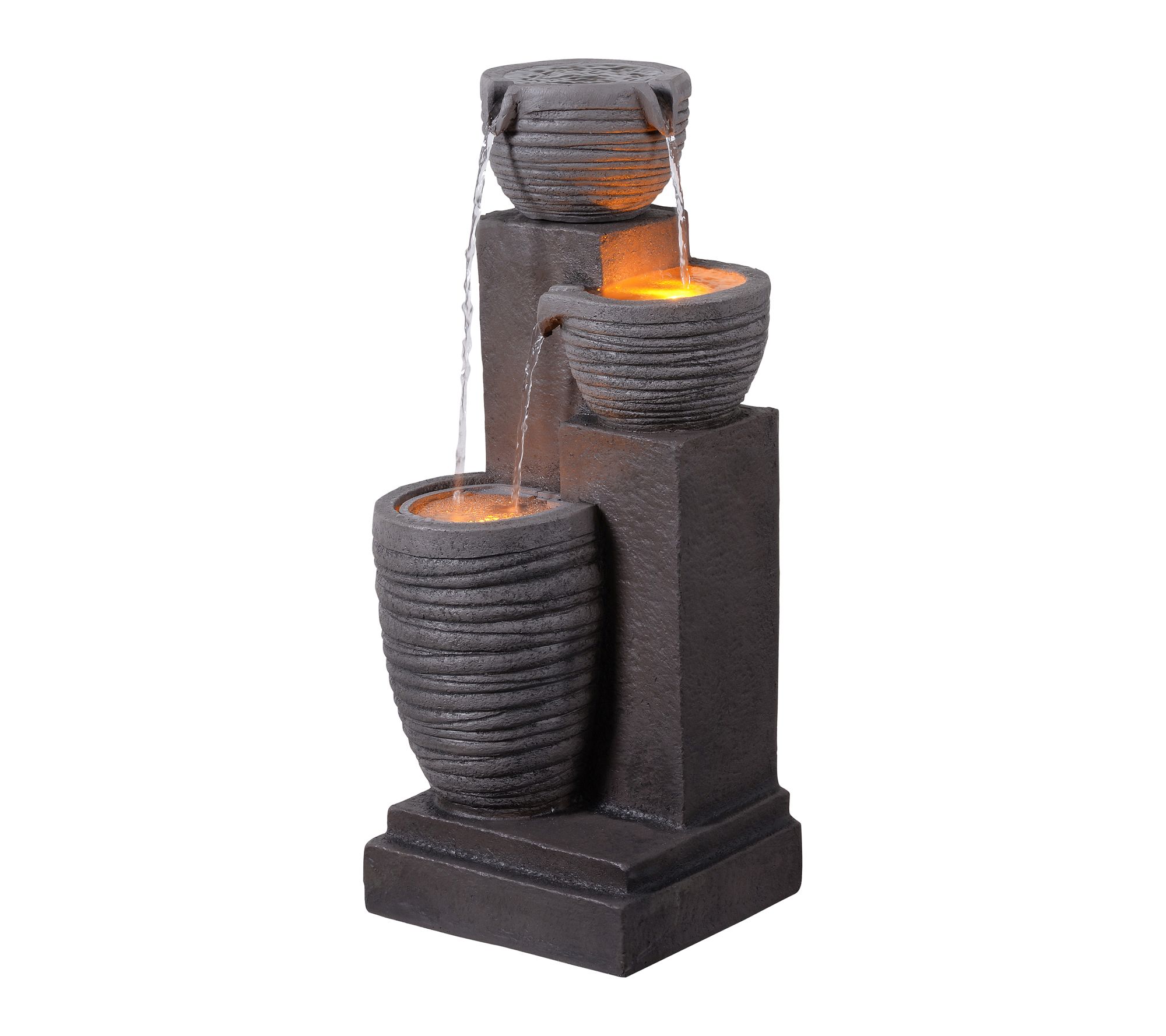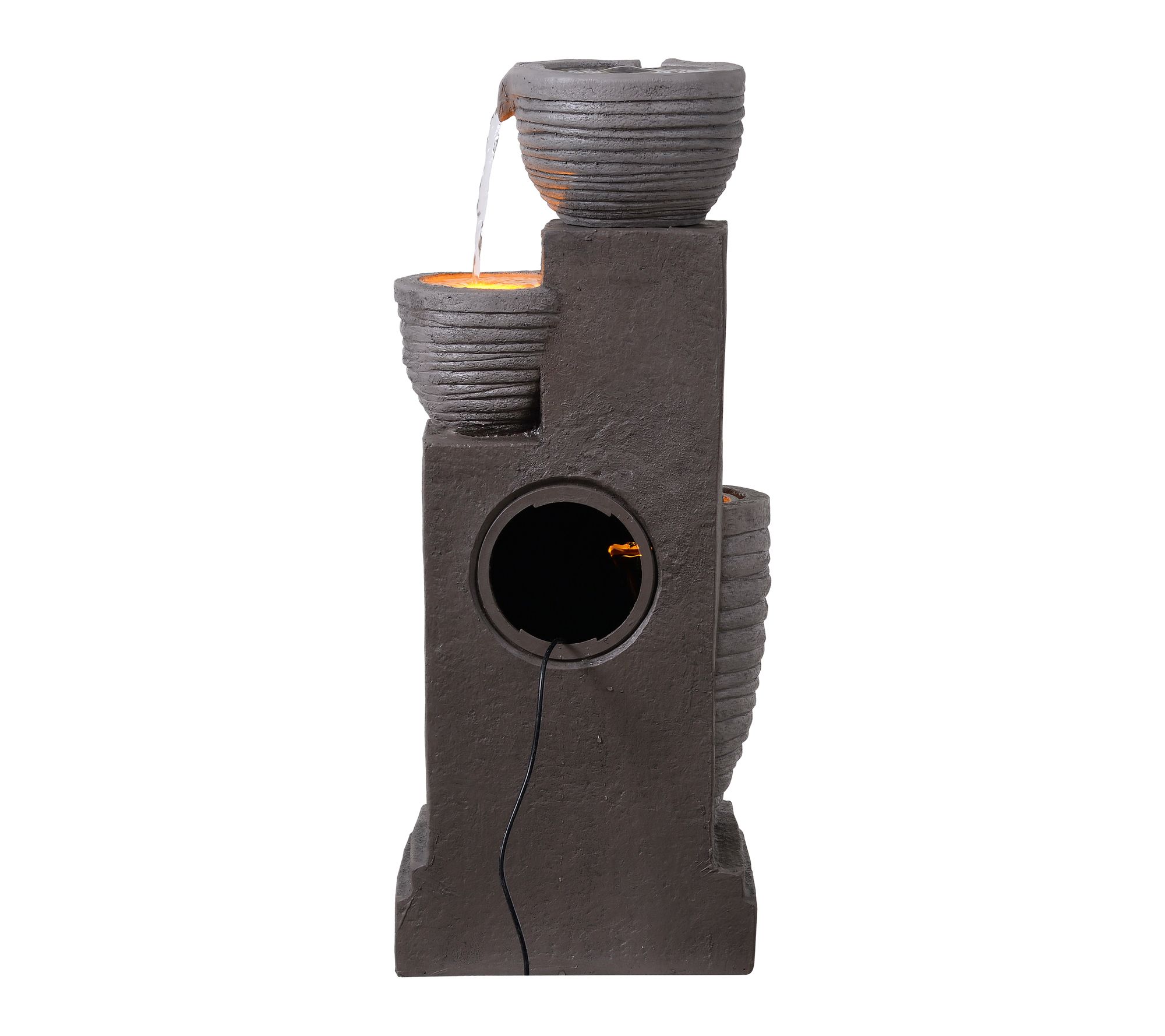 • Three textured bowls create a cascading water feature with a warm gray finish and integrated LED lights for gentle illumination