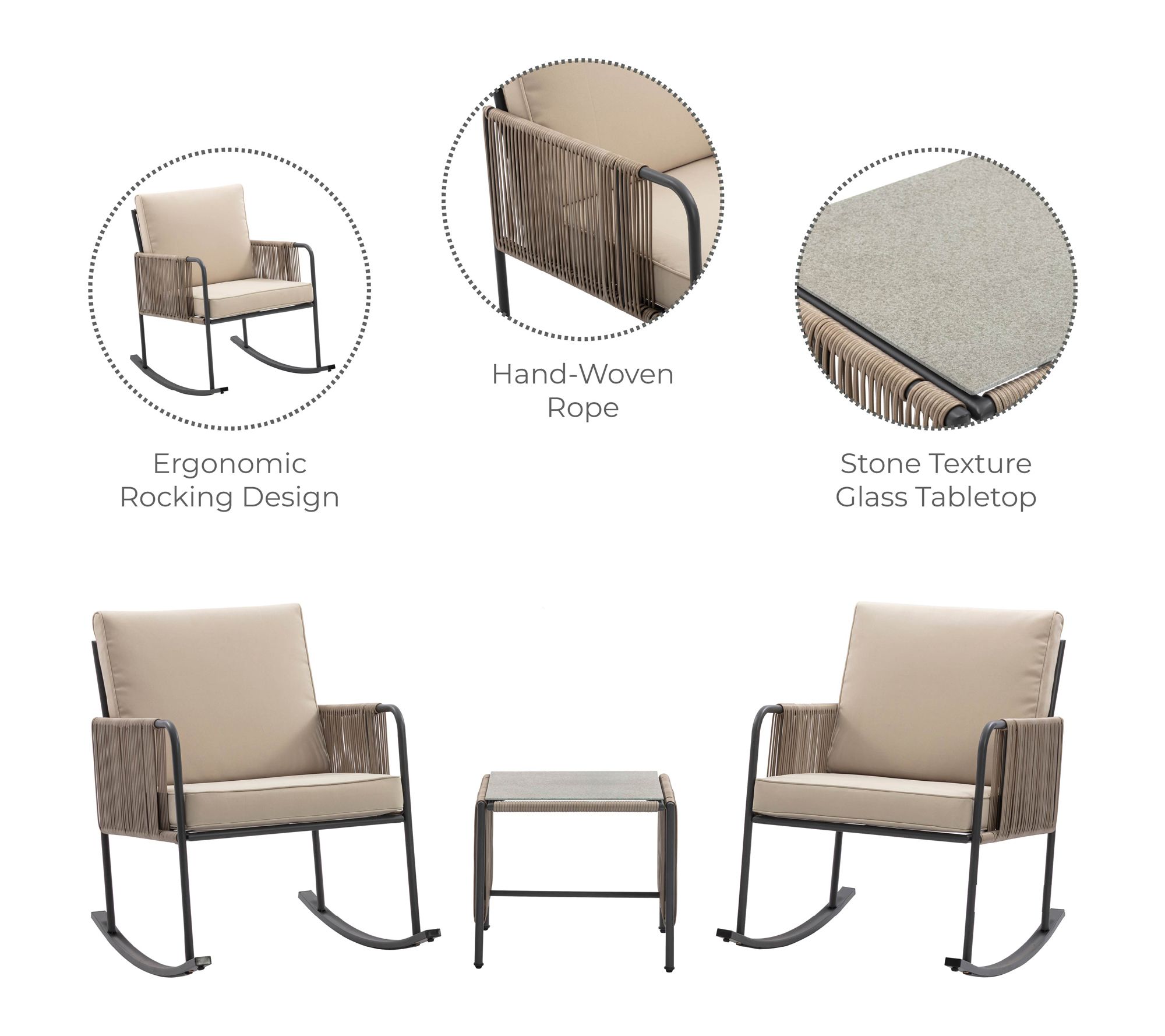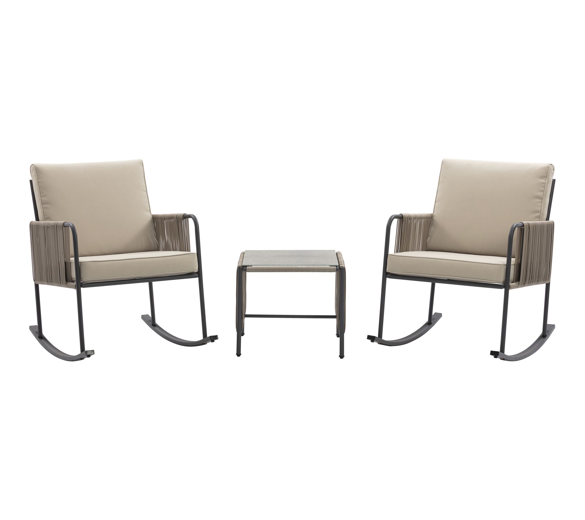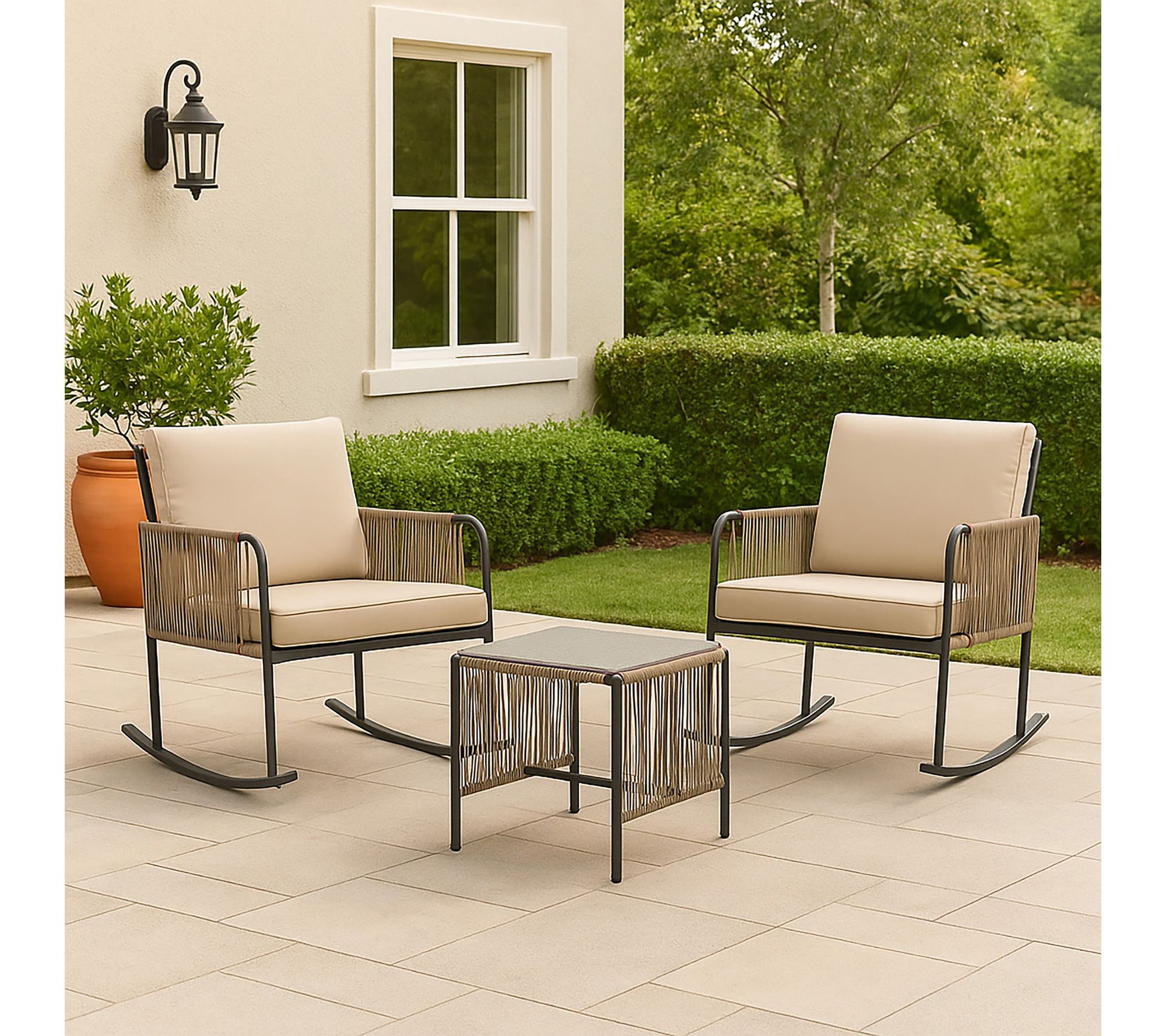 Create a relaxing outdoor retreat with this three-piece rocking chair conversation set, thoughtfully designed for ultimate comfort with rocking chairs, plush cushions, and a matching side table. Whether sharing a morning coffee or enjoying sunset chats, sturdy steel frames with woven rope accents provide style and support through every season. From Teamson Home.