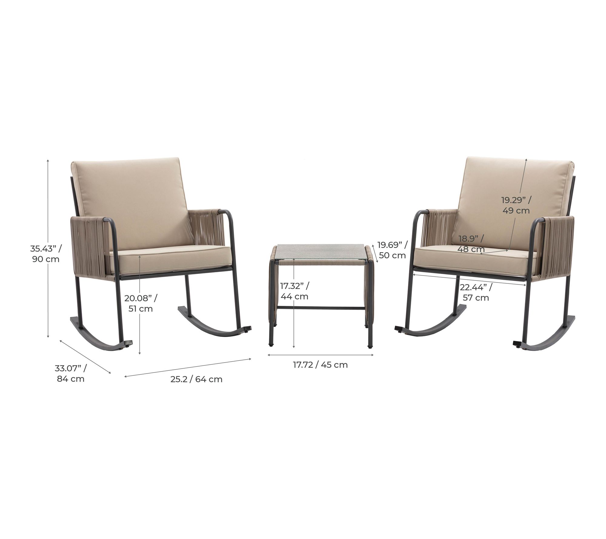 • Each chair measures 33.07"L x 25.2"W x 35.43H; side table measures 19.69"L x 17.72"W x 17.32"H; weight capacity 330 lbs per chair