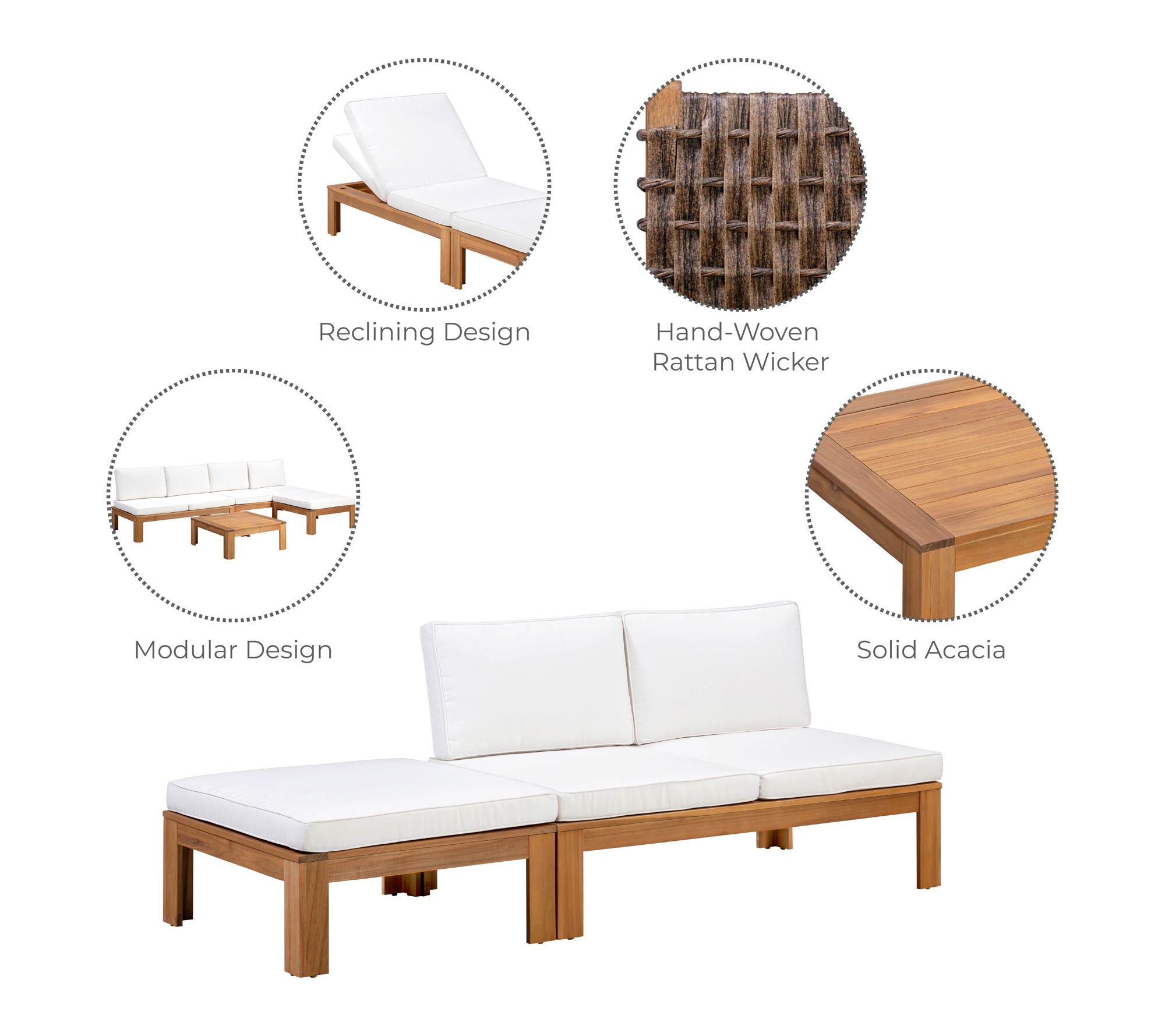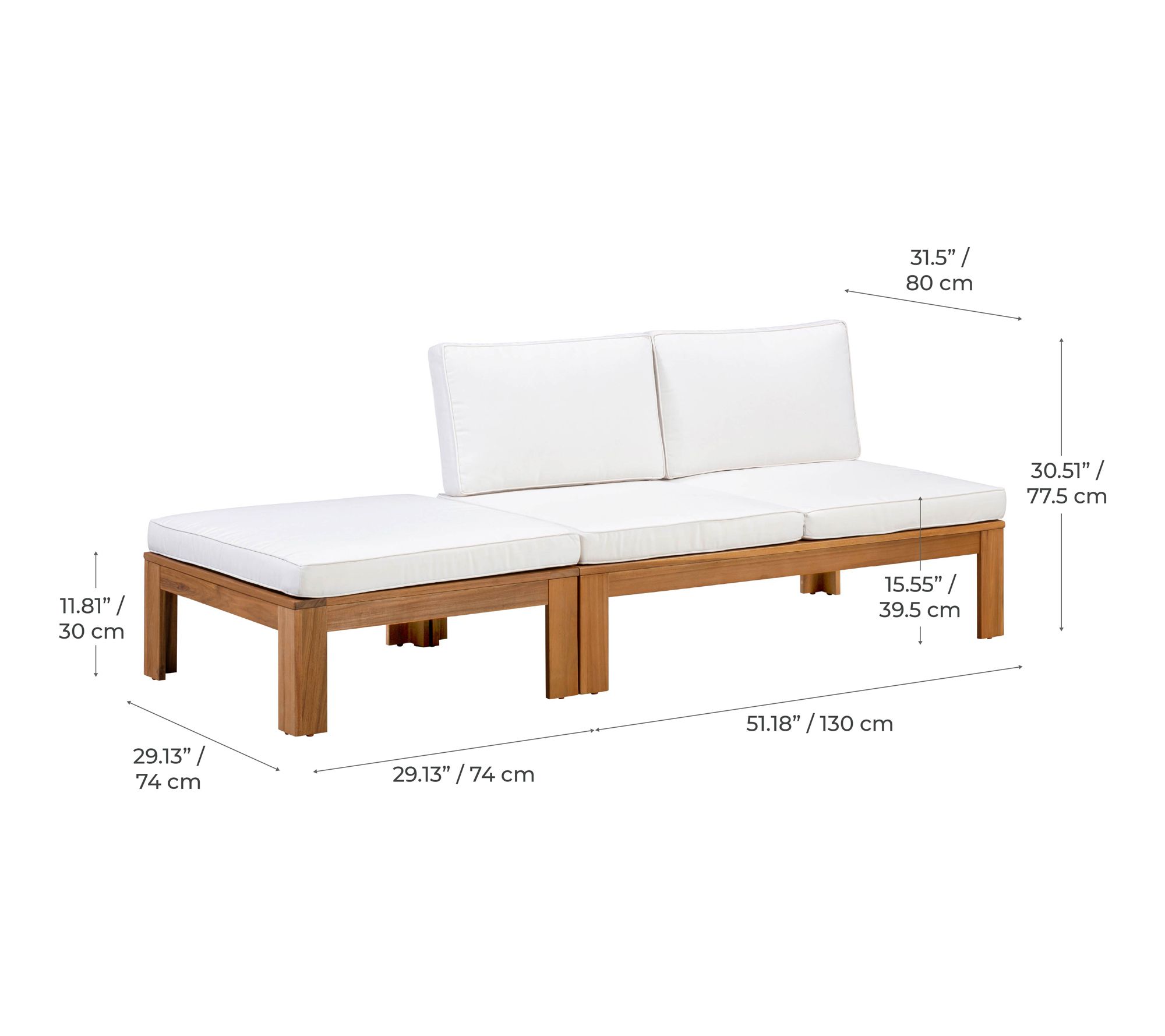 Modular design lets you arrange as loveseat, lounger, chaise, or table