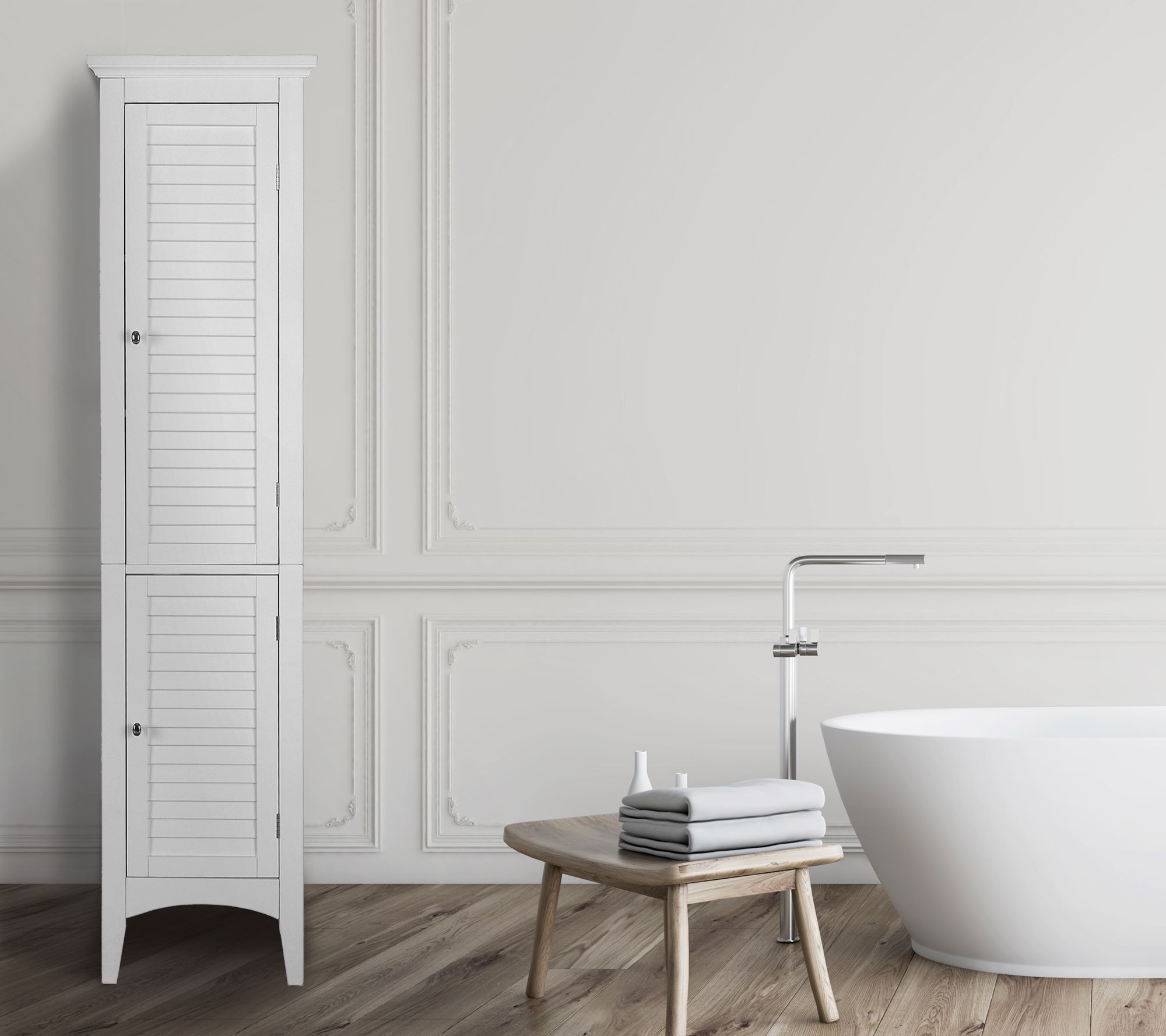 • Four interior shelves; five tiers; crown-molded top and skirting; chrome-finished knobs; louvered doors; shaker-style and arched legs