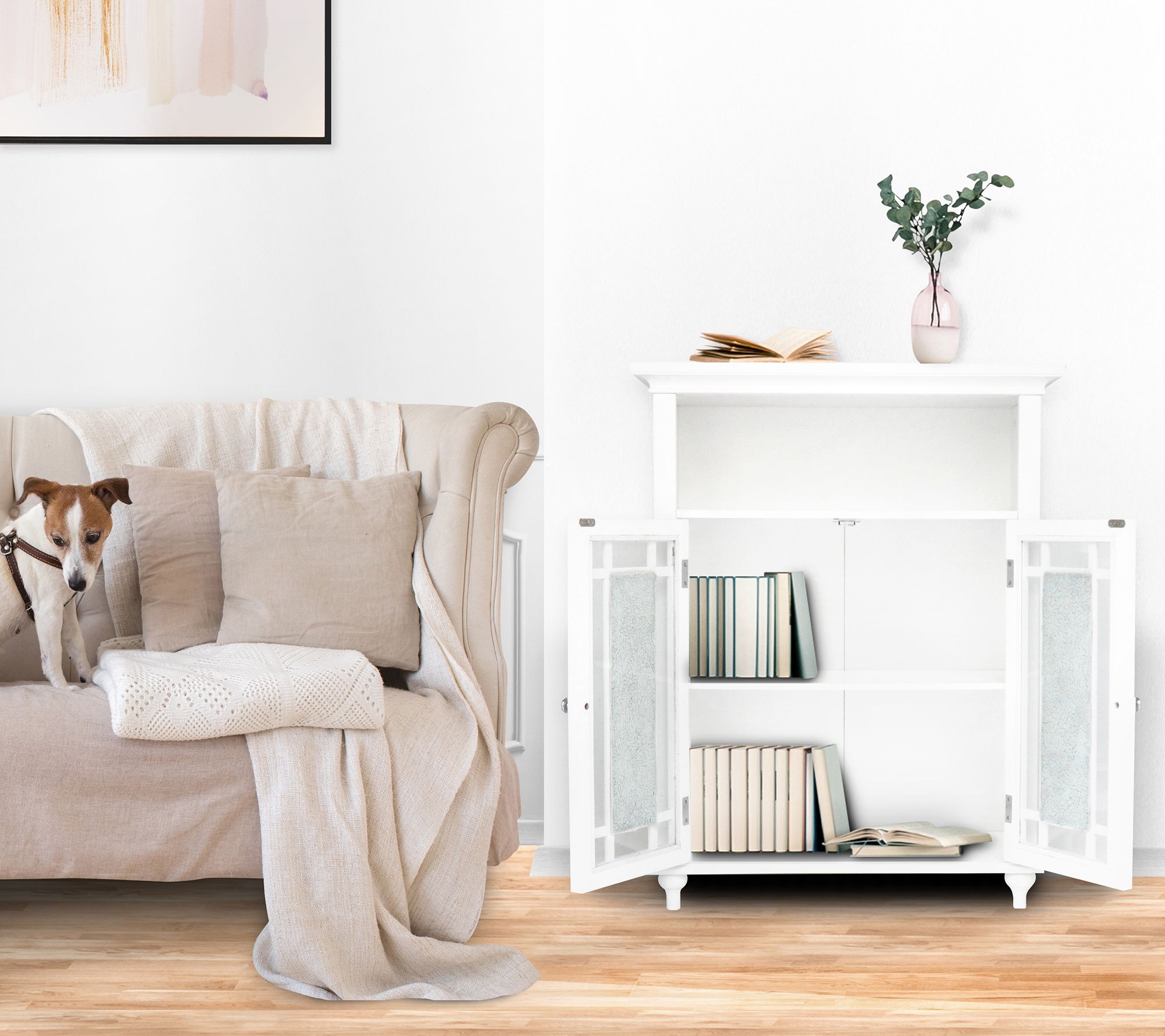 Silver glass mosaic doors give this Windsor wooden floor cabinet plenty of eye-catching appeal. Thoughtfully designed with a shelf and door, it's a versatile accent piece that's as beautiful as it is functional. From Teamson Home.