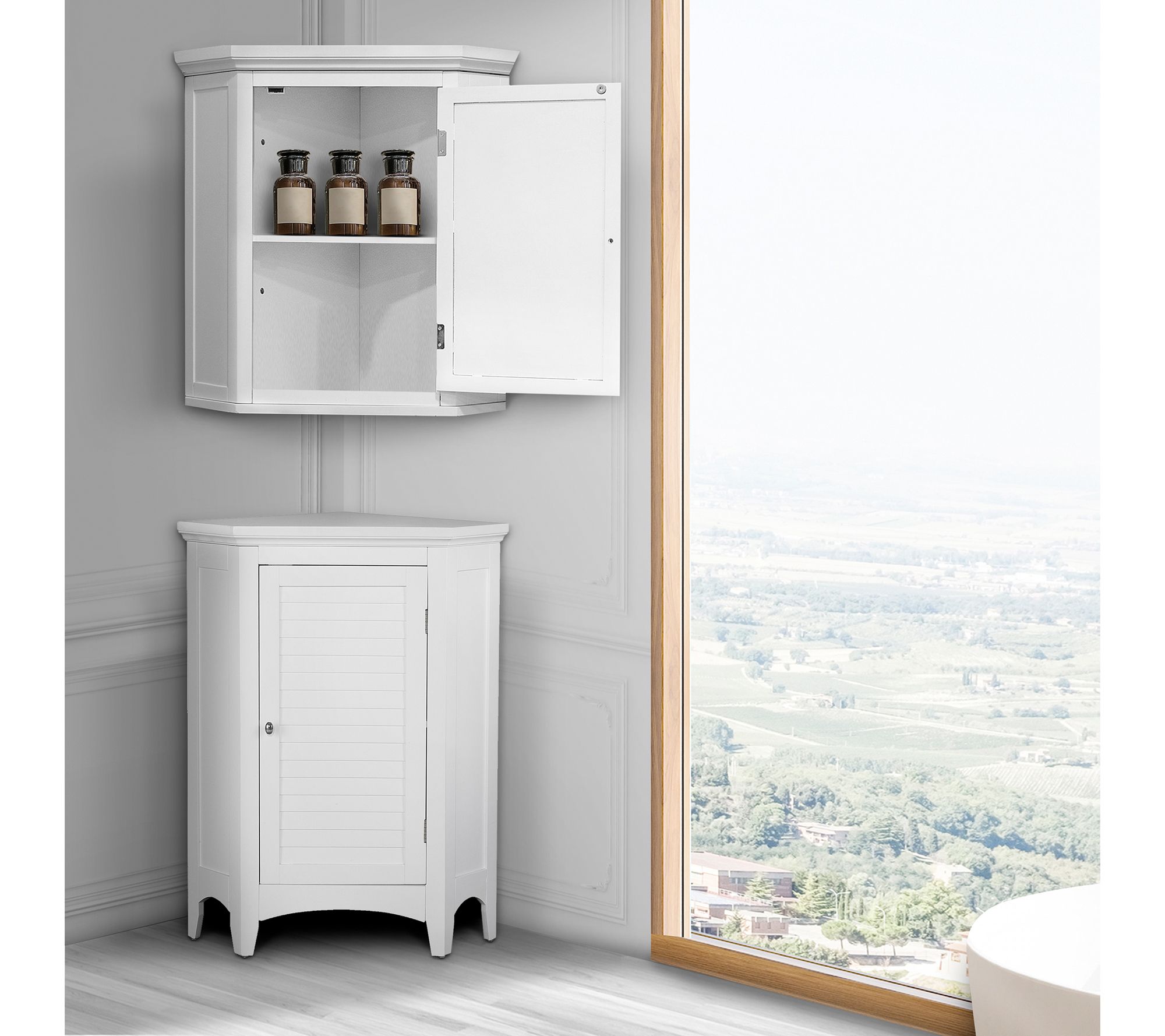 • Interior shelf; crown-molded top and skirting; chrome-finished knob; louvered door; shaker-style legs