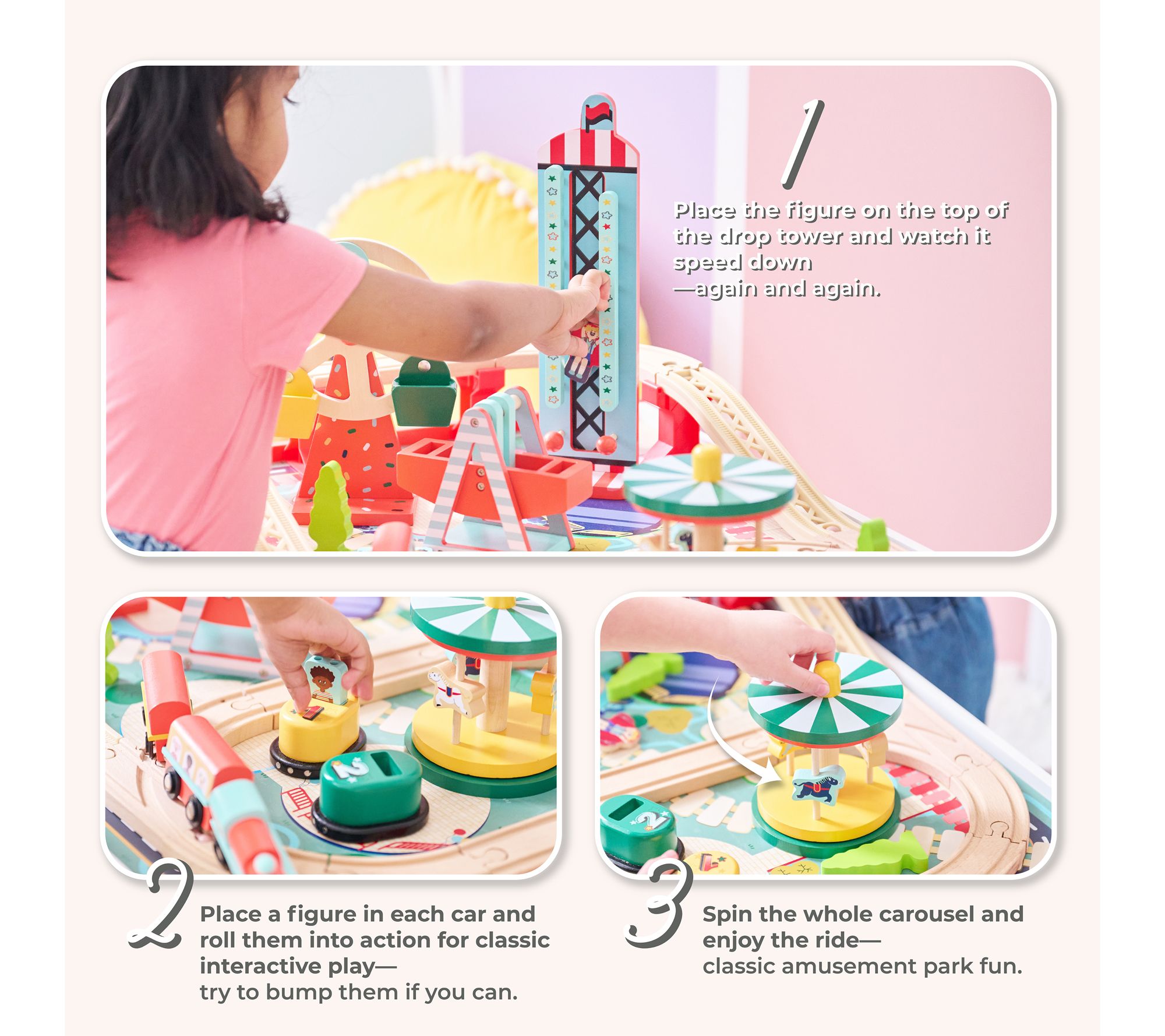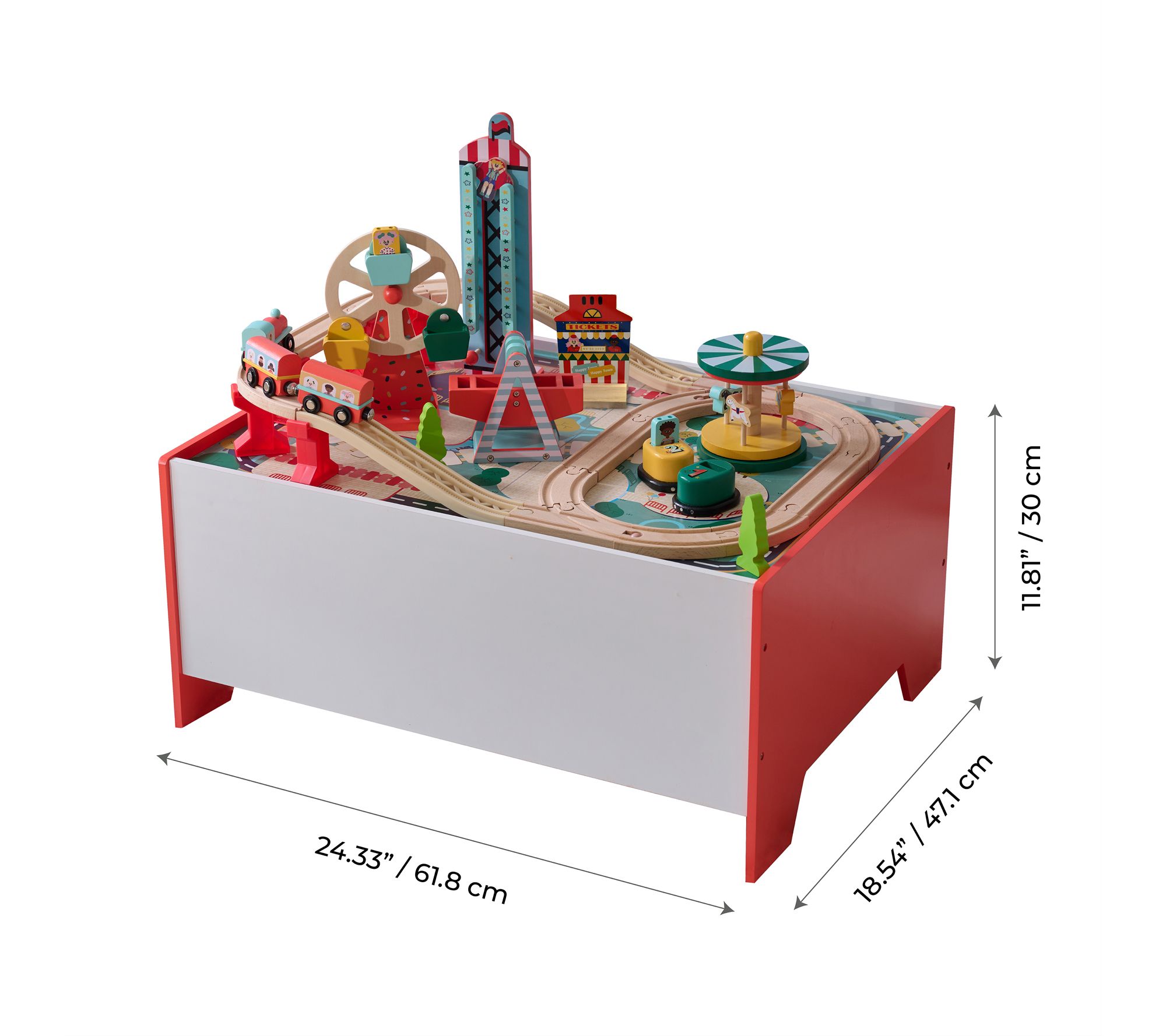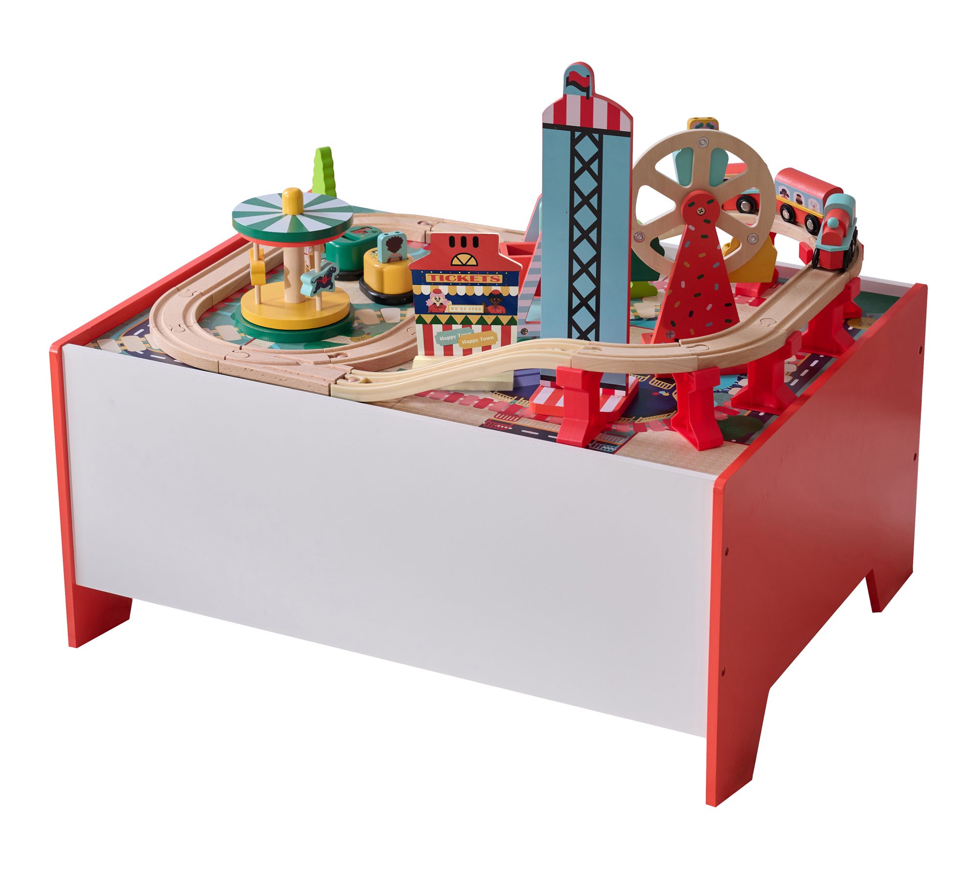 Includes table, train tracks, storage bin, carrousel, bumper cars, boat swing, ferris wheel, and free fall tower