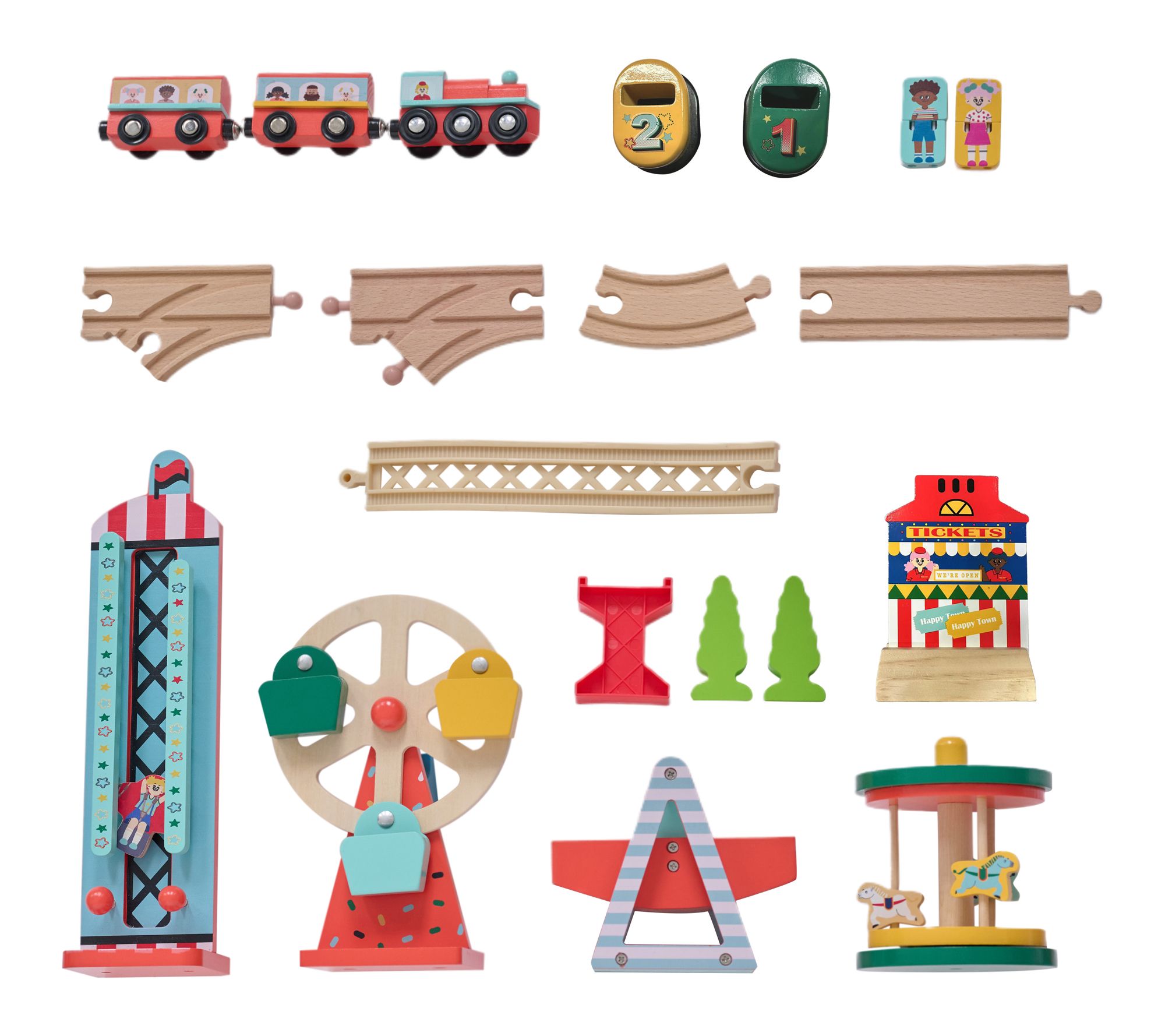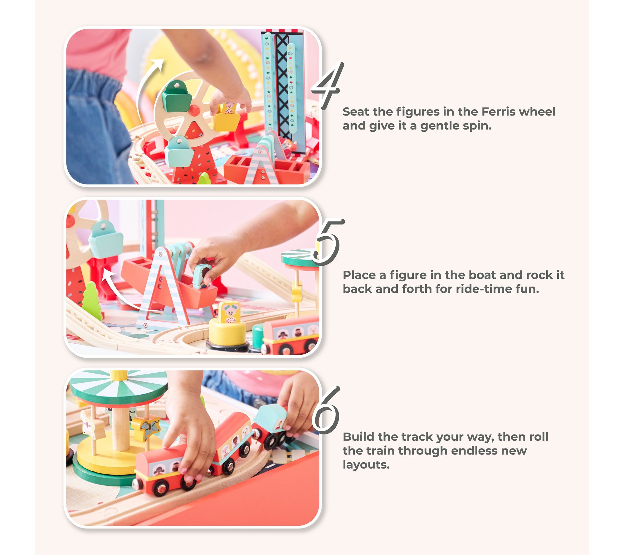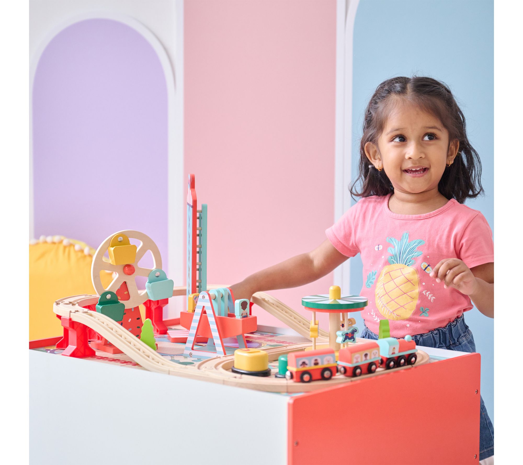 Includes table, train tracks, storage bin, carrousel, bumper cars, boat swing, ferris wheel, and free fall tower