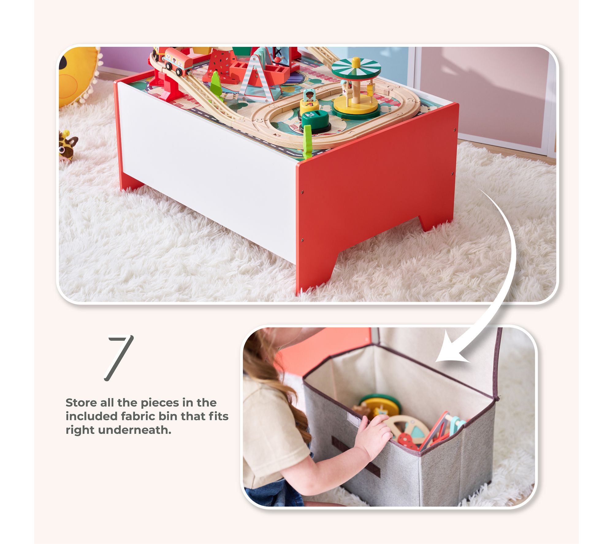 Step right up and bring the excitement of an amusement park to your home with this engaging wooden activity table. Little ones can create their own adventures with real-motion rides, charming wooden figures, and a colorful train that winds around the built-in track -- plus, the customizable layout keeps playtime fresh and imaginative. From Teamson Kids.