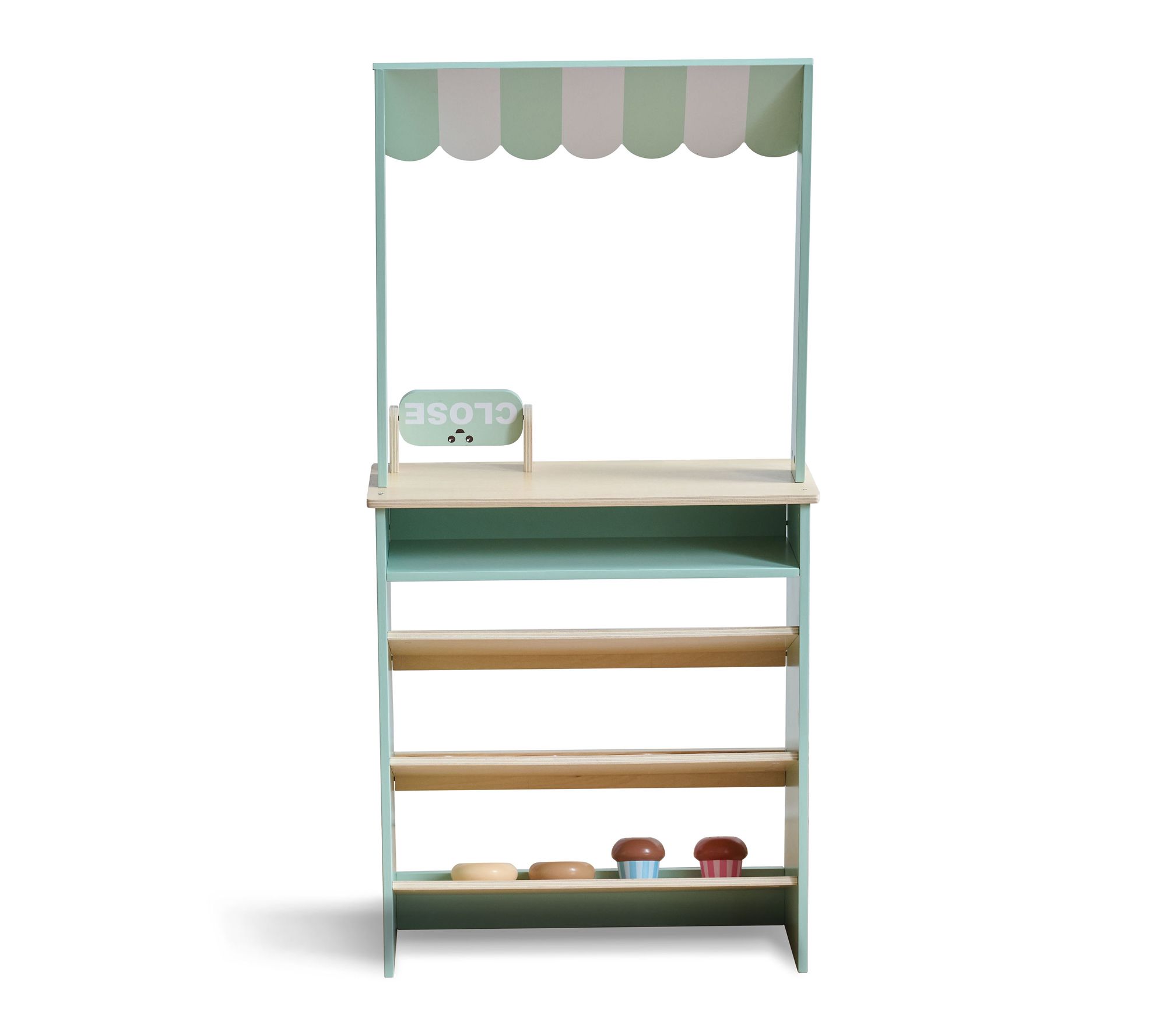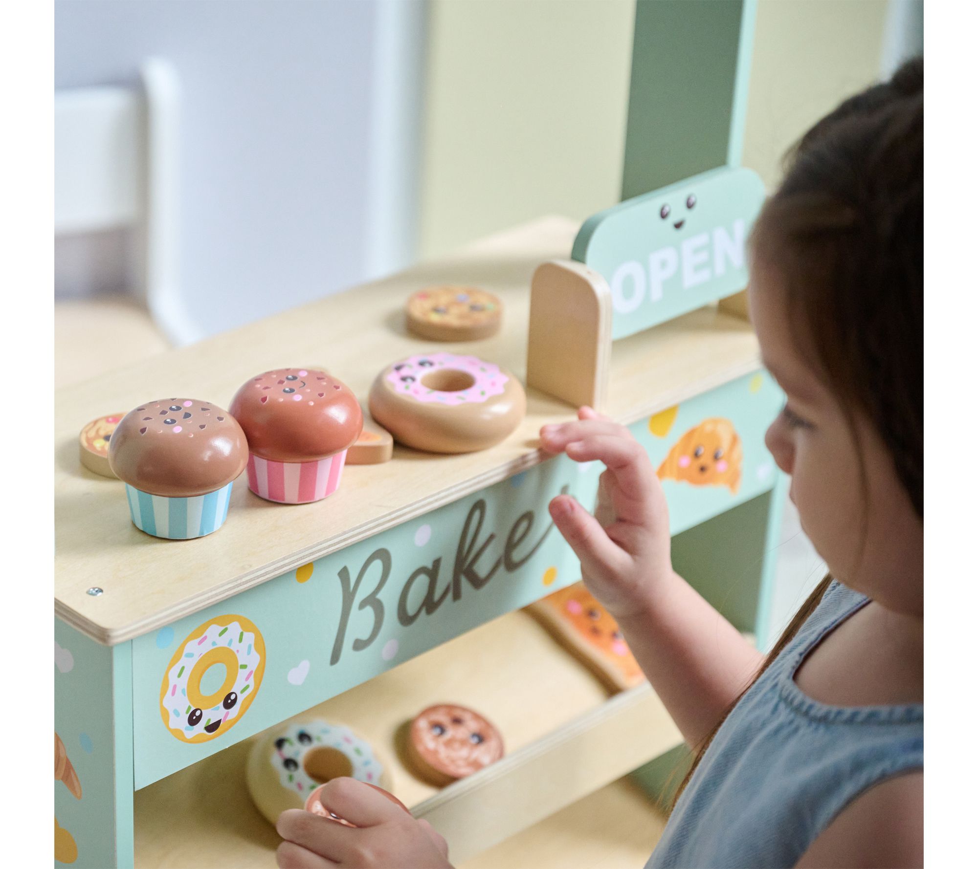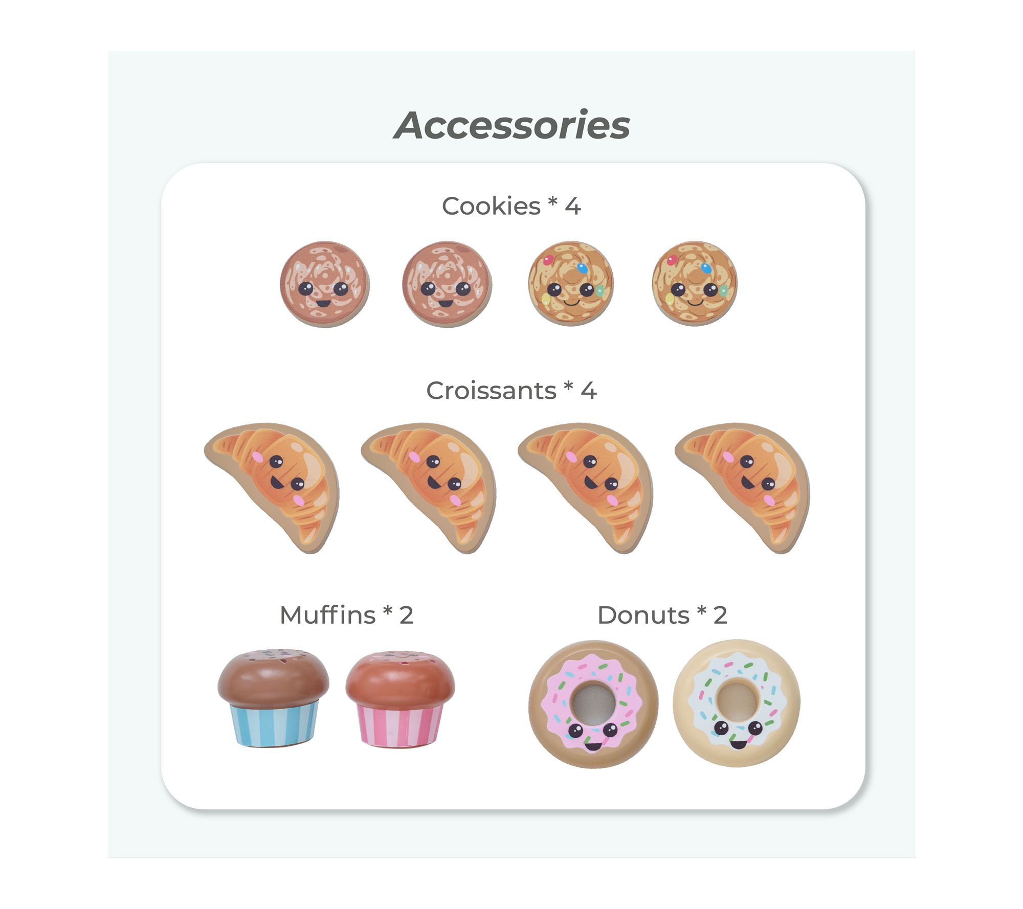 • Includes wooden bakery stand, four cookies, four croissants, two muffins, and two donuts