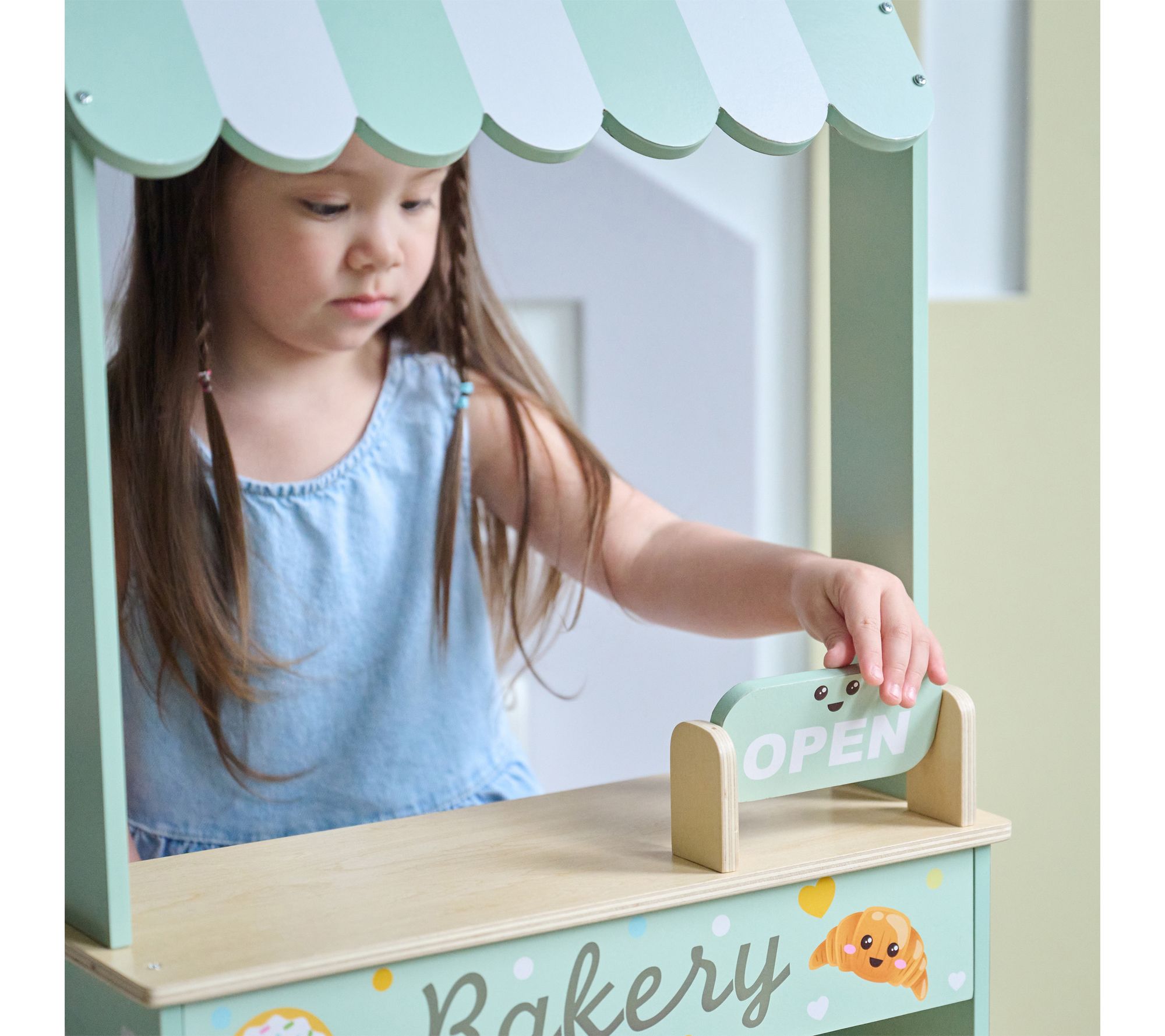 Little ones can step into imaginative play with this wooden bakery stand, featuring shelves for display, a turning sign, and a tempting assortment of pastries. Watch as kids create their own storefront, serve up treats, and build social skills while sharing delicious moments with friends or family. From Teamson Kids.