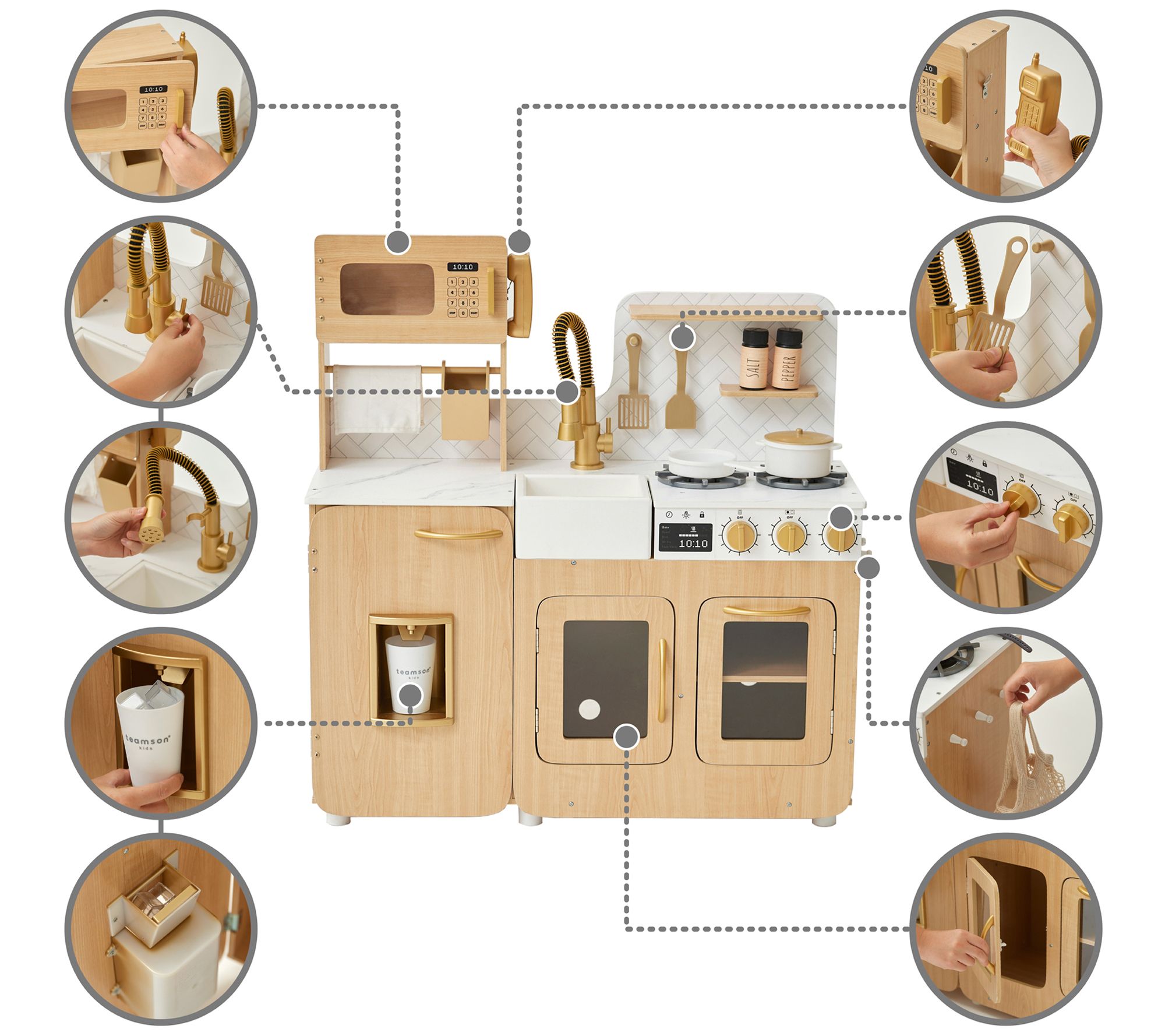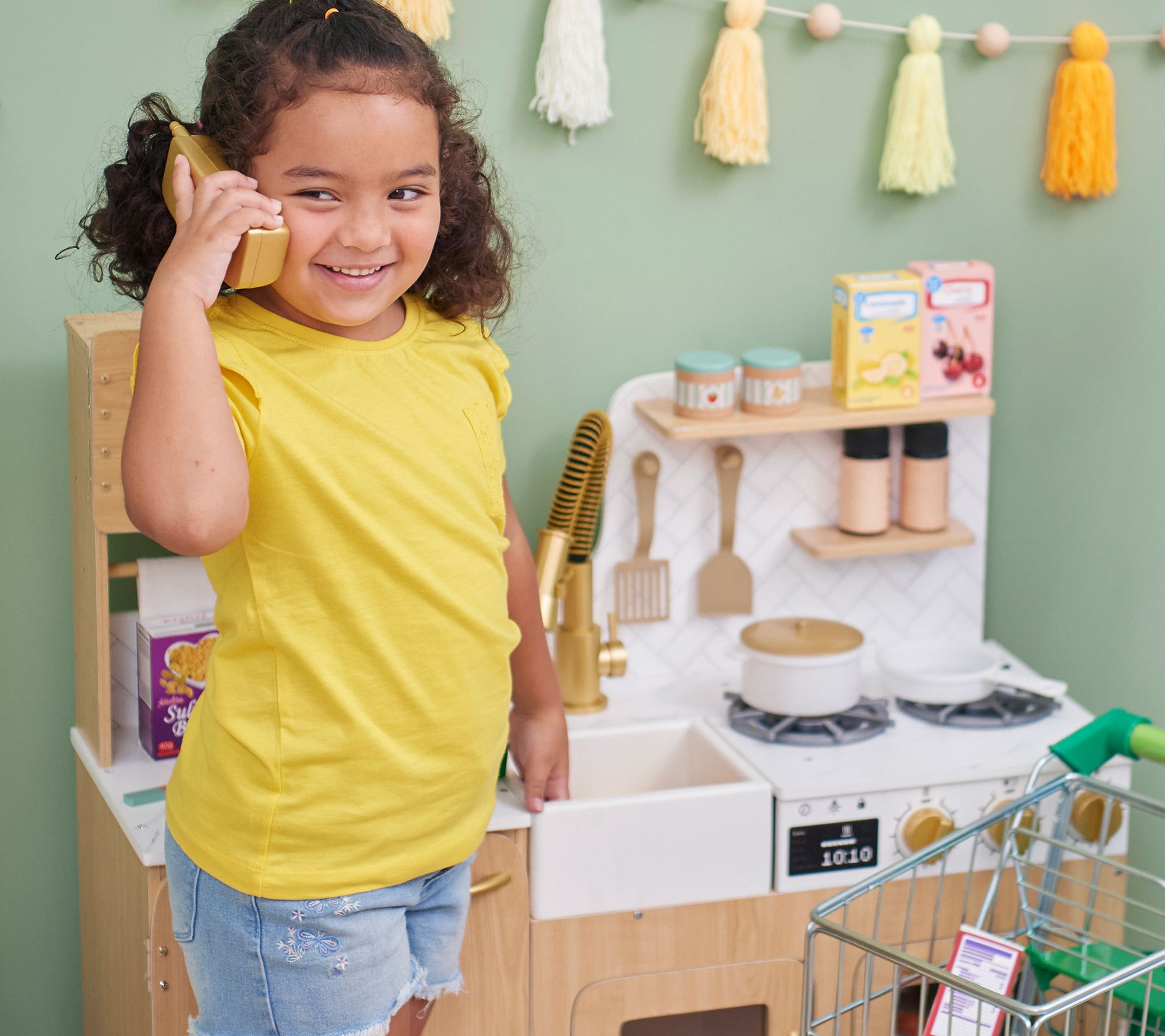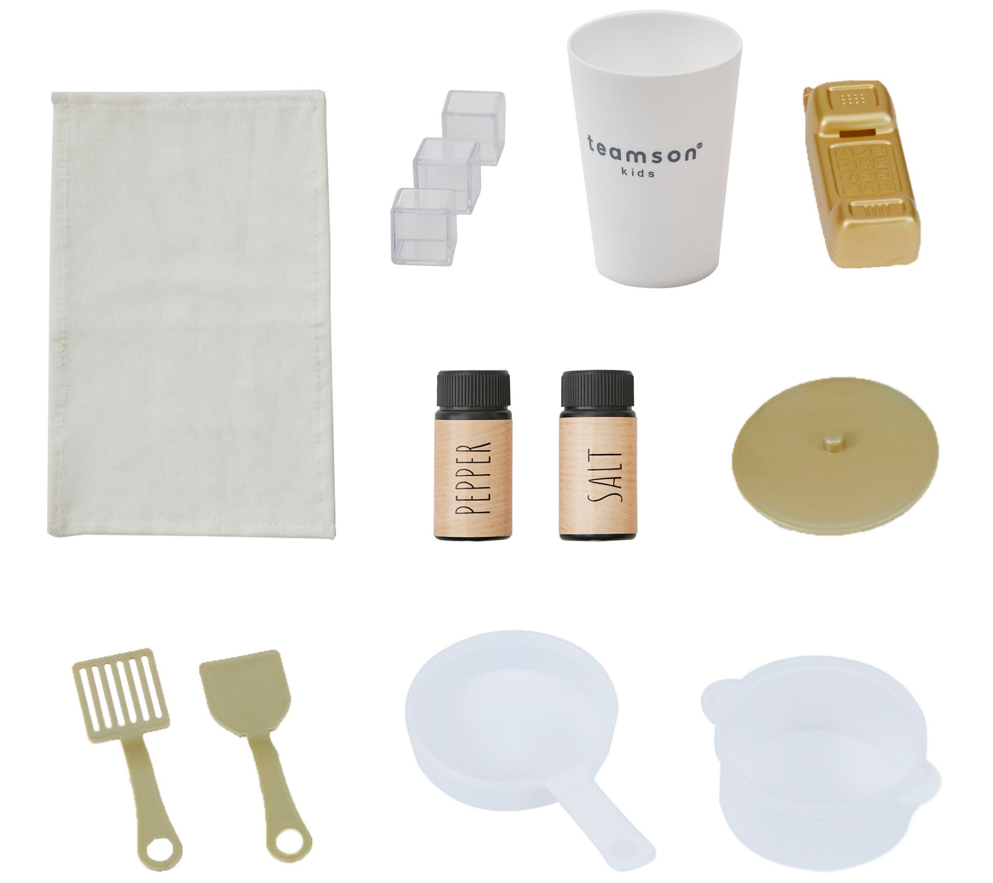 • Includes play kitchen with toy phone, two spatulas, pot, pan, lid, two seasoning bottles, cup, three pretend ice cubes, mini hand towel, and utensil box