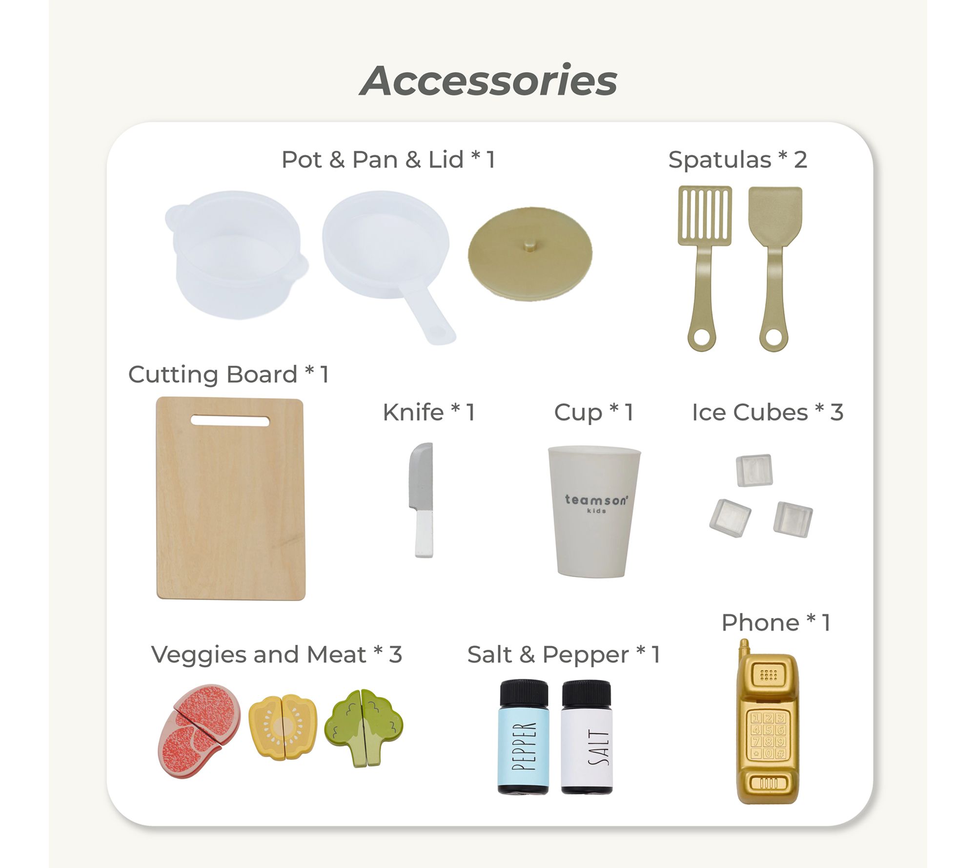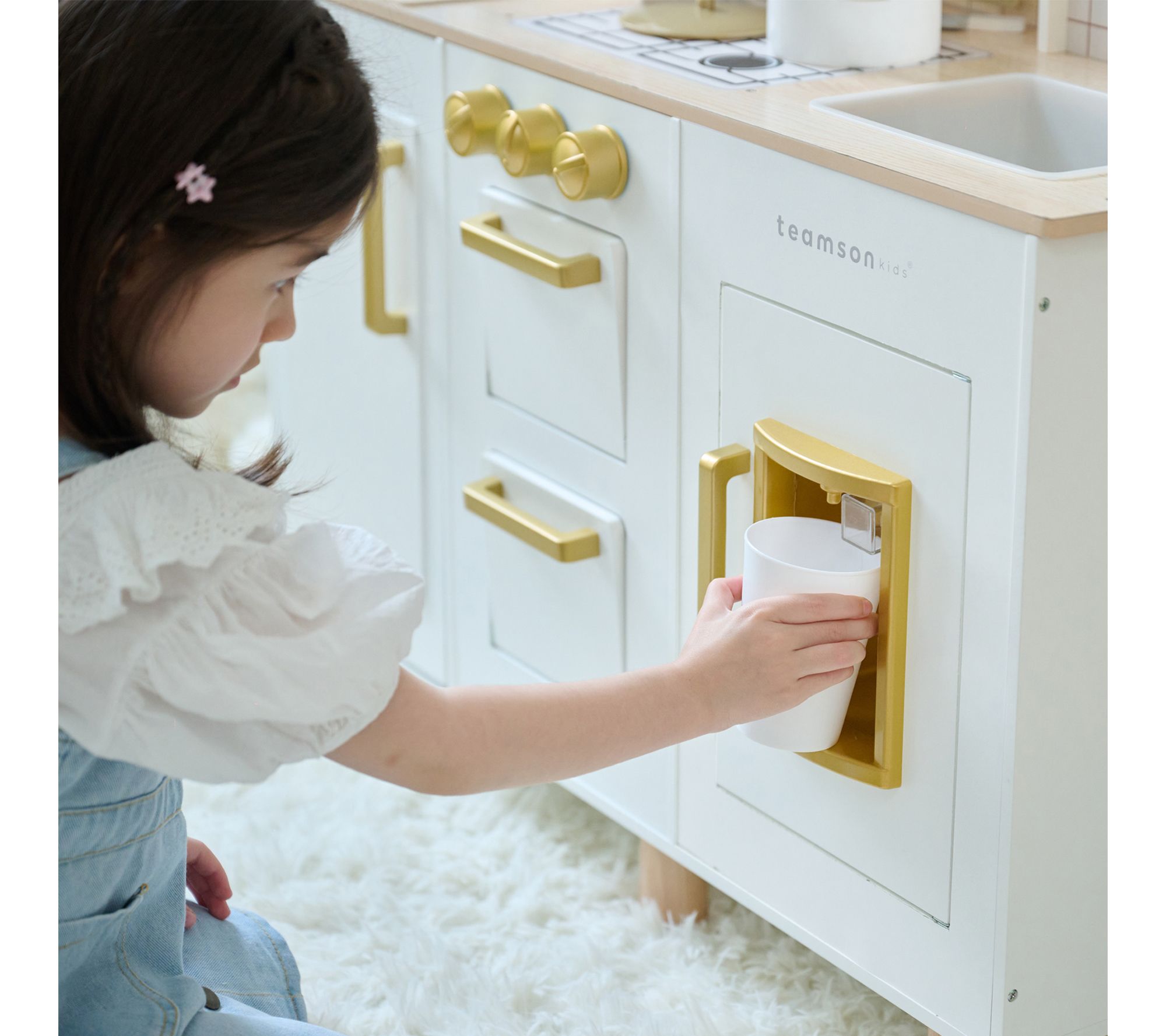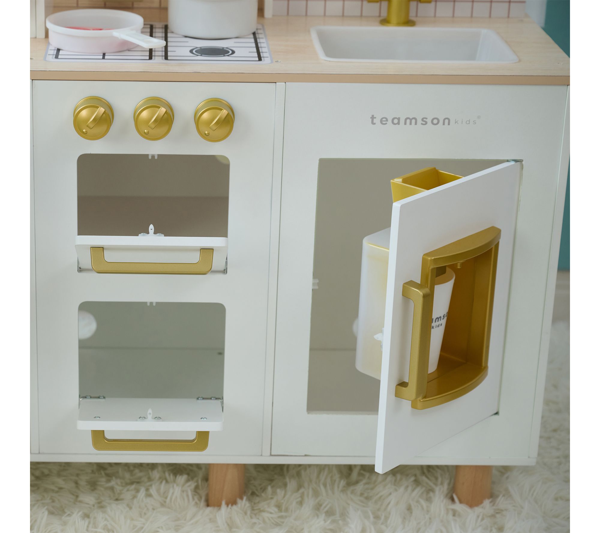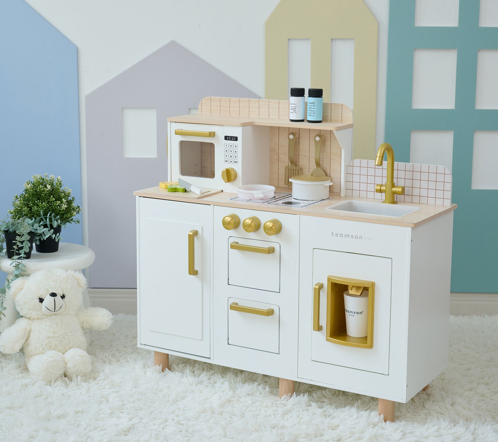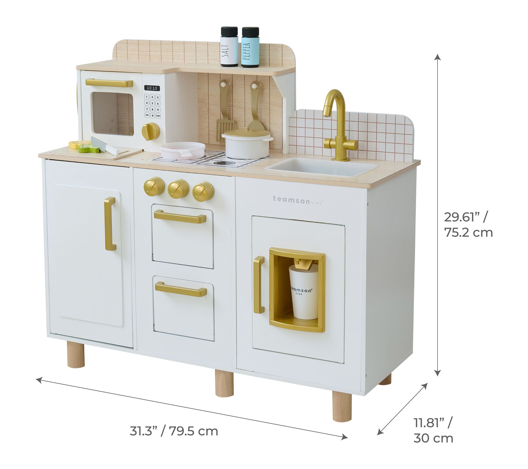 Whether it's hosting a make-believe dinner party or whipping up imaginary treats, this wooden play kitchen sparks hours of creative role play. Thoughtful details like turning knobs and storage shelves invite kids to explore, learn, and pretend, adding extra joy to playtime. From Teamson Kids.