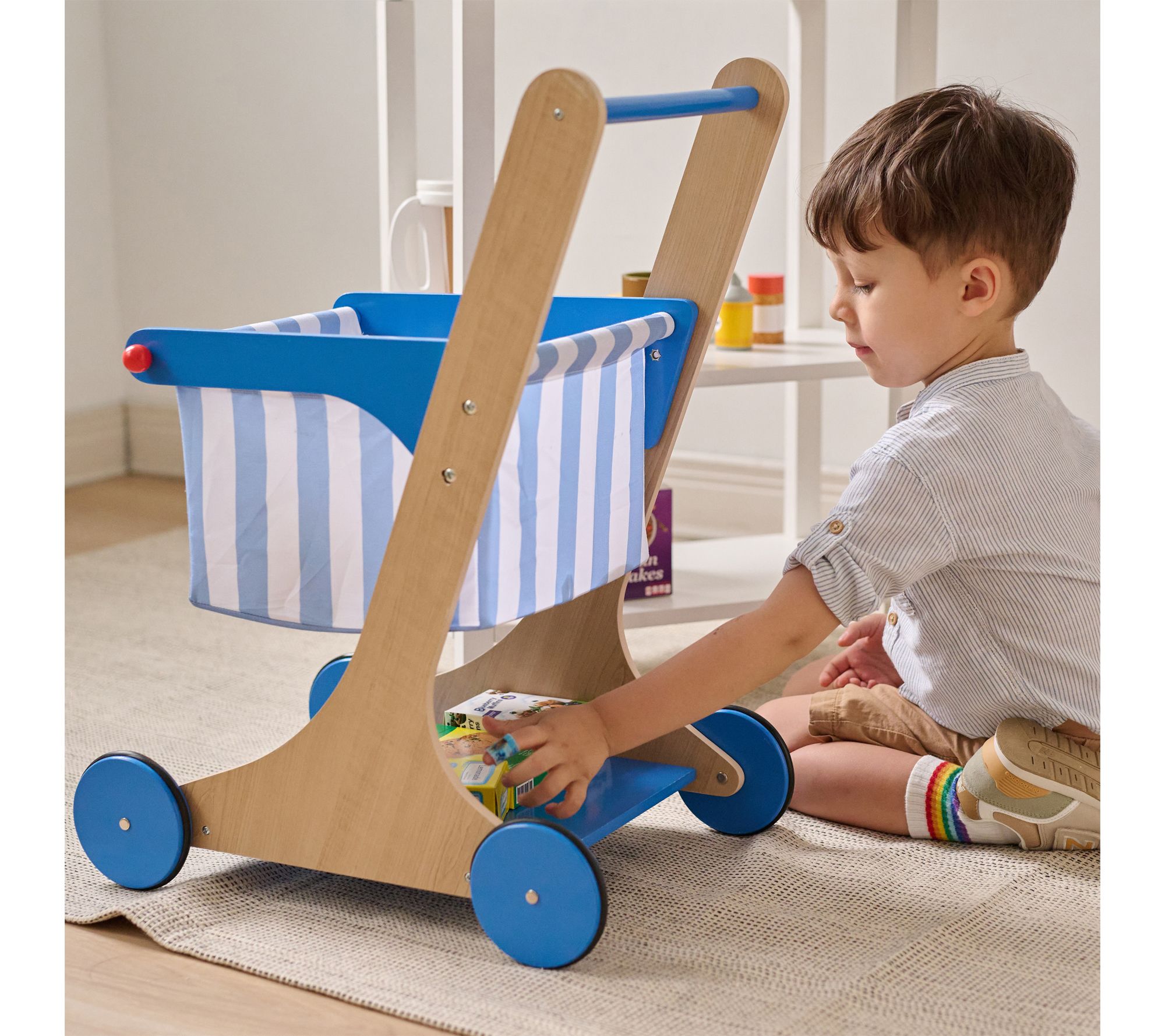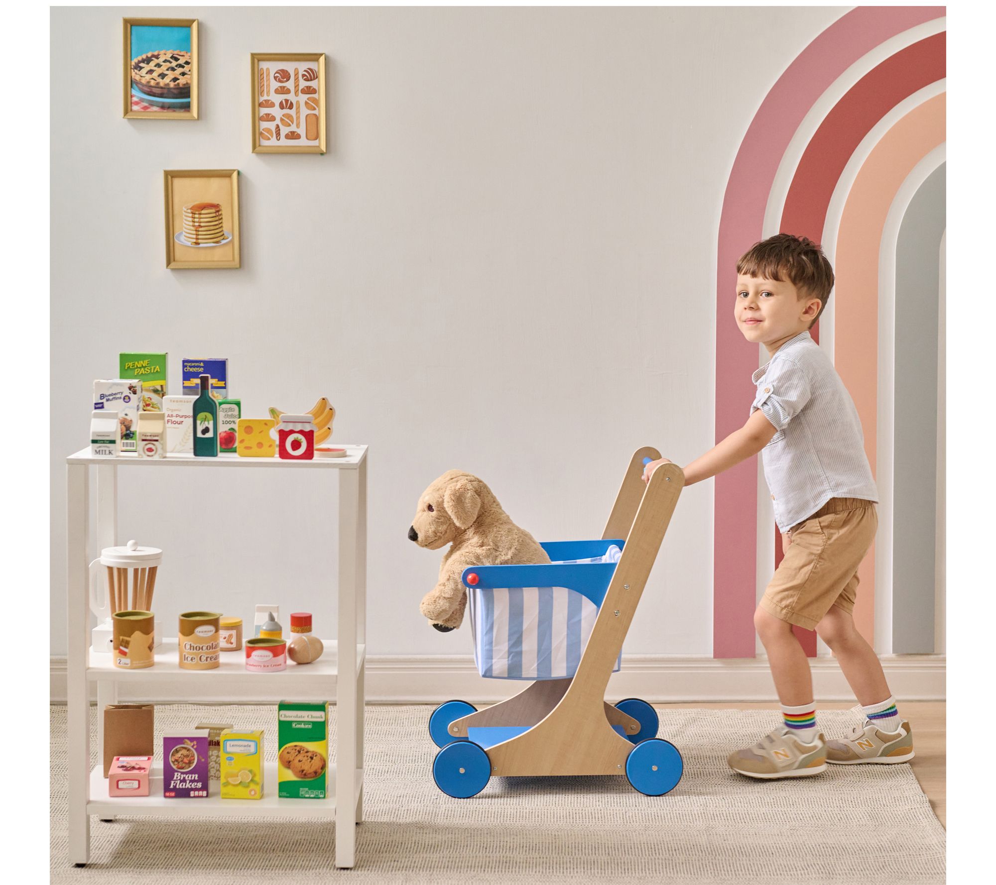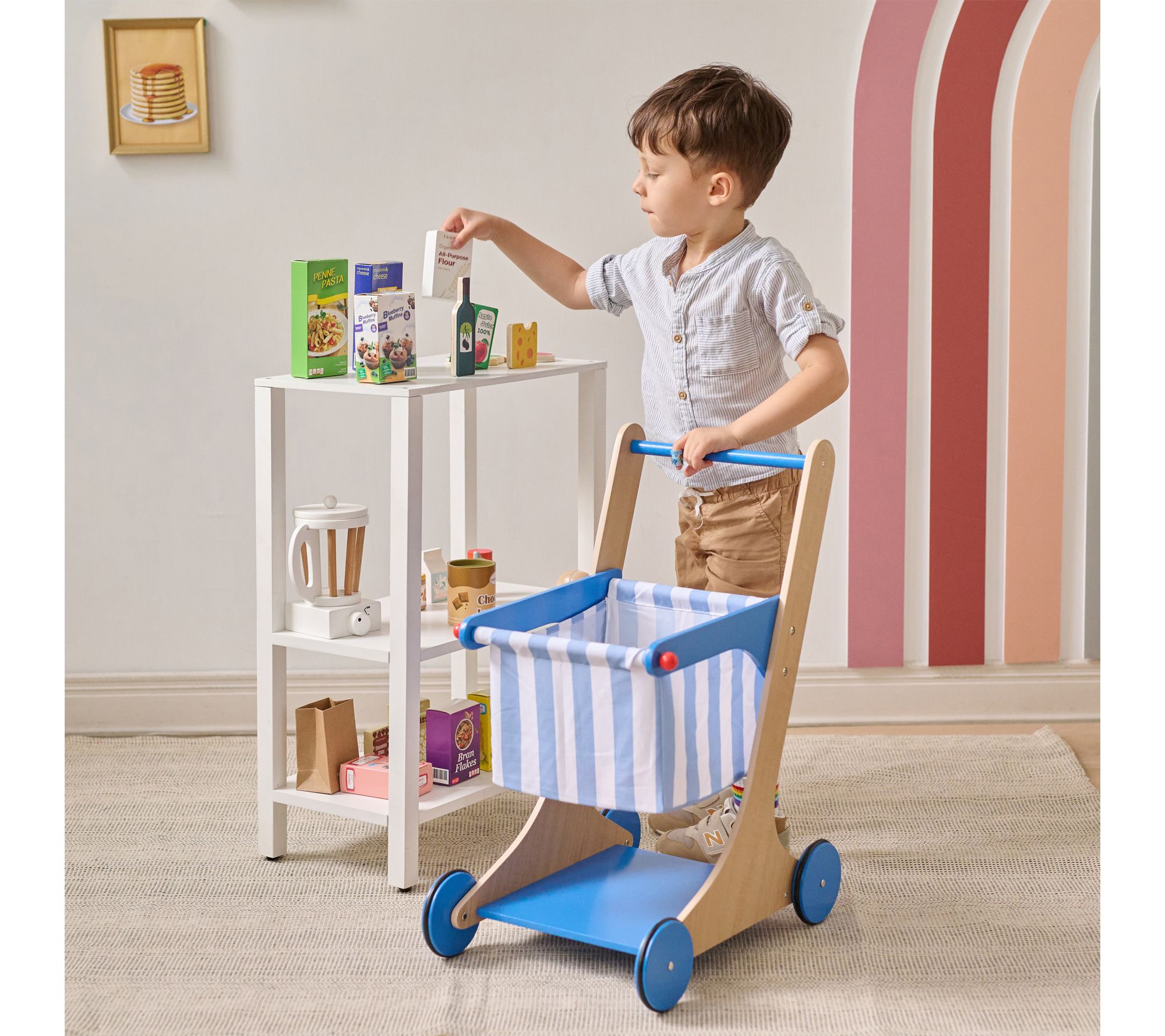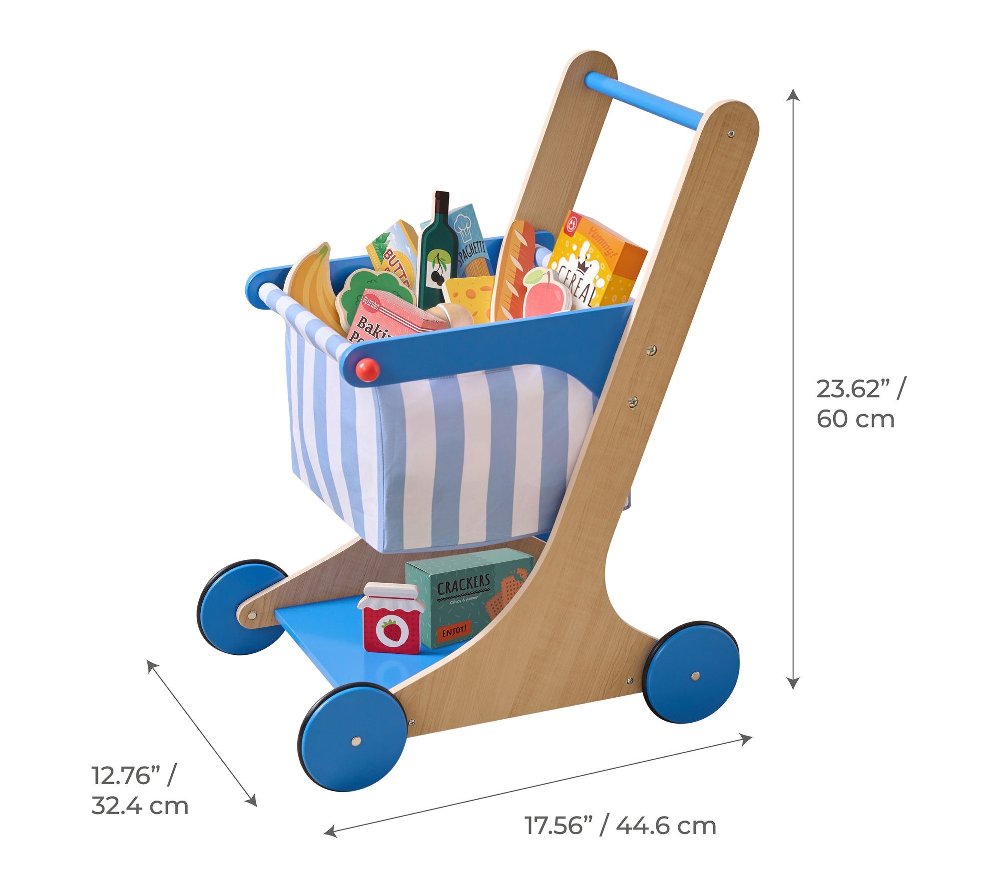 Little shoppers will love bringing home their own groceries with this engaging wooden shopping cart set. Outfitted with soft wheels and a sturdy design, it's easy for early walkers to push along as they fill the cart with colorful play groceries. Encouraging active role play and creativity, this set helps build confidence and imagination during every trip to their pretend store. From Teamson Kids.