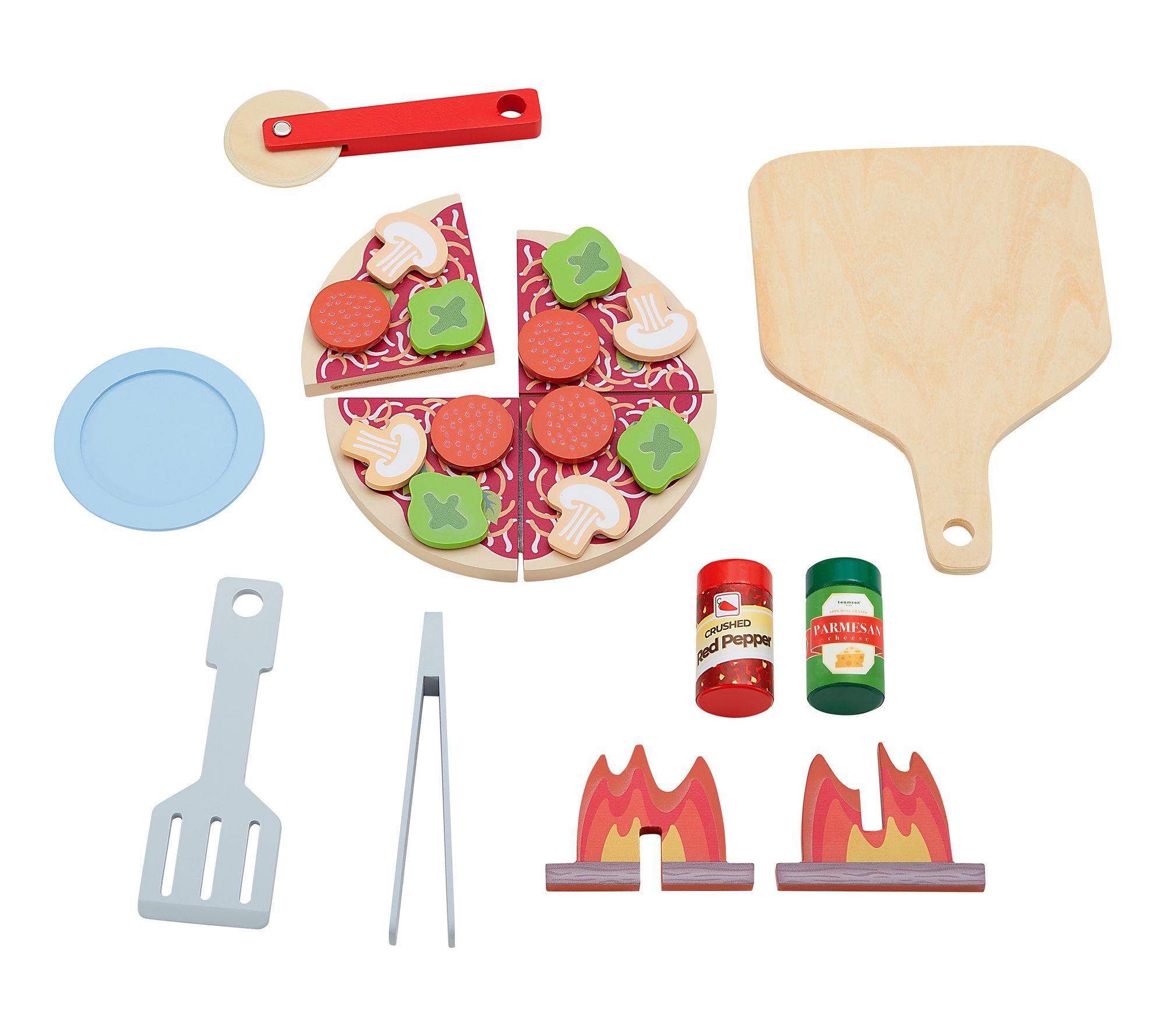• Includes oven, pizza board, spatula, pizza cutter, tongs, three toppings, red pepper shaker, and parmesan cheese shaker