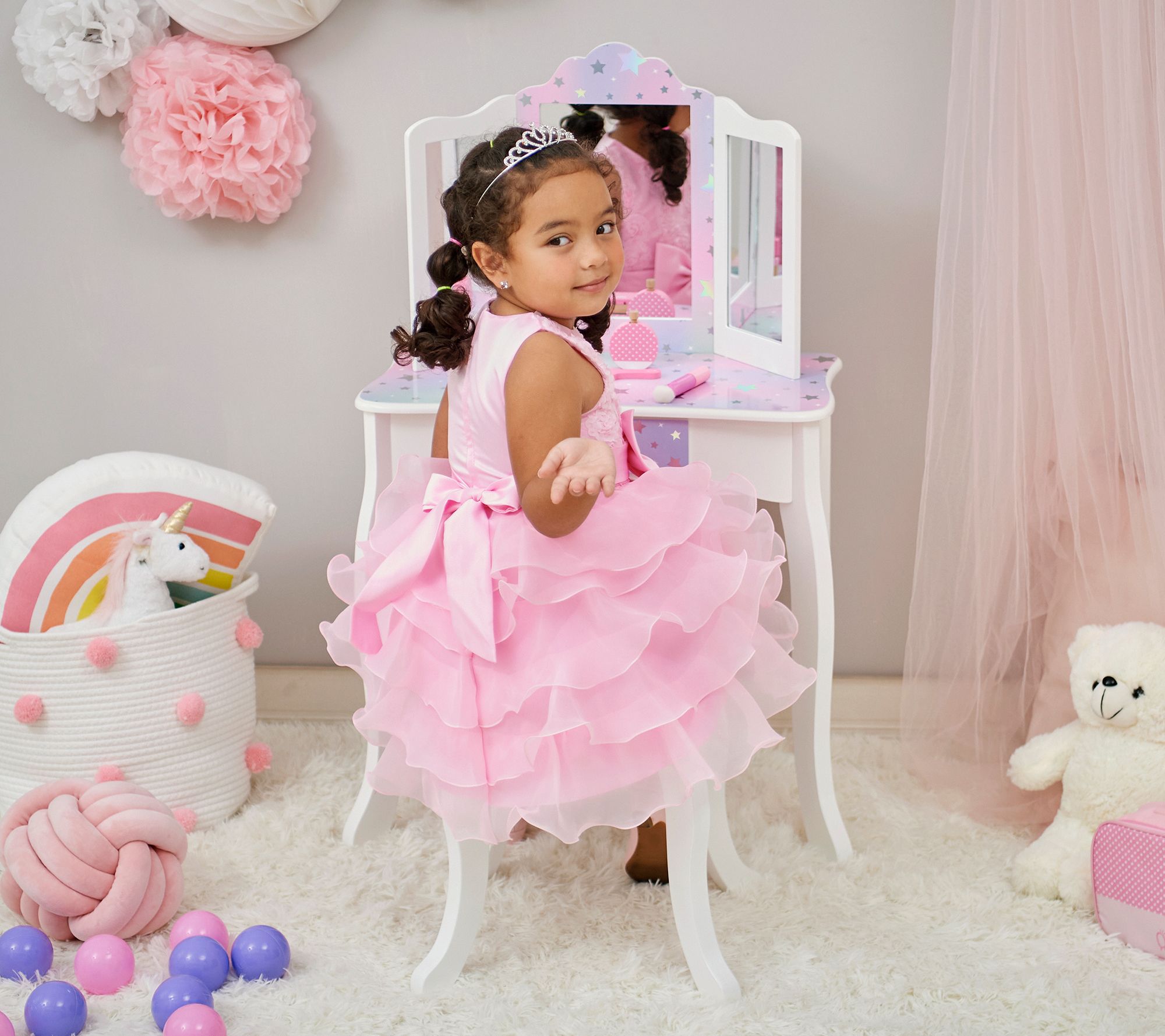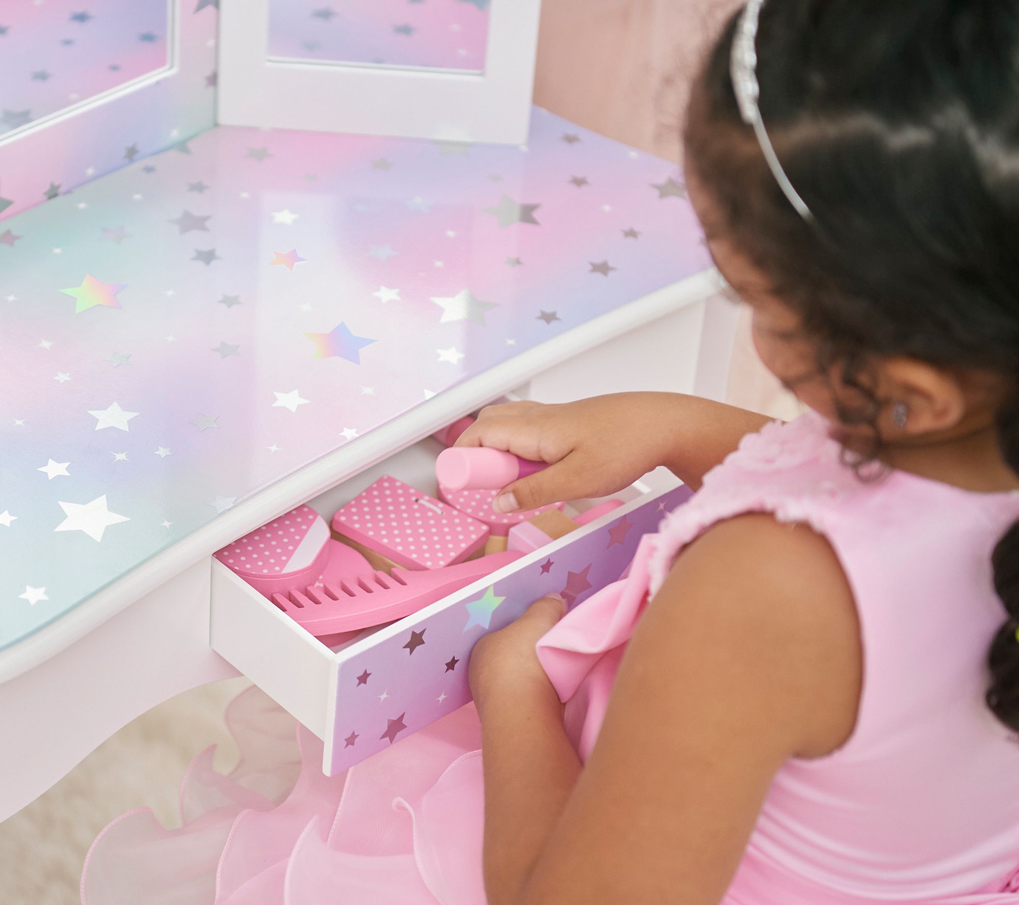 Perfect for playing dress up or getting ready for school, this play vanity with matching stool features a shimmering iridescent print, a glam silhouette, and a petite center drawer for toys and accessories. From Teamson Kids.