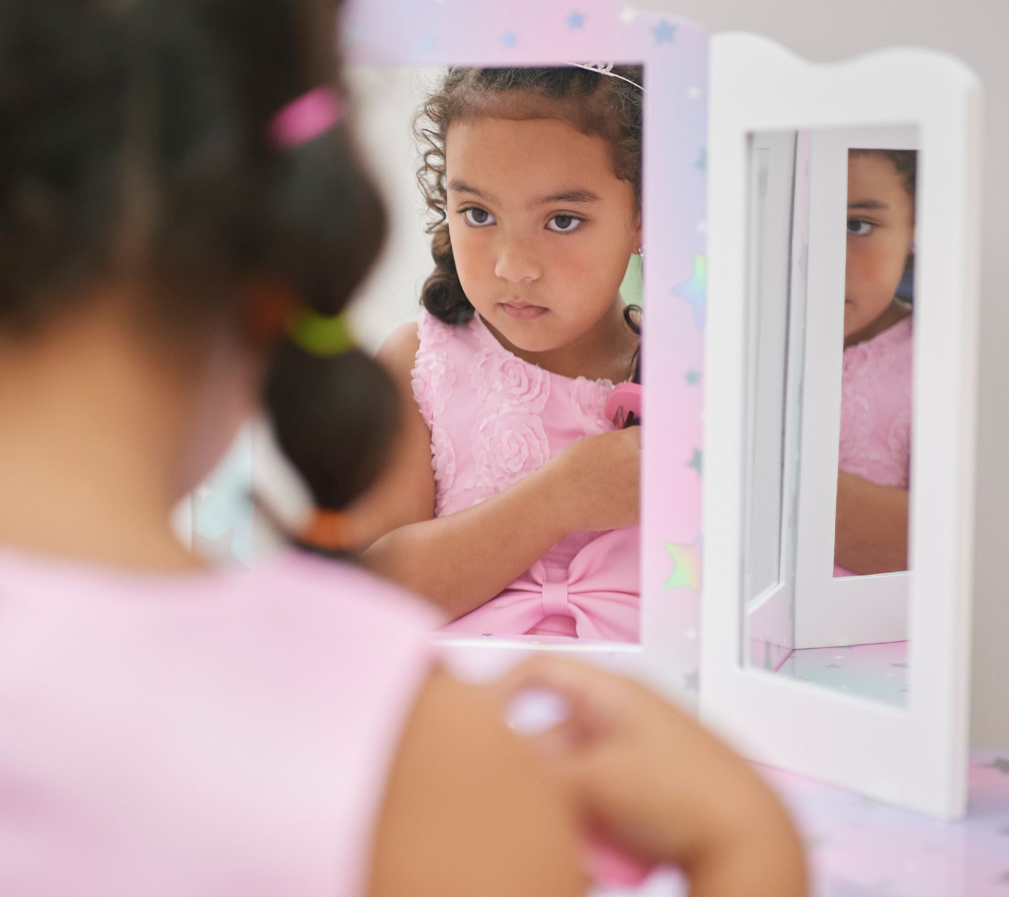 • Includes trifold mirror table with matching vanity stool