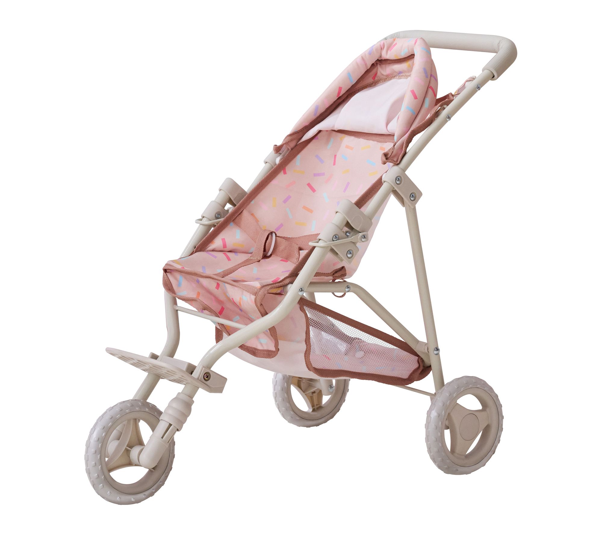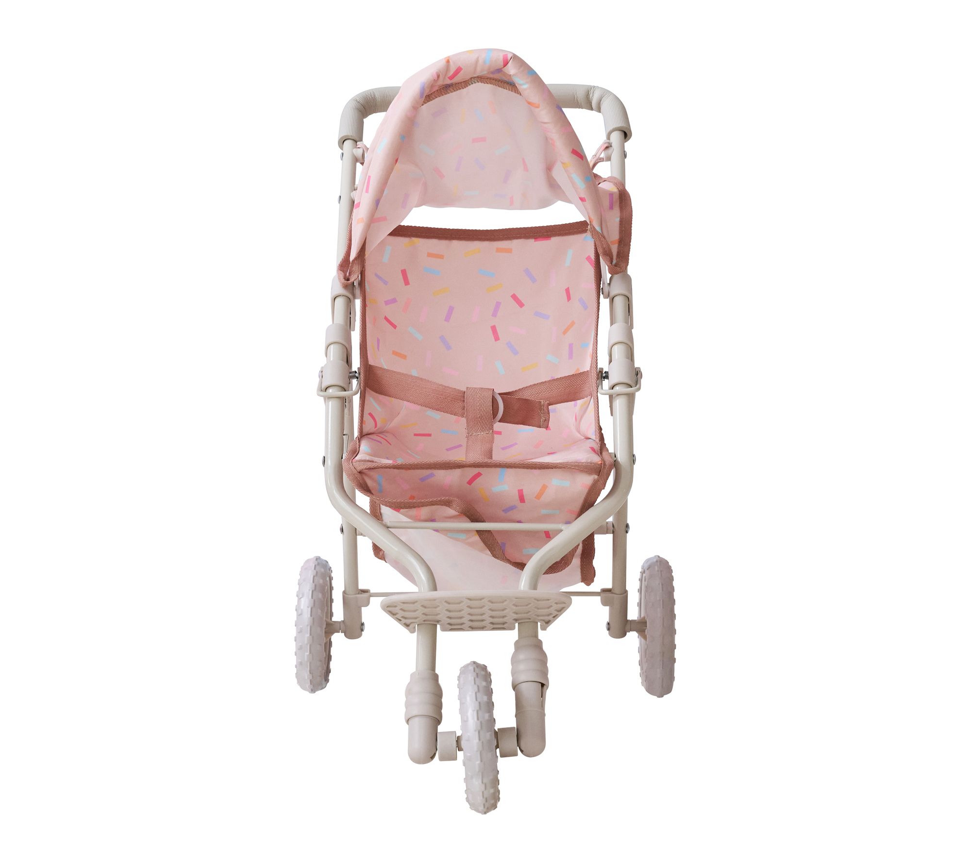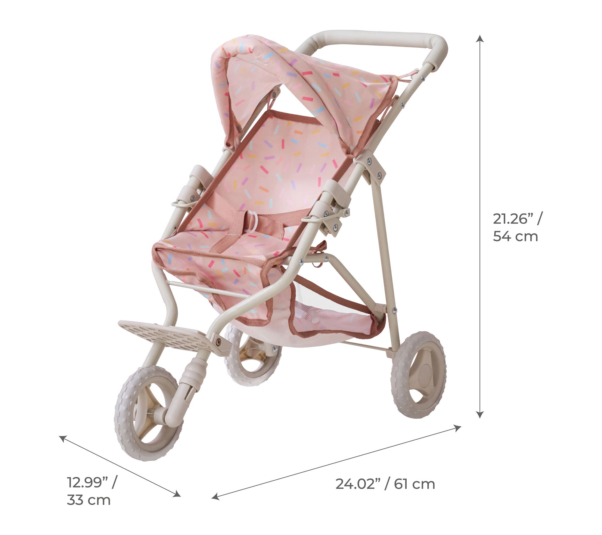 Exciting adventures in the park or playroom are easy to create with this doll jogging stroller. Featuring a rainbow confetti design, retractable canopy, padded handle, and textured wheels, it brings a playful touch for little ones to care for their dolls and encourage nurturing, screen-free play. Fits 15" and 18" dolls and folds flat for convenient storage. From Teamson Kids.