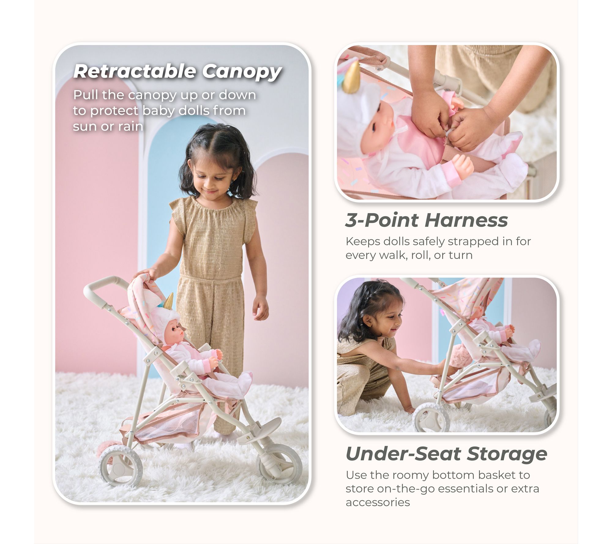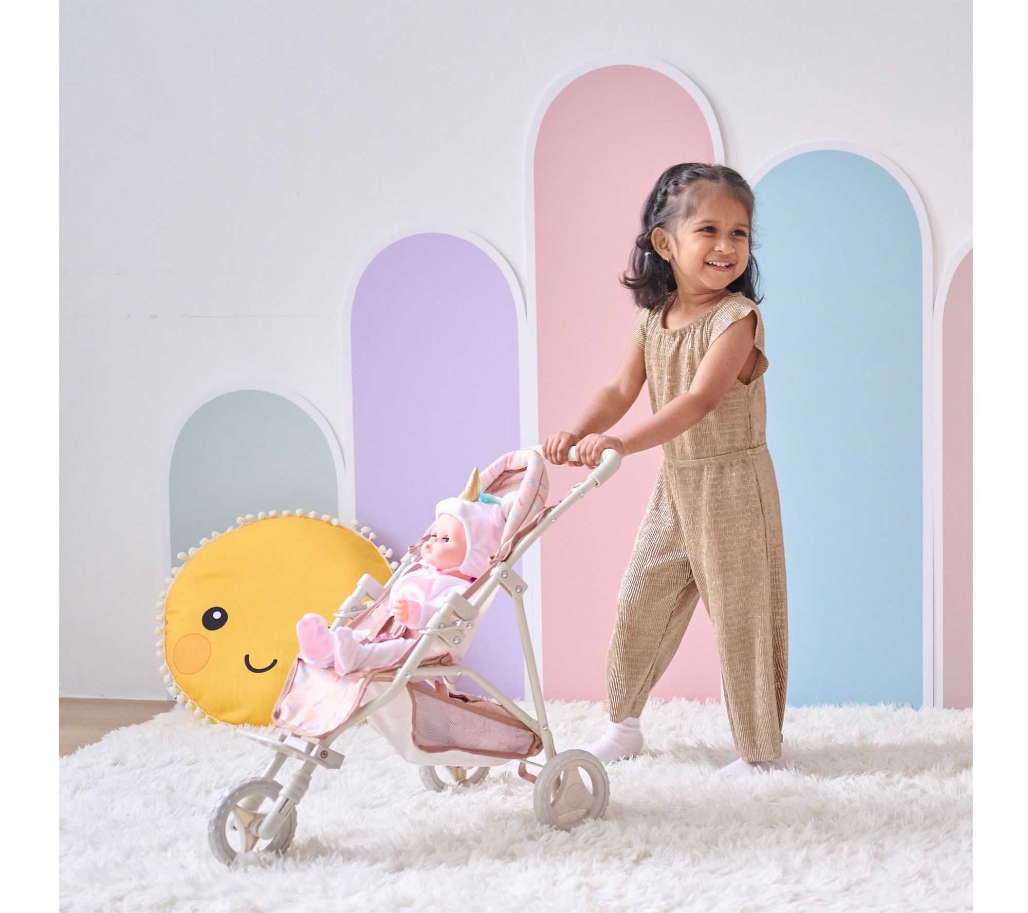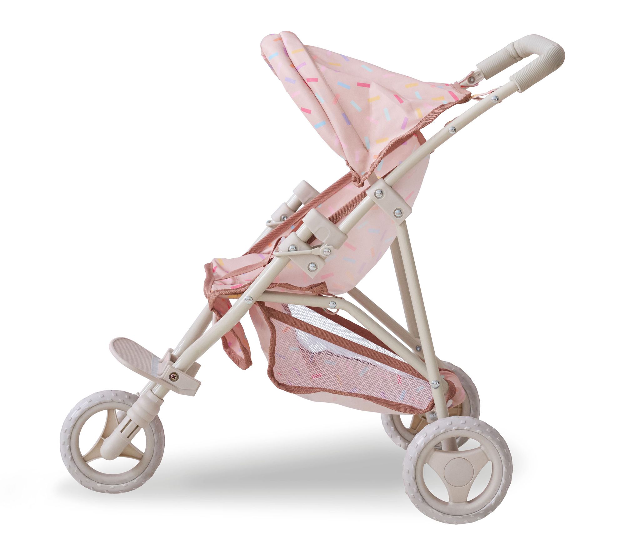 Exciting adventures in the park or playroom are easy to create with this doll jogging stroller. Featuring a rainbow confetti design, retractable canopy, padded handle, and textured wheels, it brings a playful touch for little ones to care for their dolls and encourage nurturing, screen-free play. Fits 15" and 18" dolls and folds flat for convenient storage. From Teamson Kids.