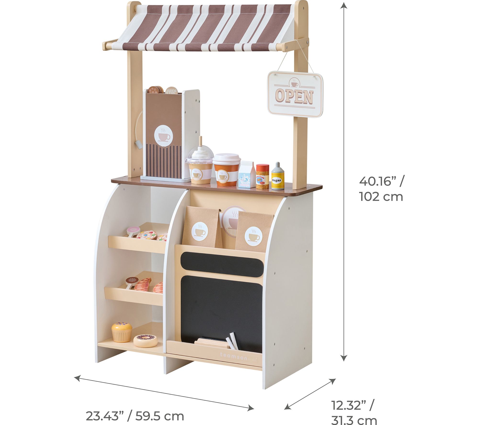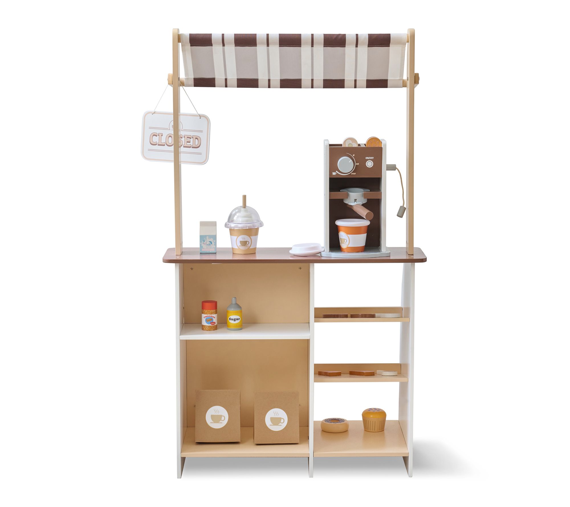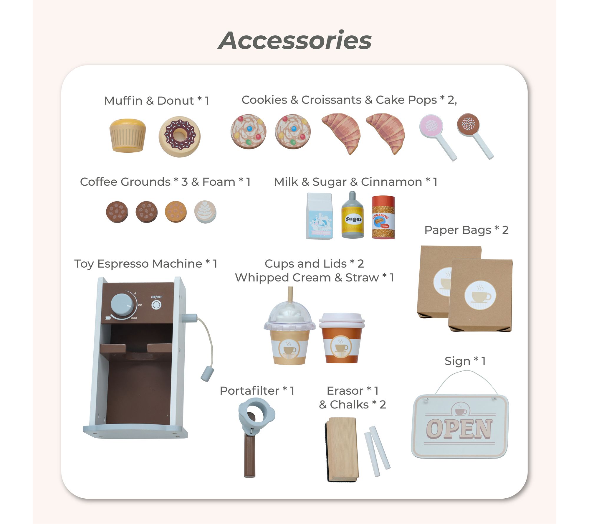 Includes wooden coffee stand, toy espresso machine, sign, muffin, donut, 2 cookies, 2 croissants, 2 cake pops, 3 coffee grounds, foam, milk, sugar, cinnamon, 2 cups, straw, 2 paper bags, portafilter, eraser, 2 pieces of chalk