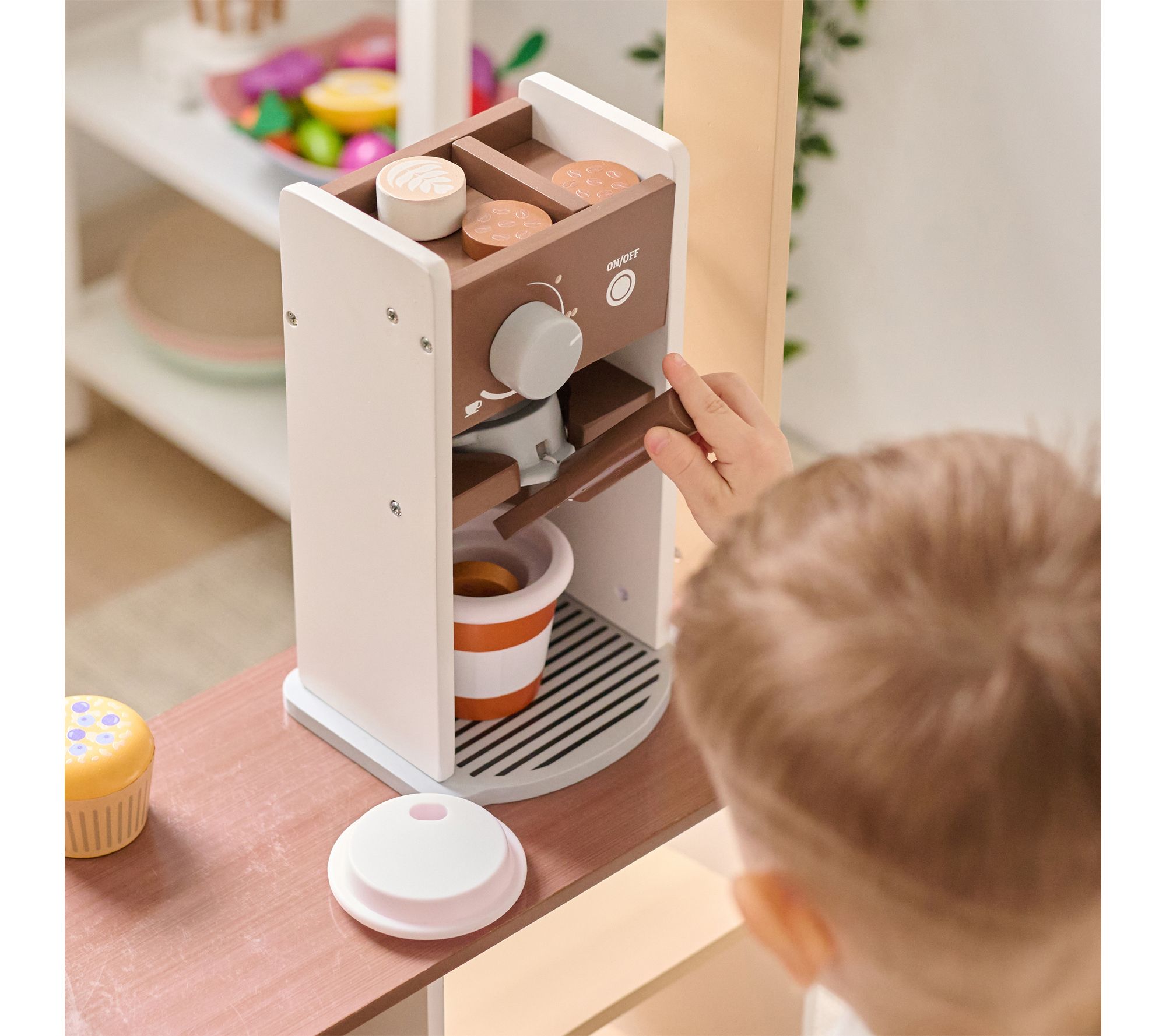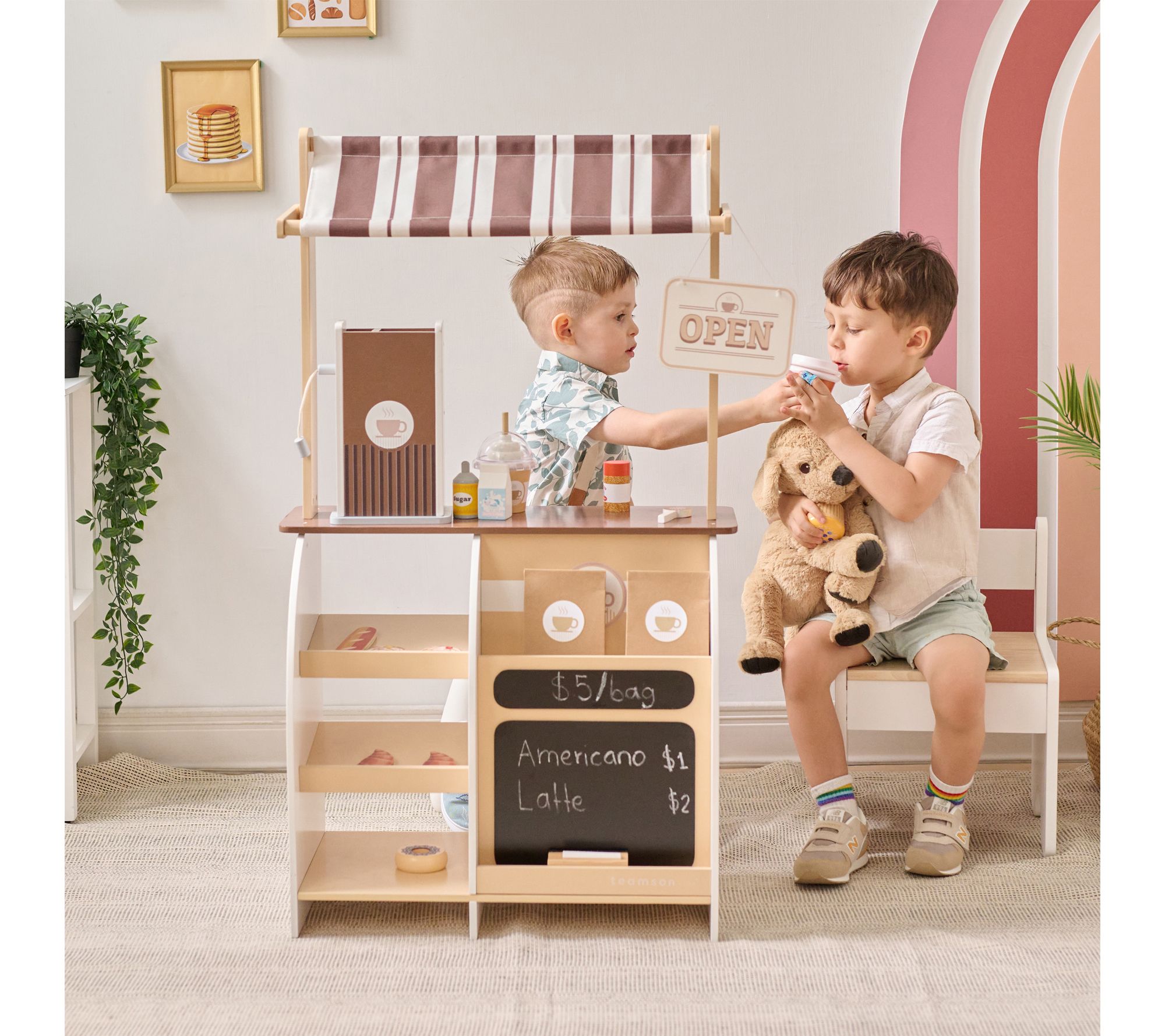 Little ones can step into the role of barista with this wooden coffee stand, complete with a toy espresso machine, desserts, and all the accessories needed for hours of imaginative cafe play. Watch them brew, serve, and create their own coffee shop adventures while building important social and motor skills through interactive, screen-free fun. From Teamson Kids.