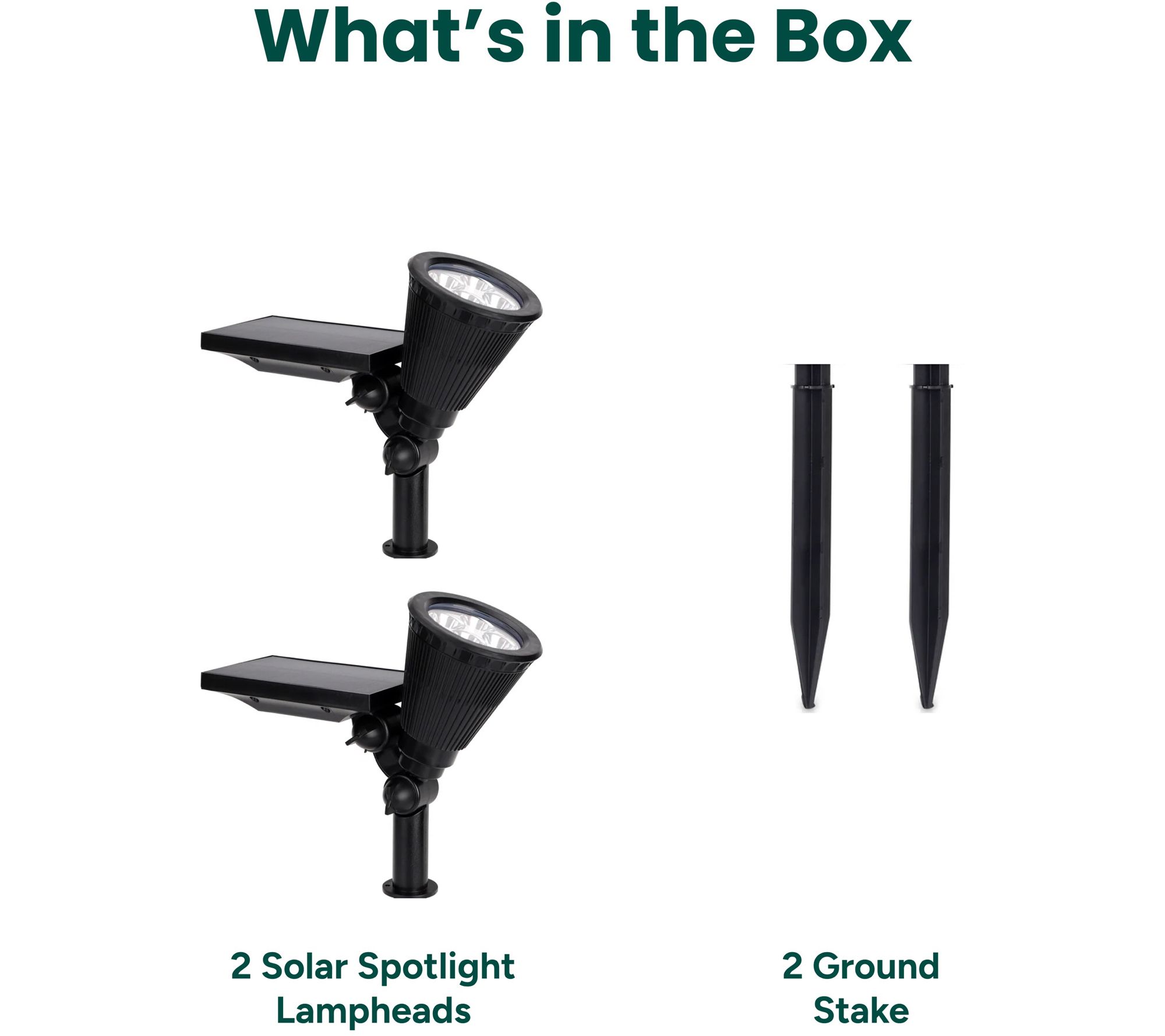 • Includes two solar spotlights, two sets of hardware, two stakes, and manual