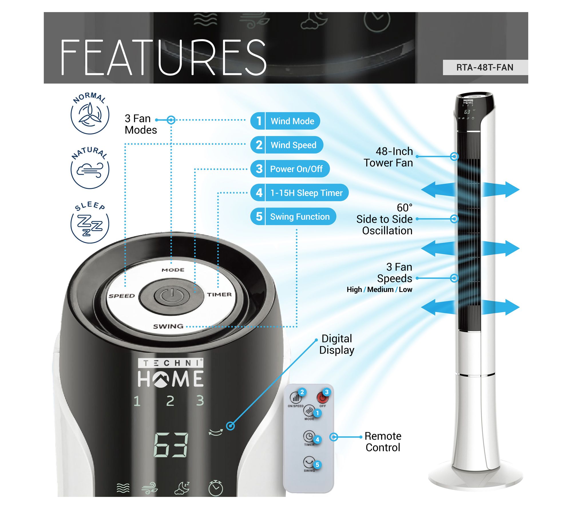 Techni Home 48" Tower Fan 3 Wind Speeds W/Remote Control
