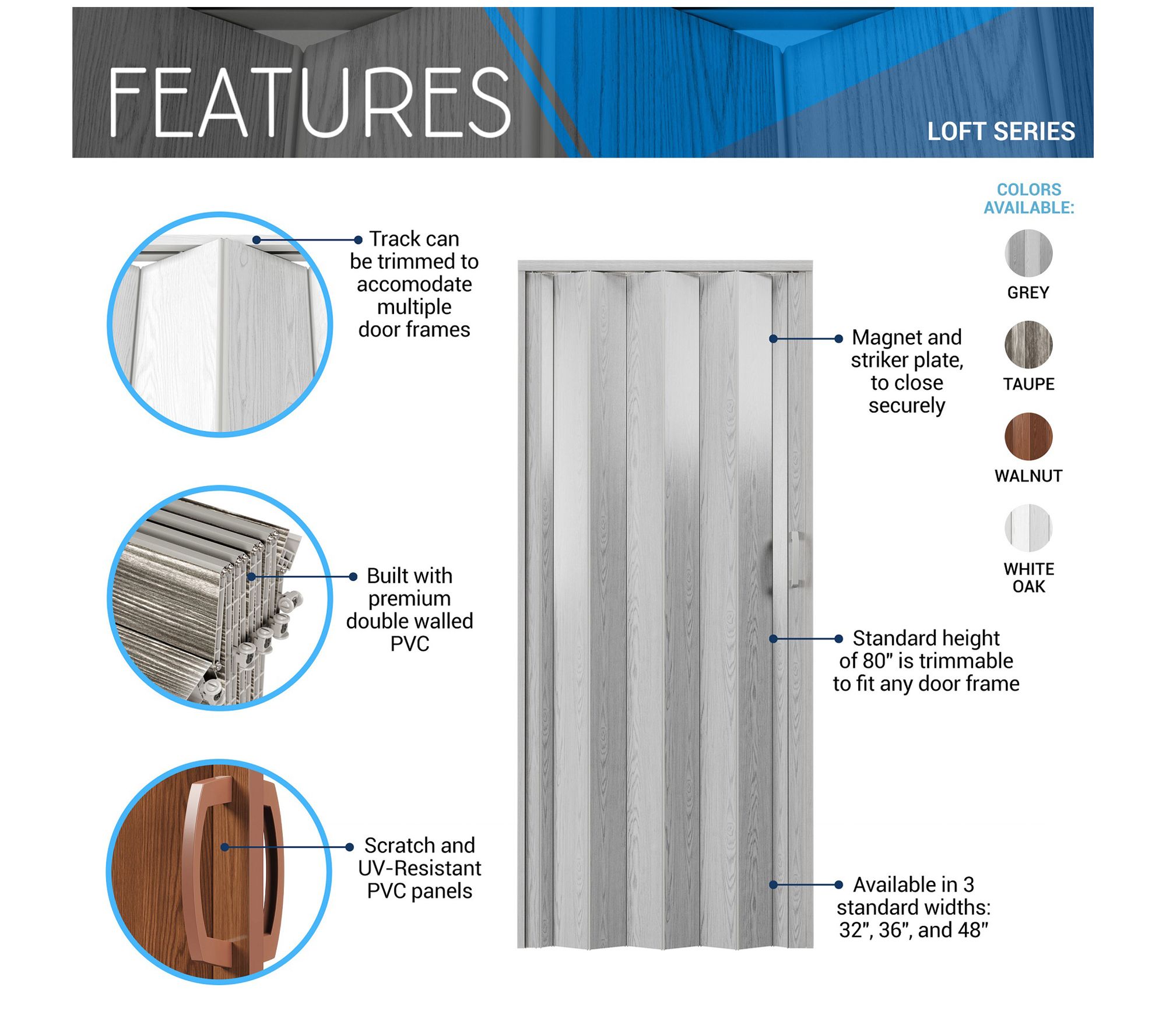 Transform any space with the Techni Home Loft Series double-walled accordion door. Crafted from scratch-resistant PVC, this door is perfect for living rooms, bedrooms, or office interiors. The flexible design allows it to be trimmed to fit any door frame, providing ultimate versatility. From Techni Home.